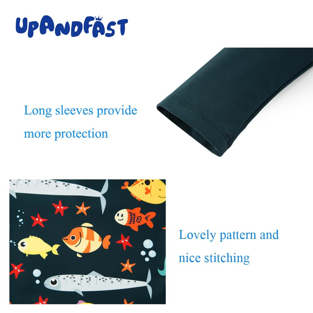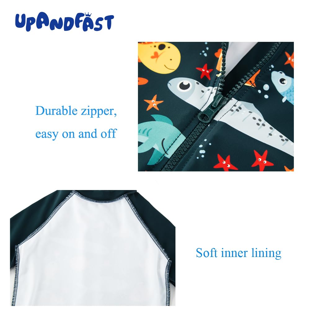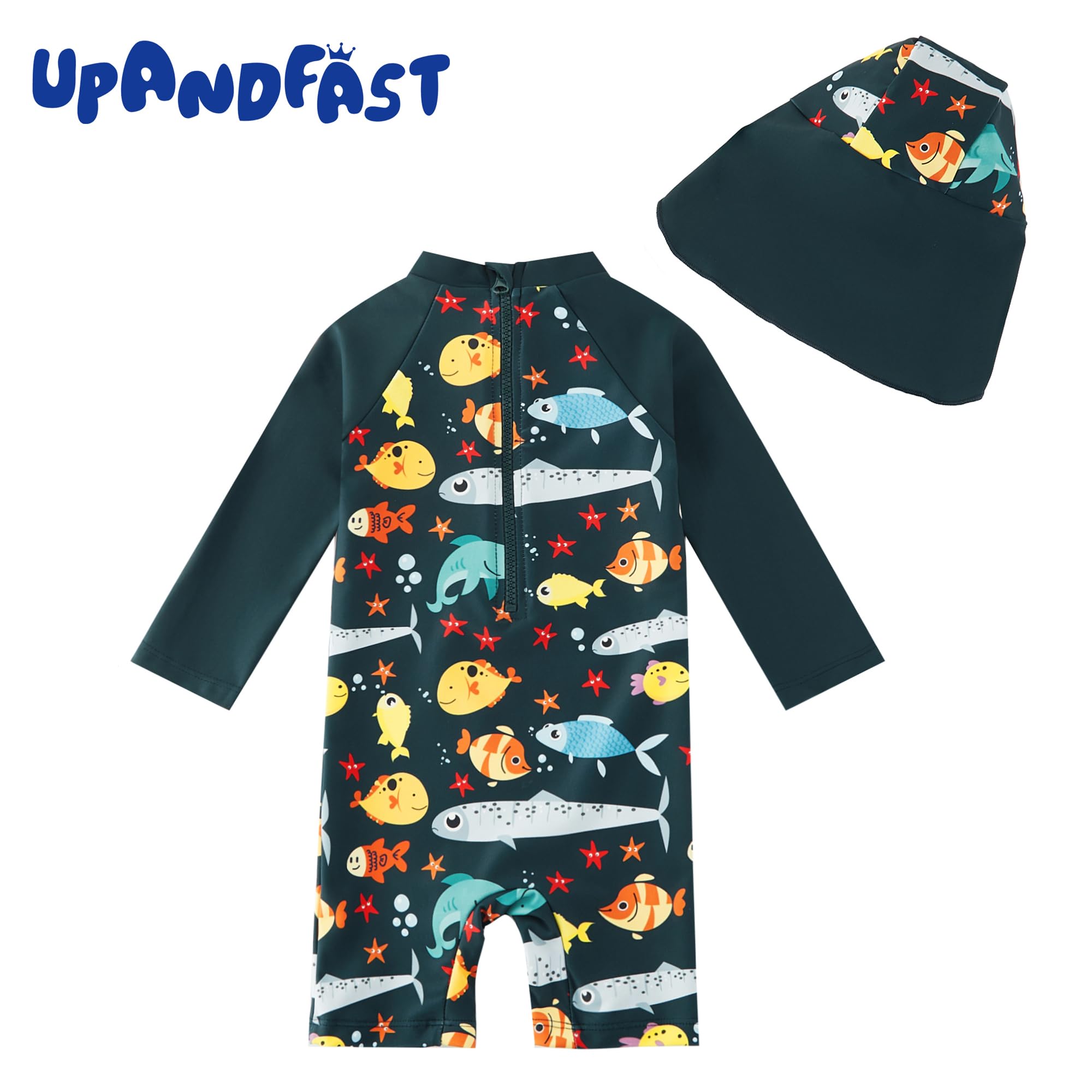 HUMANIZATION DESIGN: This one-piece baby bathing suit has a front / back zip for convenient putting on and taking off. Zipper flap and garage protect your baby's delicate skin