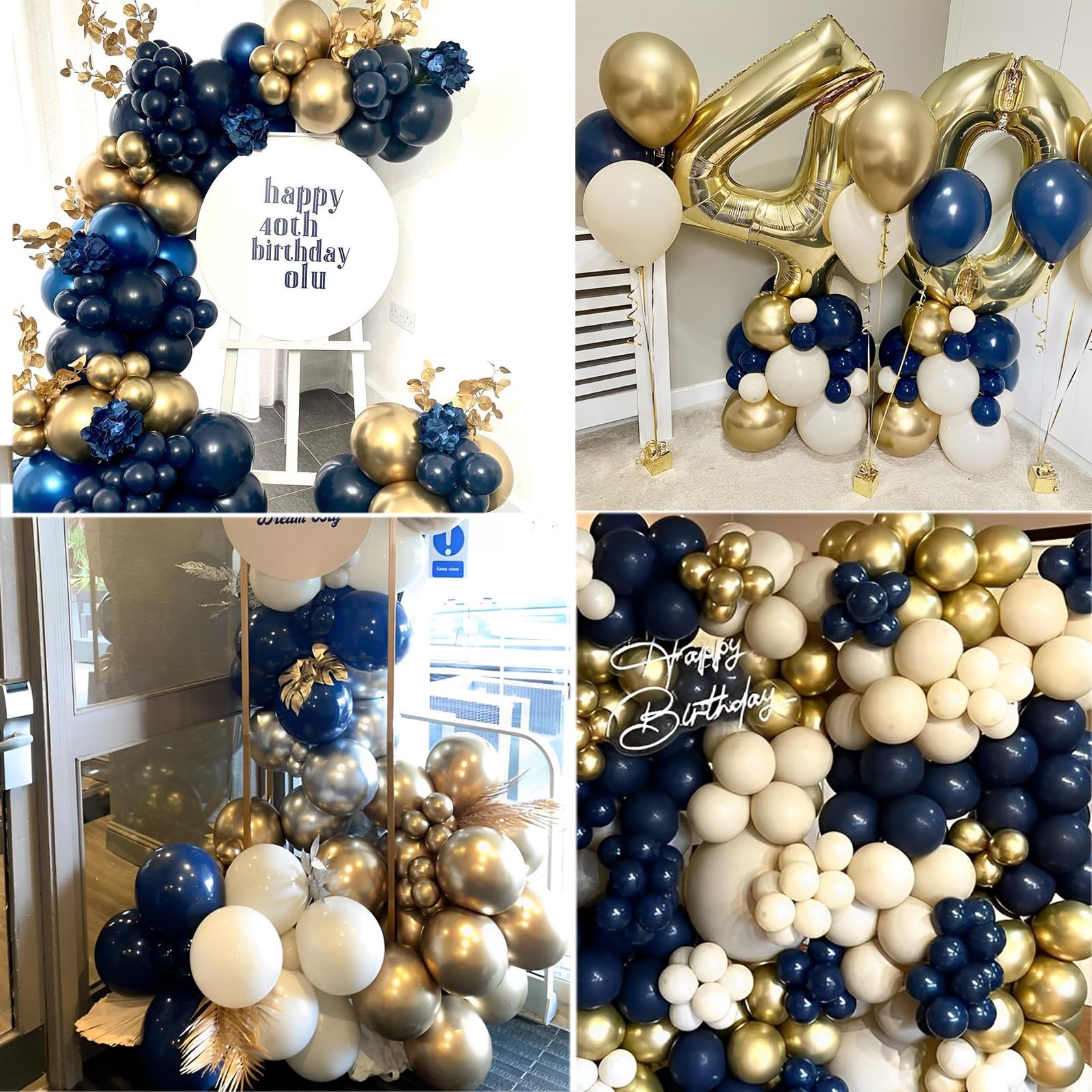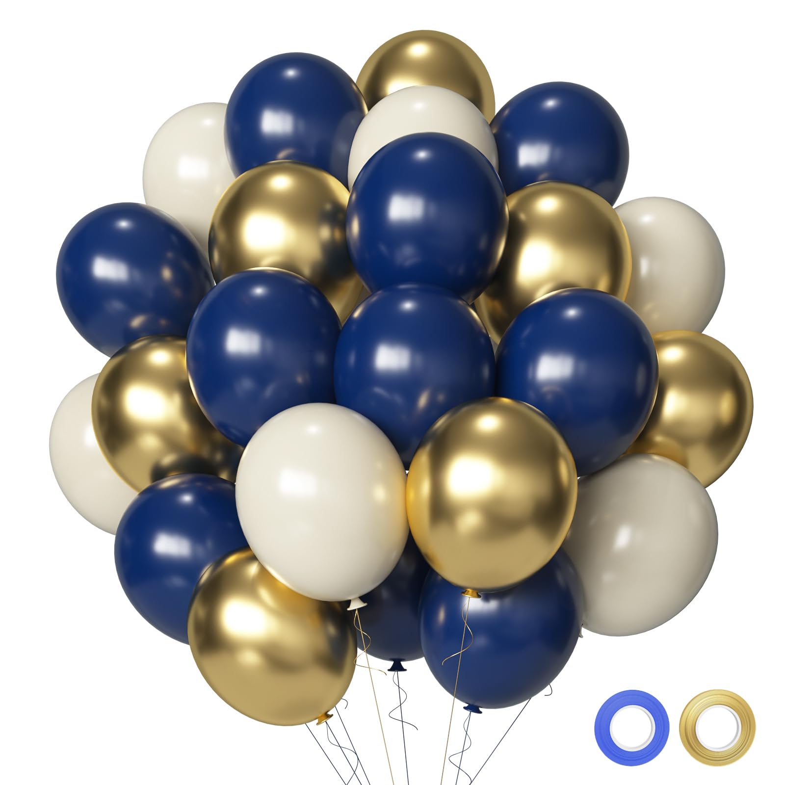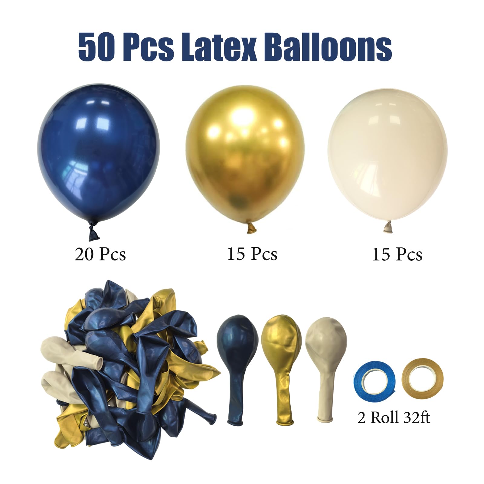 【What You Get】:This navy blue gold sand white balloons set include : 20 pcs navy blue balloons, 15 pcs metallic gold balloons,15 pcs sand white balloons, 2pcs blue and gold balloon ribbon. wedding graduation birthday party decorations.all in one value package! navy blue and gold white balloons are a great way to add a pop of color to any party without spending a lot of money.