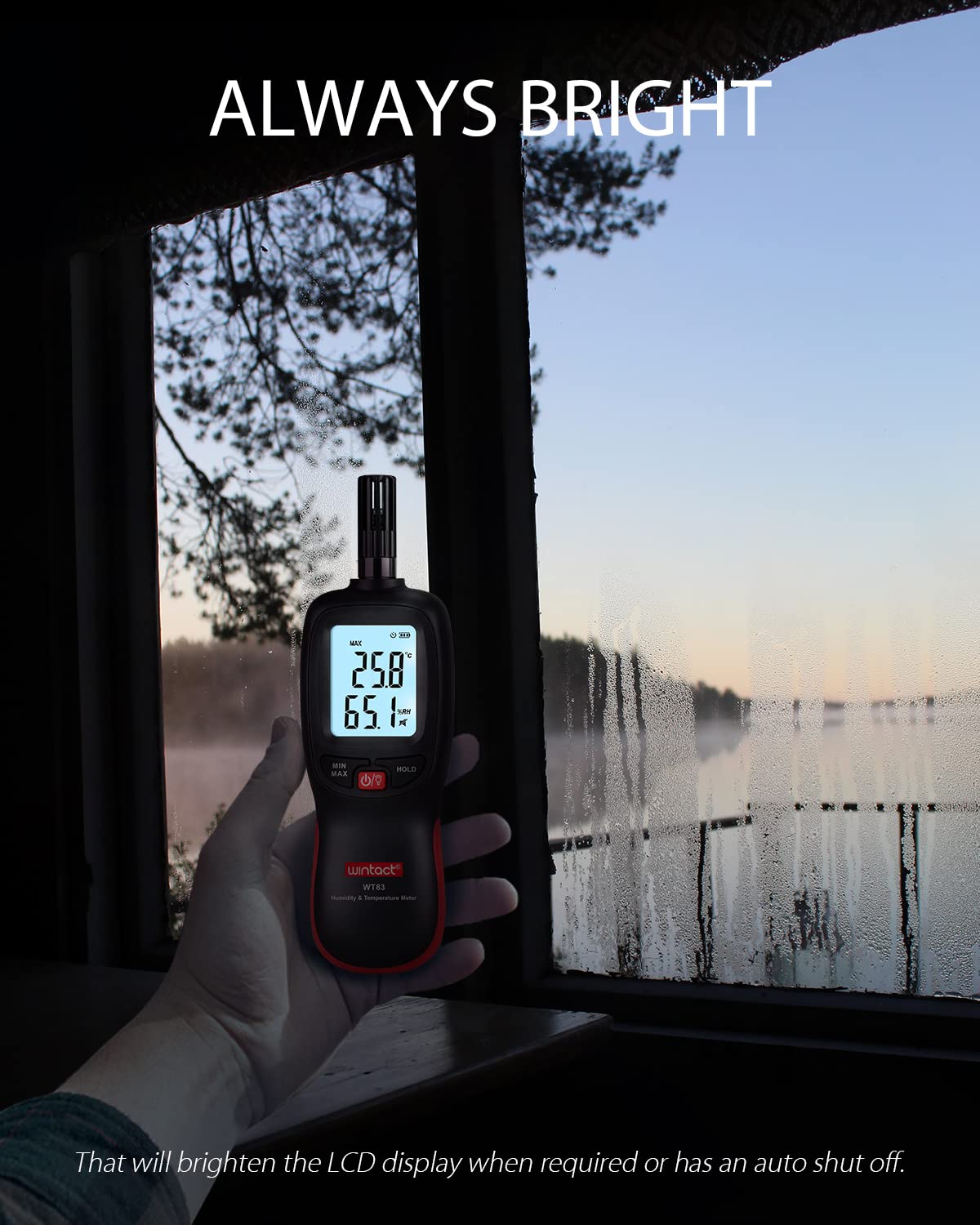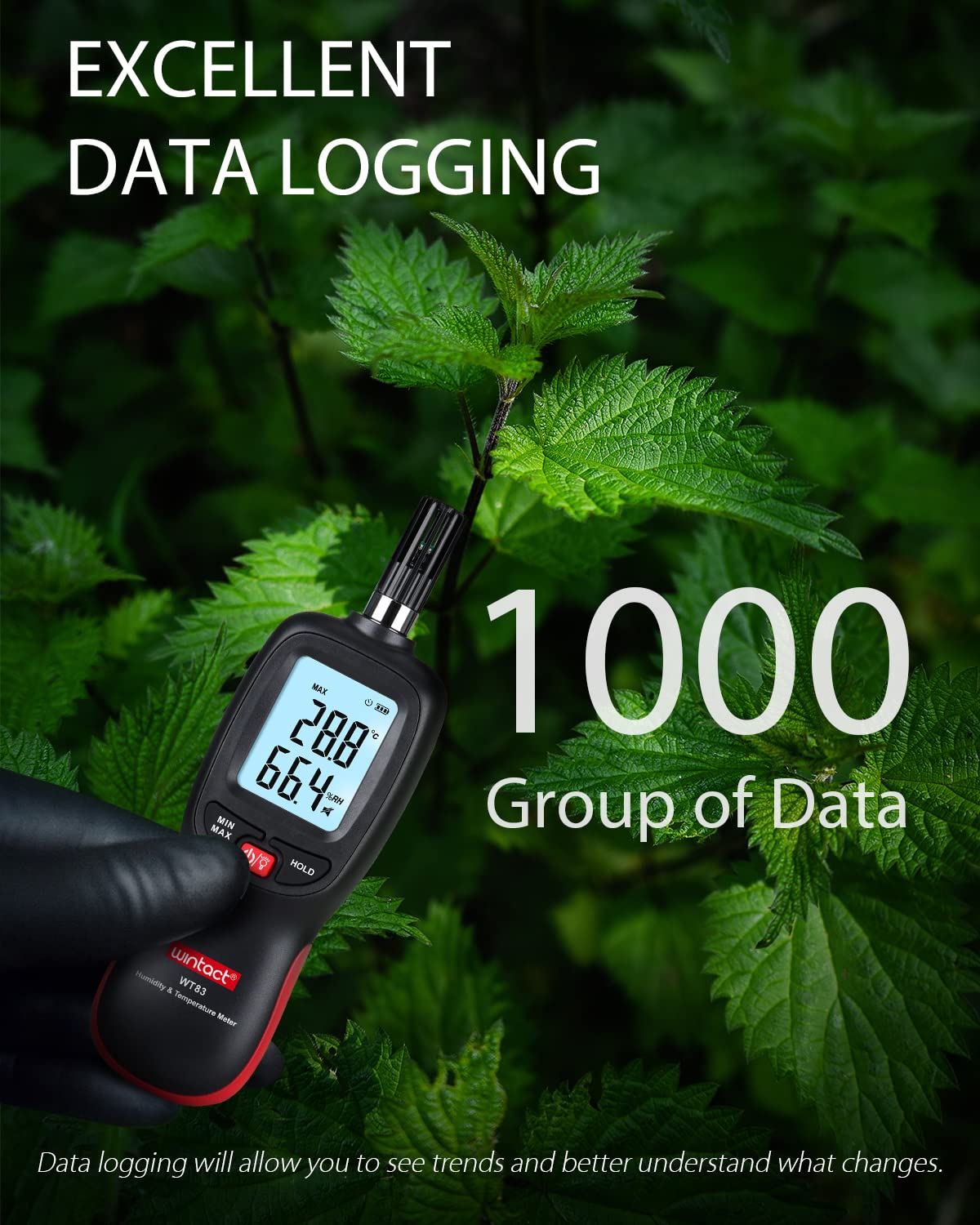 MULTIFUNCTION: The hygrometer and thermometer possess an easy-to-read backlight LCD screen, Data Hold and Store 1000 Group of Data, Display Max/Min reading, Switch °F/°C, High-Low temperature alarm, Auto Power Off, Low battery indicator.