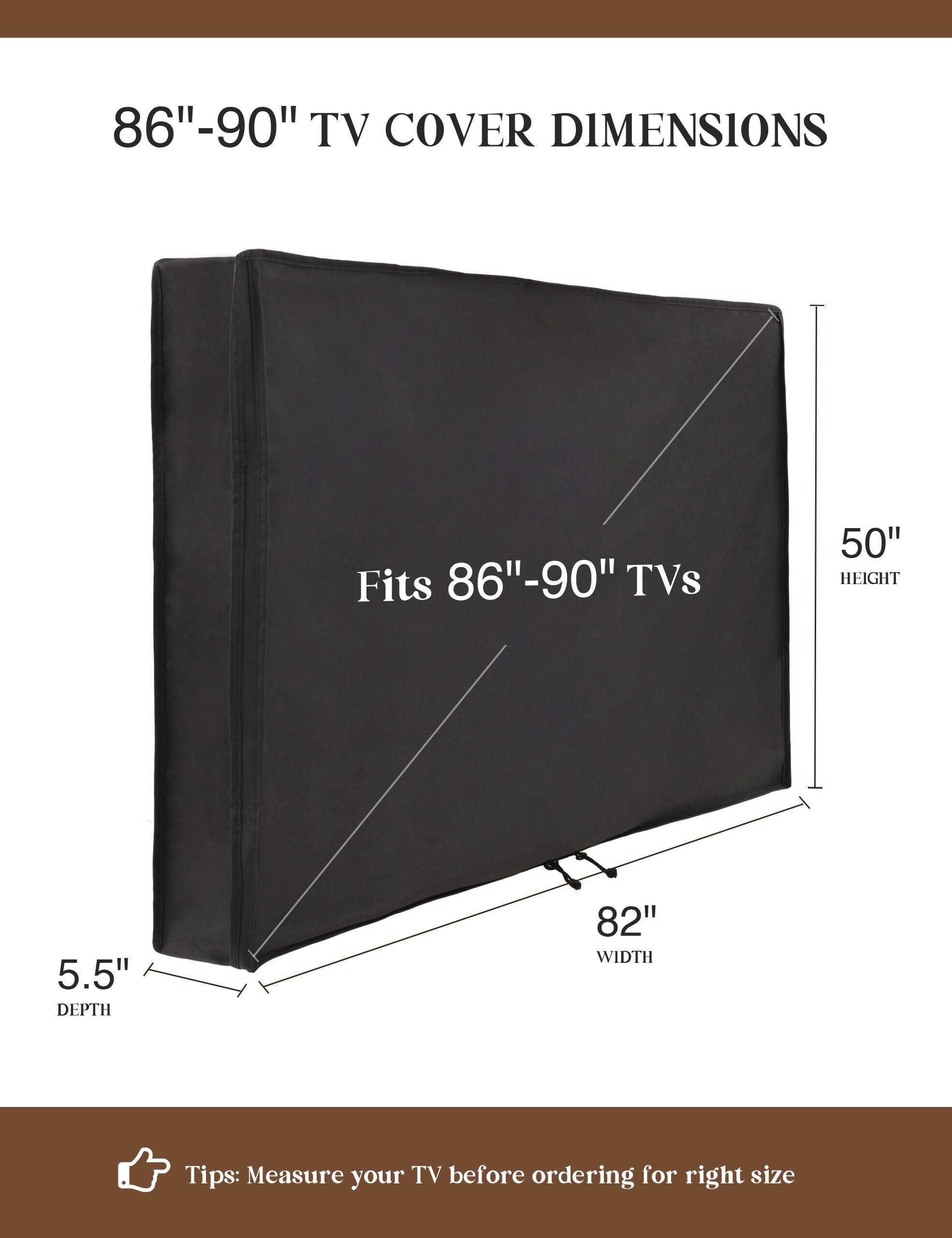 FIND THE RIGHT FIT: Available in the perfect size for your outdoor TV, our cover measures 82 inch wide, 50 inch high, 5 inch deep. Before purchasing, be sure to measure your TV to ensure a proper fit