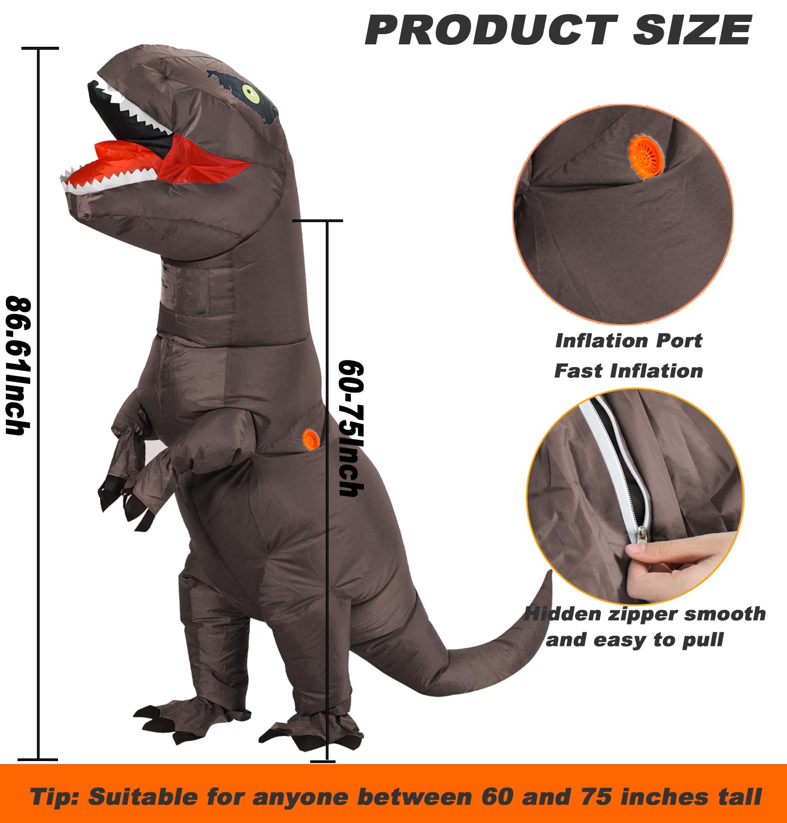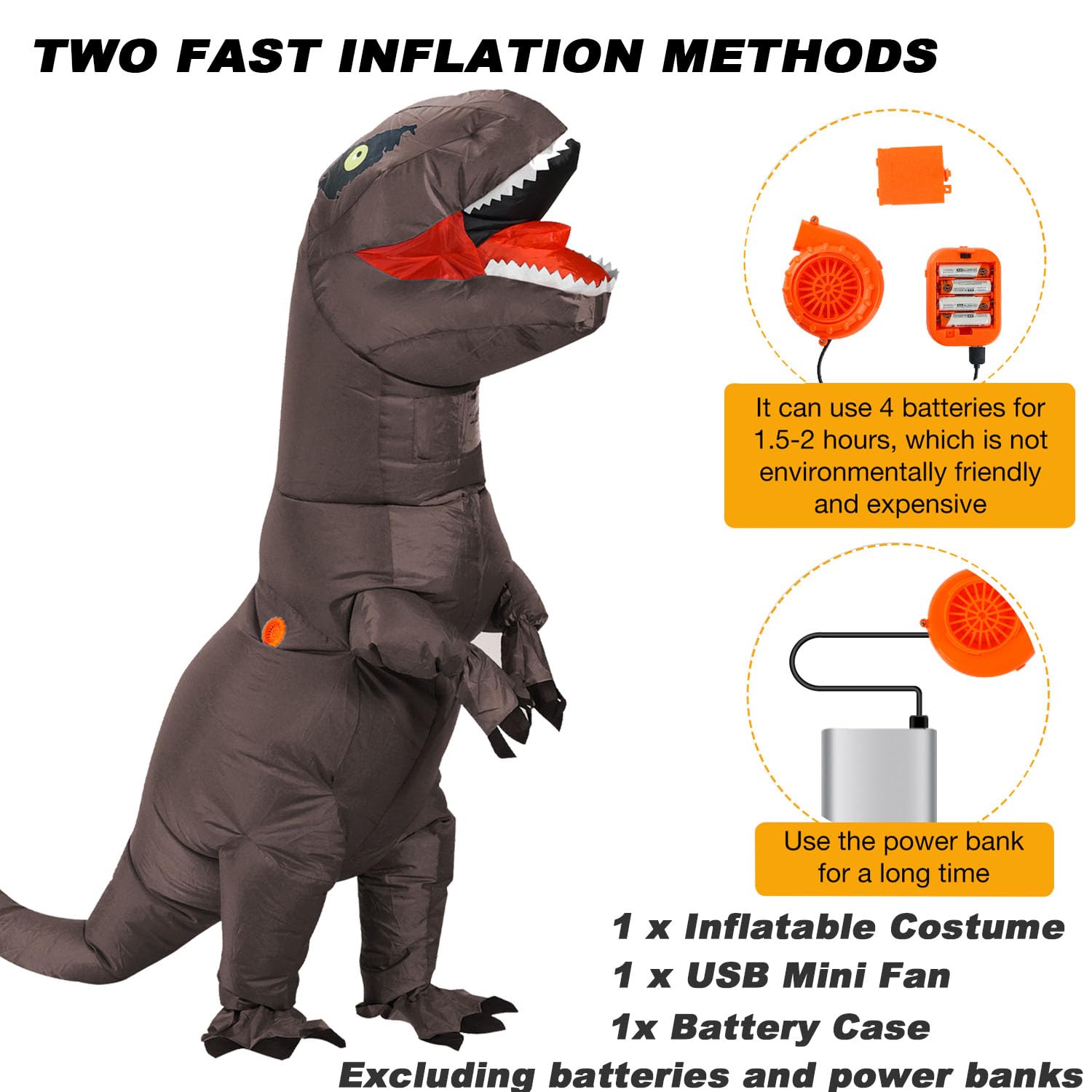 Inflatable dinosaur suit package include:1x trex clothes,1x inflatable air pump,1x battery box(Not include battery). This inflatable dinosaur costume for adults comes in one size (65 "to 78" in)