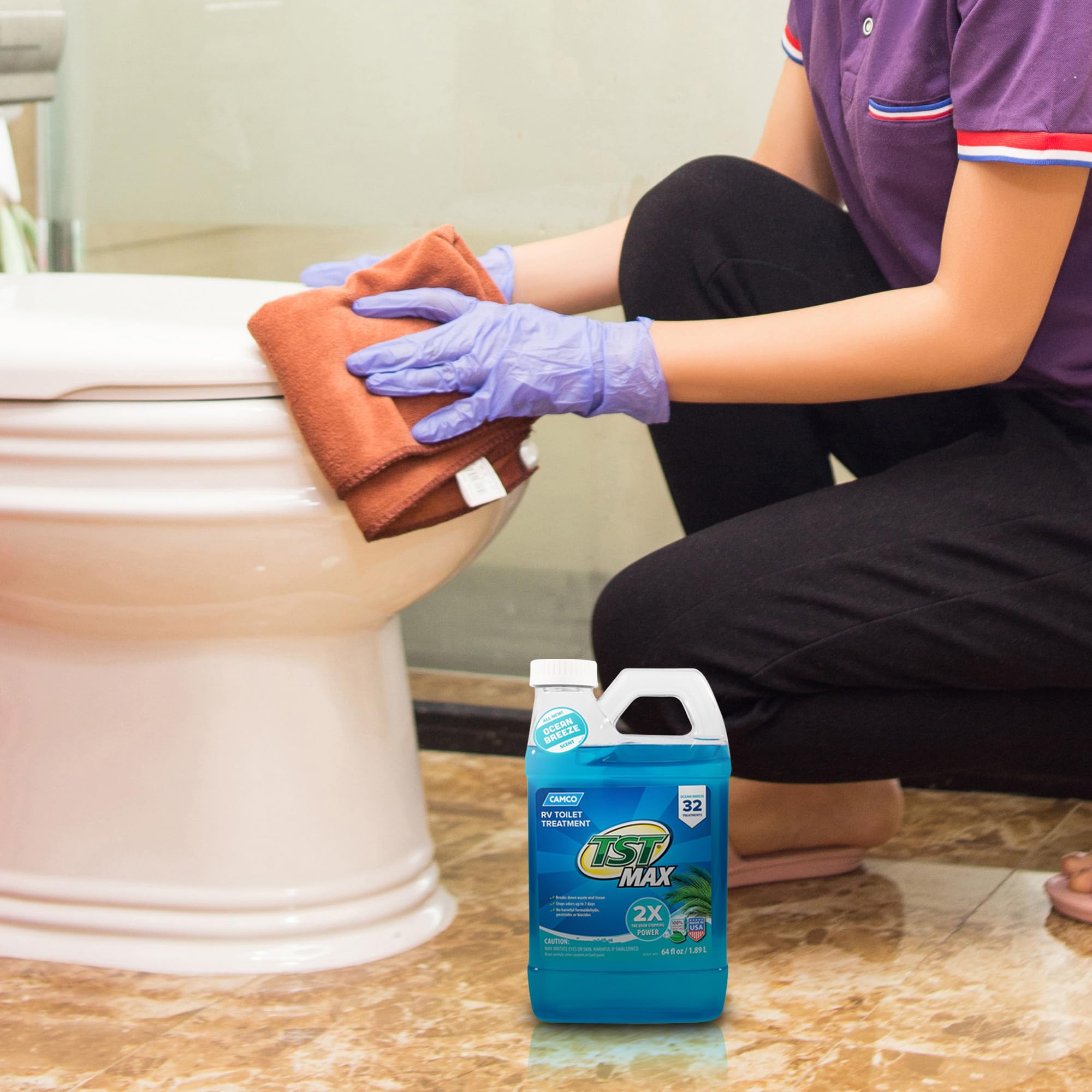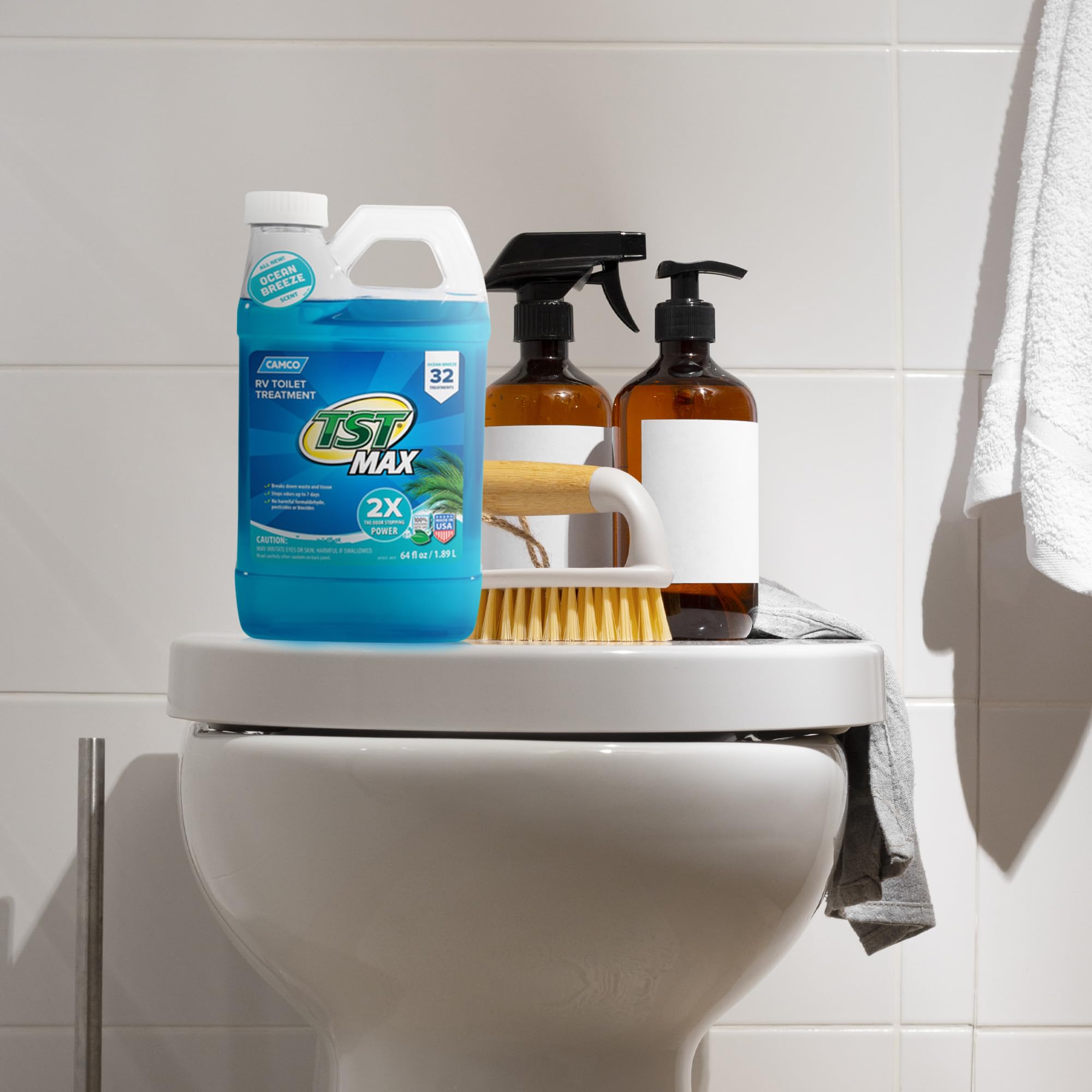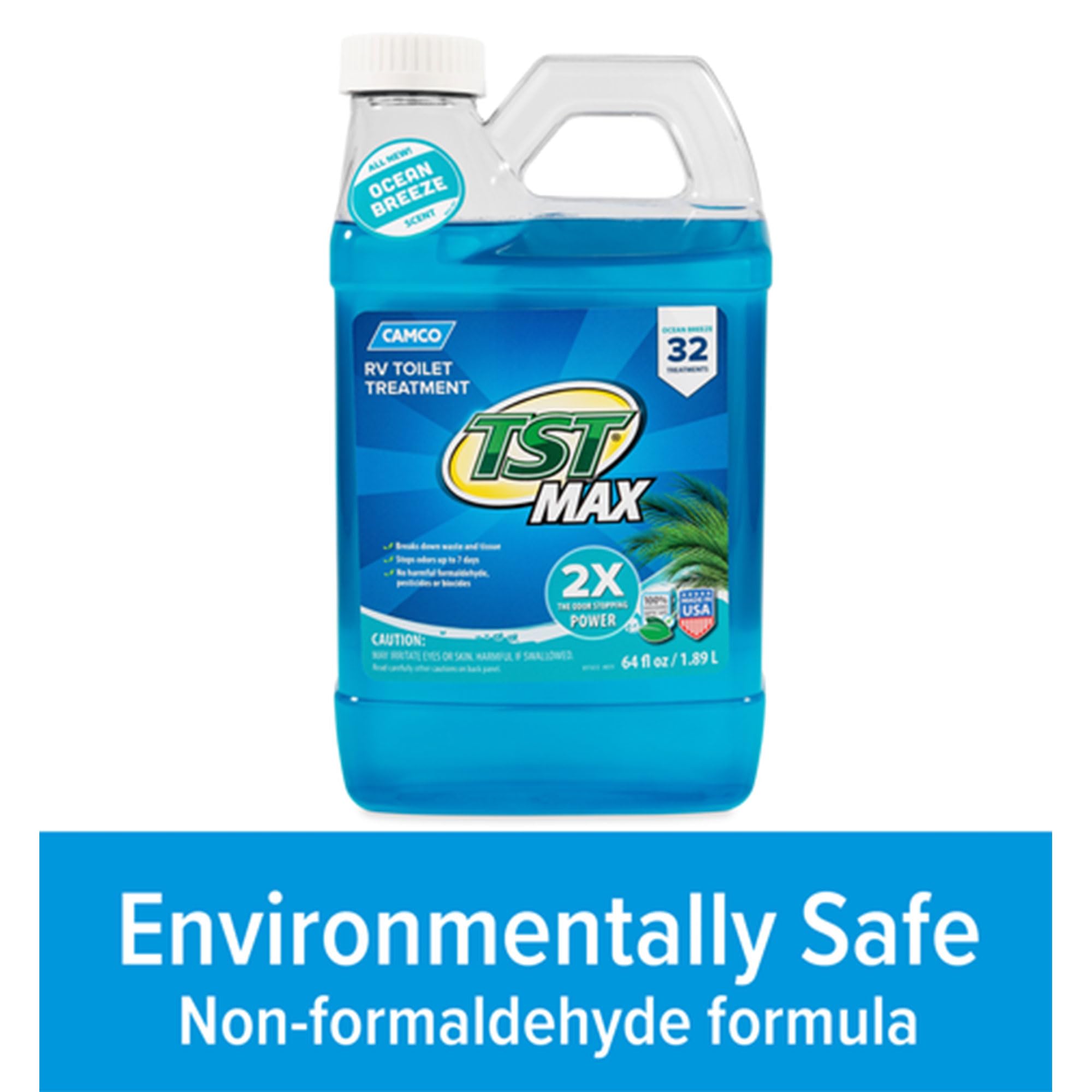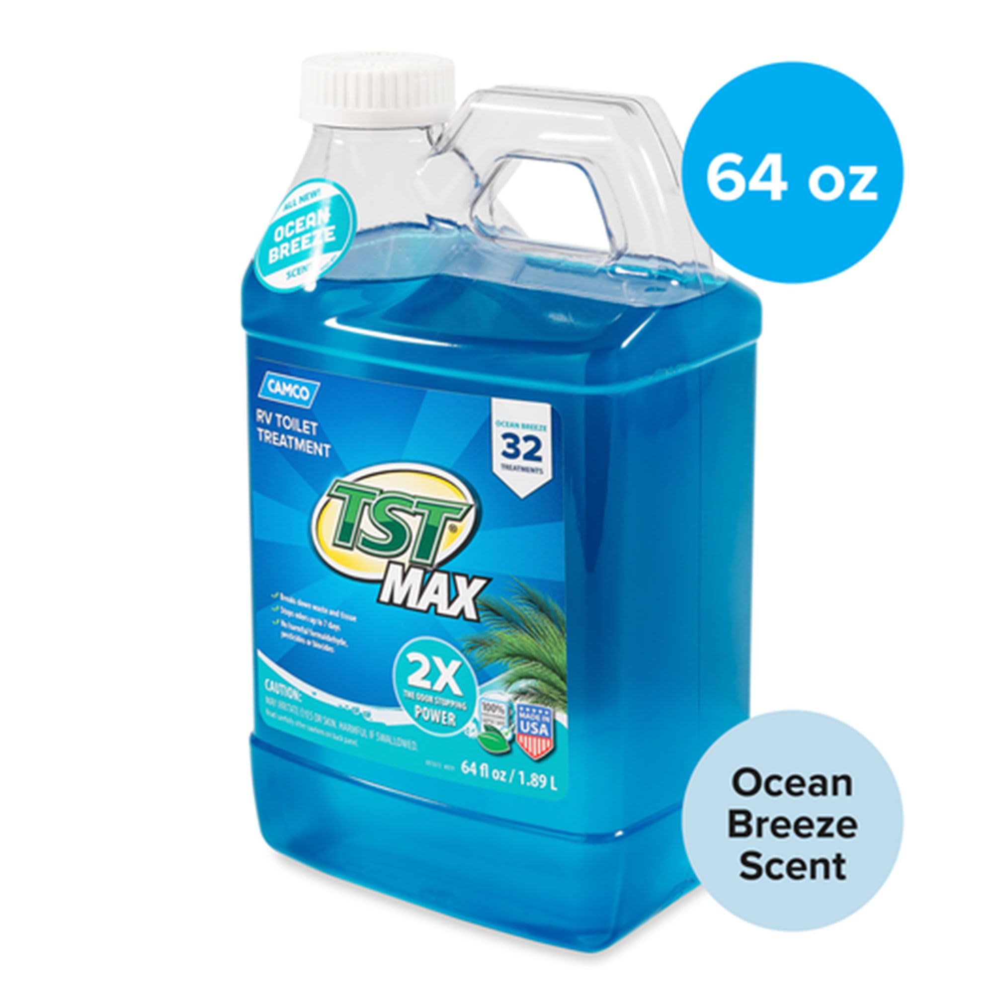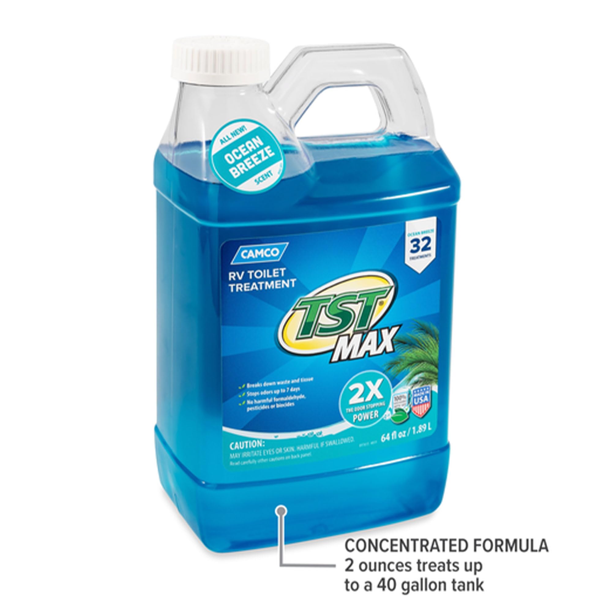 TST MAX eliminates odors and breaks down waste in your RV or marine waste holding tank. Contains an ultra-concentrated formula—just 2 ounces treats up to a 40-gallon tank. This product contains no formaldehyde, is non-staining and is safe for septic tanks. Fragrance: ocean scent. Size: 64 ounces.