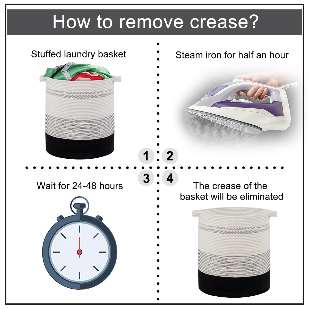 Washable Large Basket: This large basket can be washed by hand or machine with gentle detergent. If machine washed, please put them into a laundry bag. NOTE: These cotton rope baskets are folded when shipping, but it will turn back to its elegant shape quickly if you fill it with some towels or clothing, and iron is great idea to remove the creases