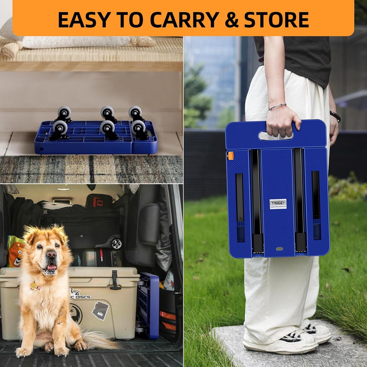 DURABLE MATERIAL FOR HEAVY DUTY TRANSPORTATION: Equipped with 6 enlarged double ball bearing wheels, troozy dolly can hold up to 500lb. Thick stainless steel bars and reinforced chassis design dramatically increase the cart's load capacity and throughput