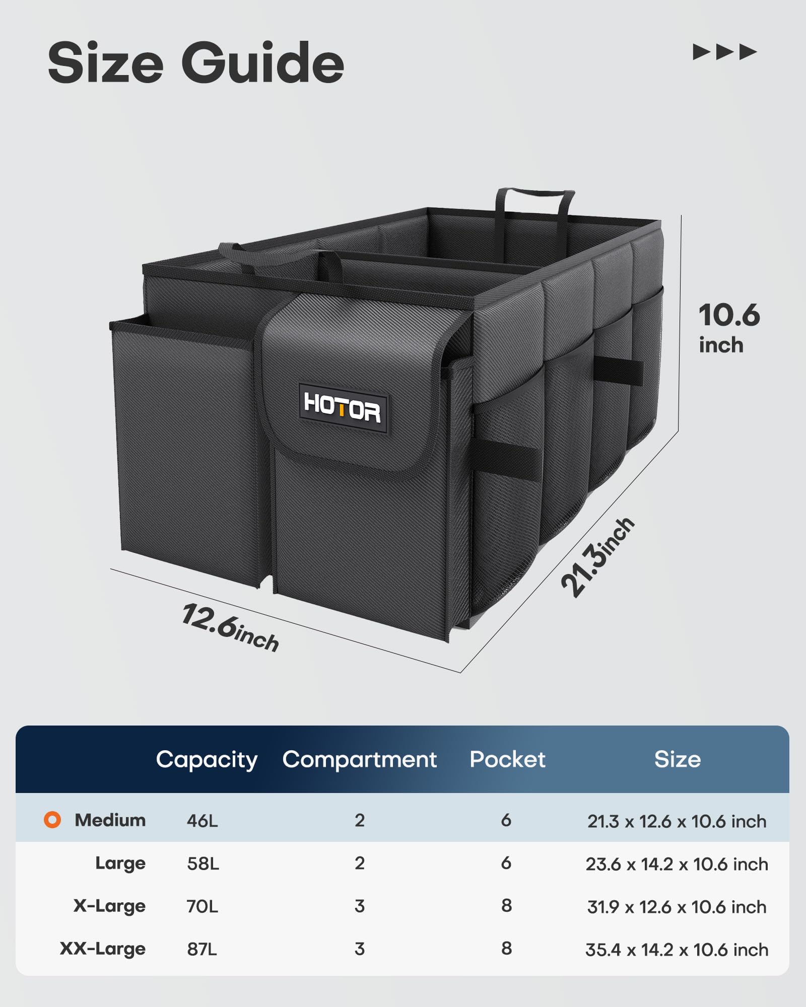 CONVENIENT ACCESS: HOTOR car trunk organizer for SUV is equipped with 2 compartments and 6 stretchy mesh pockets to make items easy to see and grab when needed. No more digging around a messy trunk to find what you need. Just grab and go.