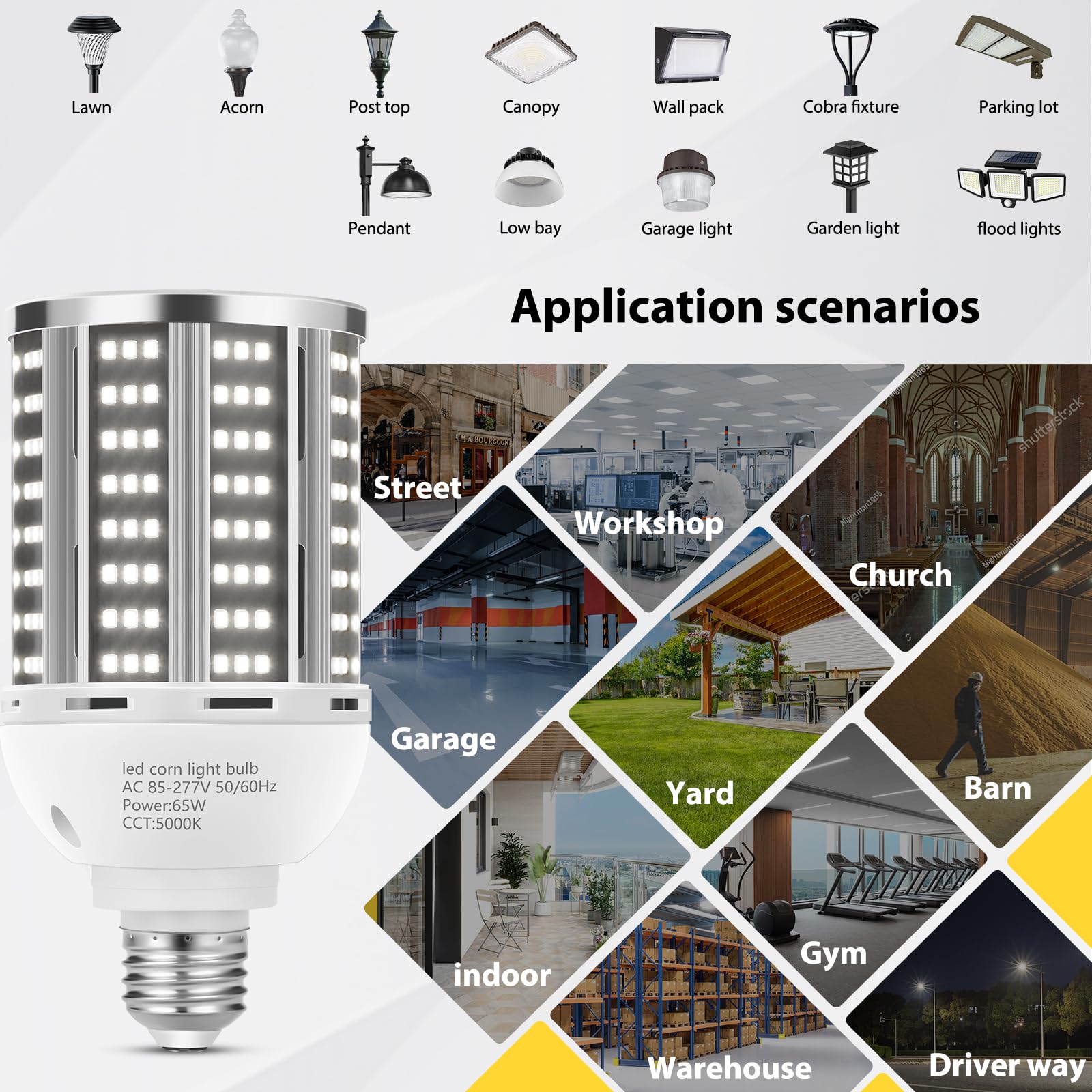 Energy-Saving:65W LED corn light bulb is suitable for AC100-277VAC, 7800 lumens brightness output. under the same brightness, 90% Energy Savings over traditional Replacement 330W-350W Metal Halide/HID/HPS and 650W incandescent bulb.Super bright with 150 lm/w high watt to lumen efficacy