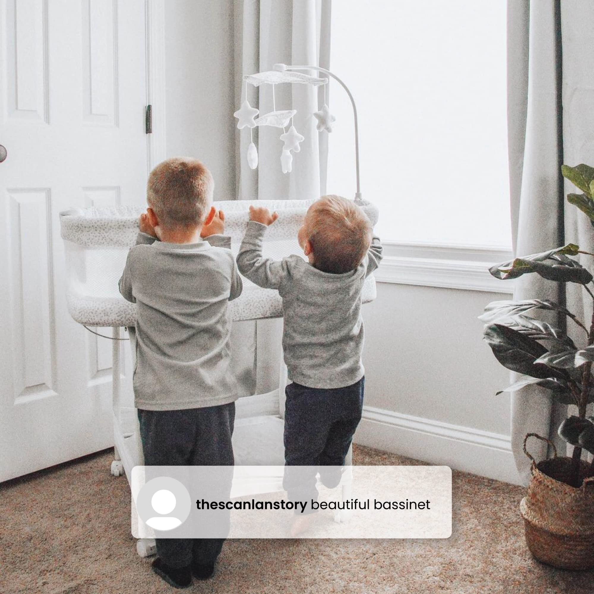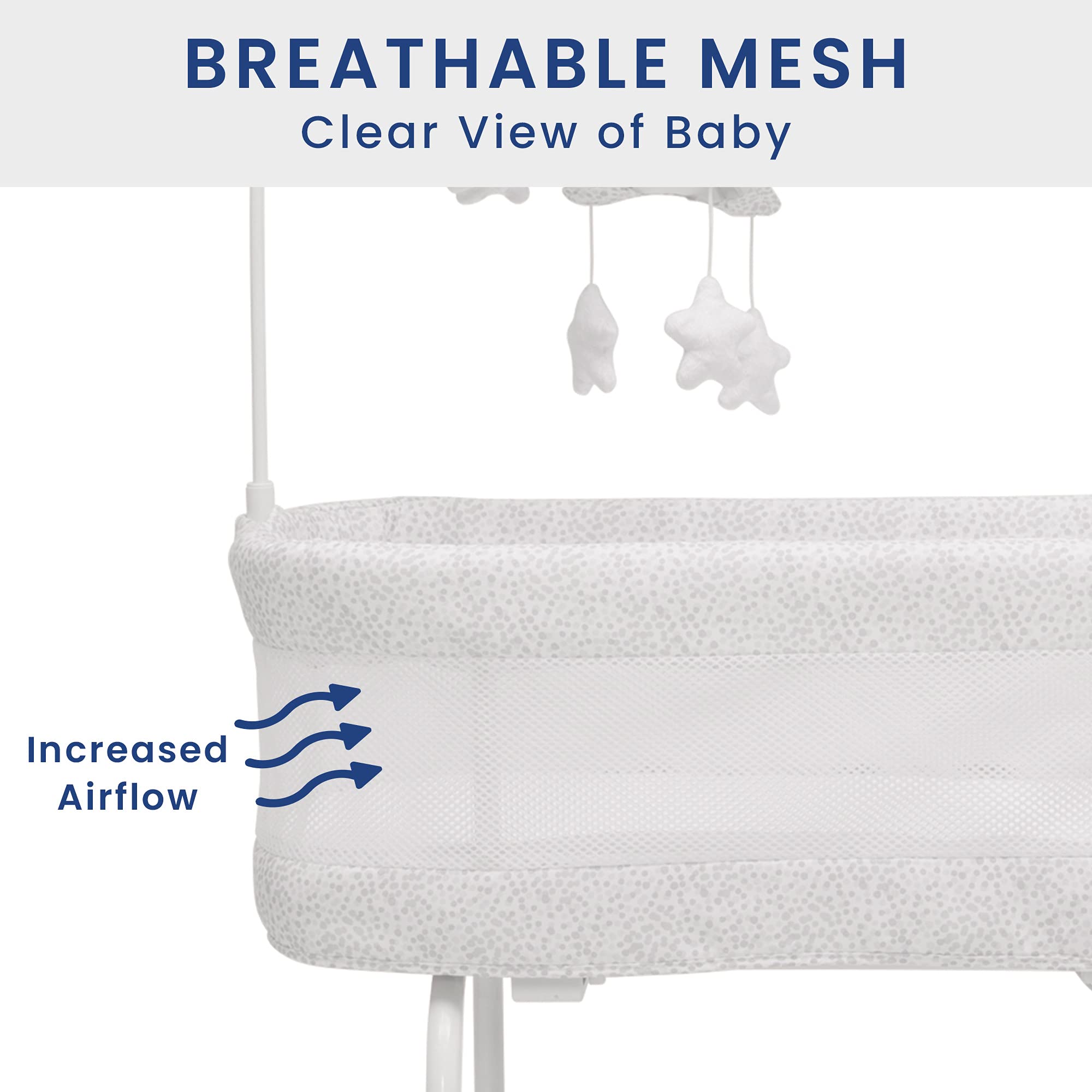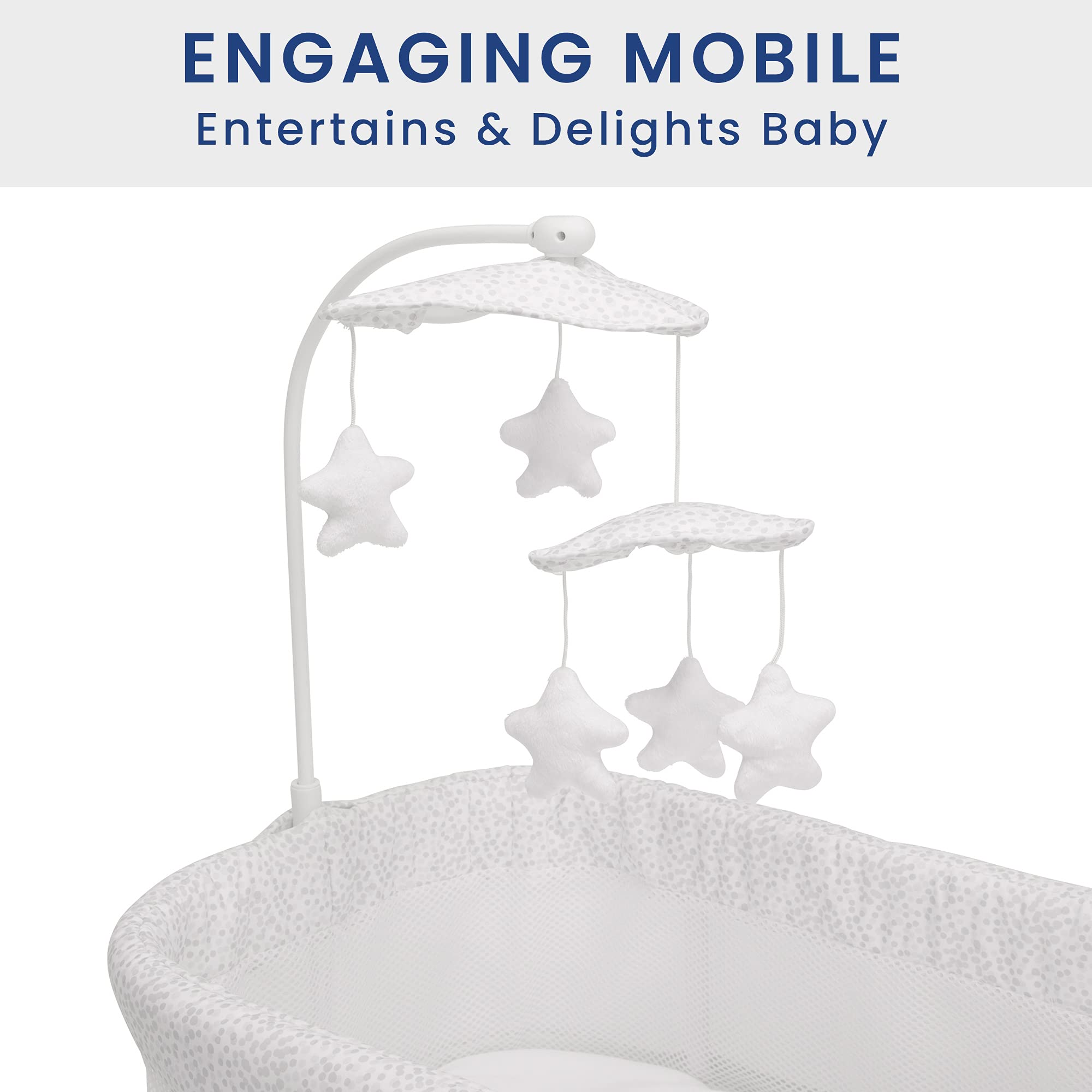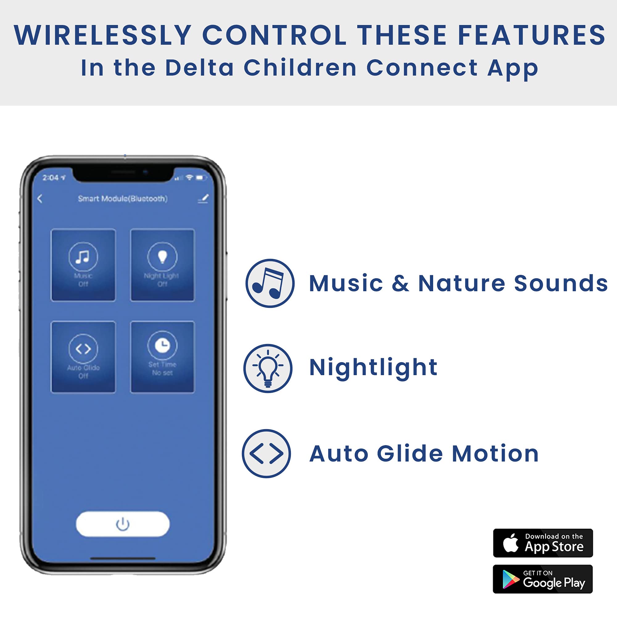 The Delta Children SmartSleep Auto Glide Bassinet with Bluetooth is a modern close-to-the bed sleeper that boasts state of the art technology. The Bluetooth enabled design easily pairs with the Delta Children Connect App, where you'll be able to wirelessly control and customize the length and speed of the auto glide motion, sound level of the music and nature noises, as well as the brightness of the nightlight. Designed to help your baby fall asleep faster and stay asleep longer, the hands-free auto-glide motion will provide a calming environment while the two-tier toy arm with plush stars will engage and delight your baby if they wake up in the middle of the night. Breathable mesh sides all around provide increased airflow and a clear view of your sleeping baby. Other stand-out features include: large storage basket, comfortable 1-inch waterproof mattress pad with machine washable fitted sheet and wheels that make it easy to move around the house. Get the Delta Children SmartSleep Auto Glide Bassinet and help soothe baby back to sleep (without getting out of bed!). The Delta Children Connect App is free to download and available on the Apple App Store or on Google Play. This bassinet is recommended for babies 0-5 months. Max weight 30 lbs. Stop use at 5 months or once your infant begins to push up on their hands and knees, whichever comes first. Delta Children was founded around the idea of making safe, high-quality children's furniture affordable for all families. They know there's nothing more important than safety when it comes to your child's space. That's why all Delta Children products are built with long-lasting materials to ensure they stand up to years of use. Plus, they are rigorously tested to meet or exceed all industry safety standards.