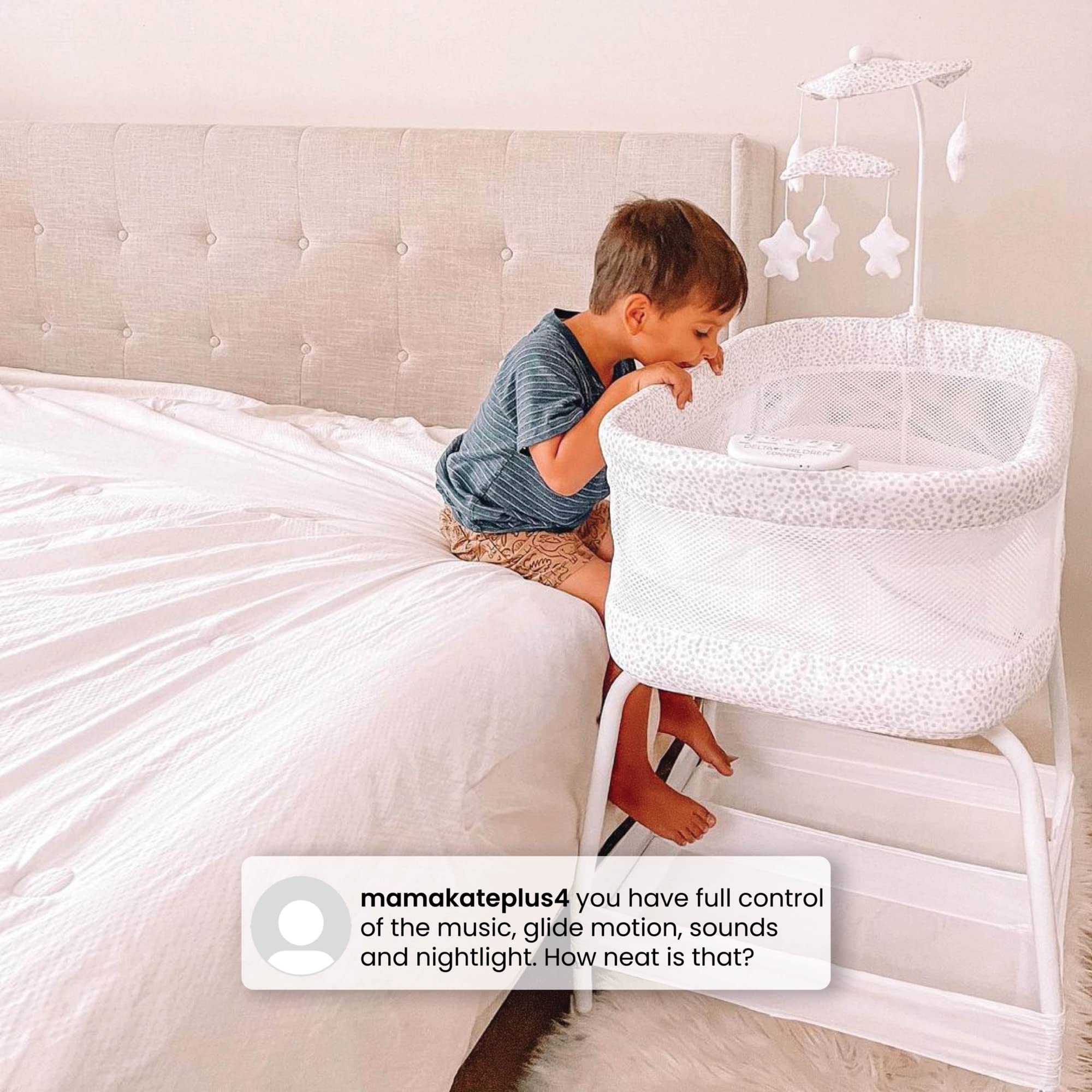 SMART BABY ESSENTIALS: With Delta Children Connect app downloadable from Apple App Store or Google Play, this bassinet bedside sleeper can be remotely activated anywhere from within the house for a range of features, such as auto glide motion that can be customizable for length and speed to soothe baby; 5 choices each in calming music and nature sounds; and convenient nightlight. This means that BOTH you and your little one can enjoy a full night's sleep!