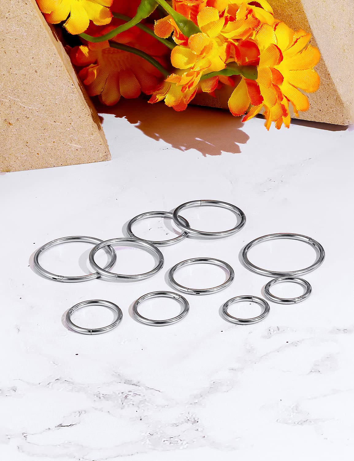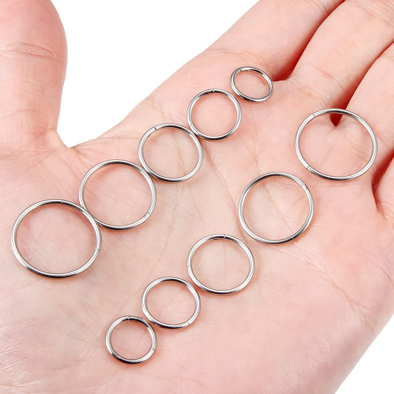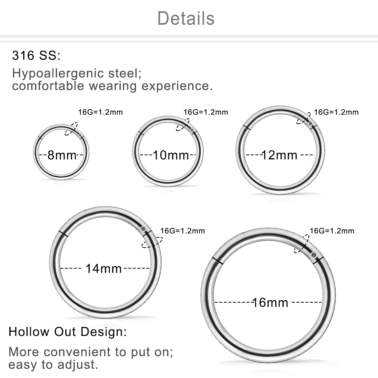 MEASUREMENTS: Thickness Gauge Size: 16G (1.2mm). Inner Diameter: 8mm(5/16inch), 10mm(3/8inch), 12mm(1/2inch), 14mm(9/16inch), 16mm(5/8inch). Color: Silver-tone. Perfect Jewelry Fit for Women Men.