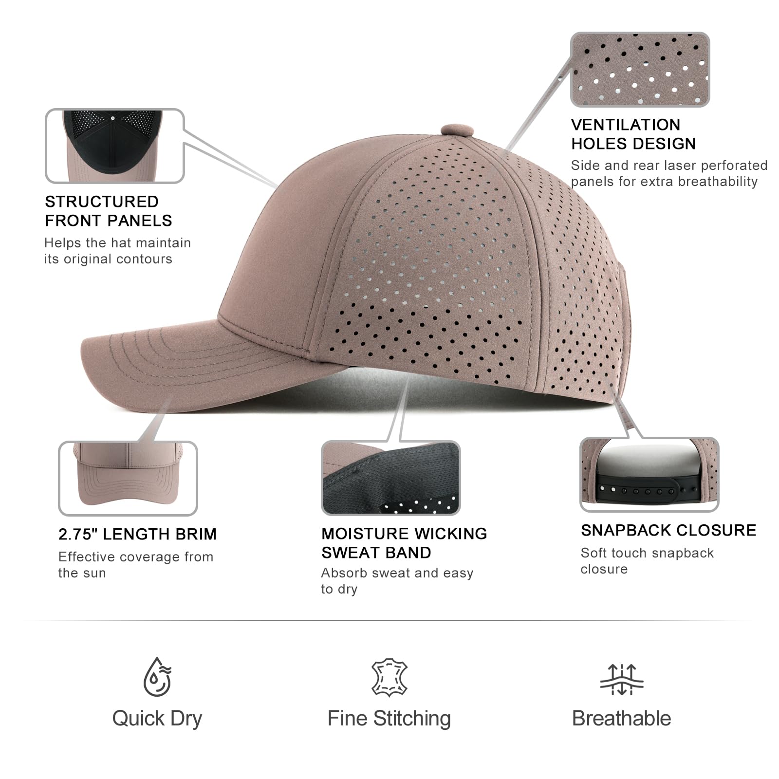 Design: structured front panels, 6-panel cap, curved brim, laser-perforated side & rear panels for breathability, and soft touch snapback closure