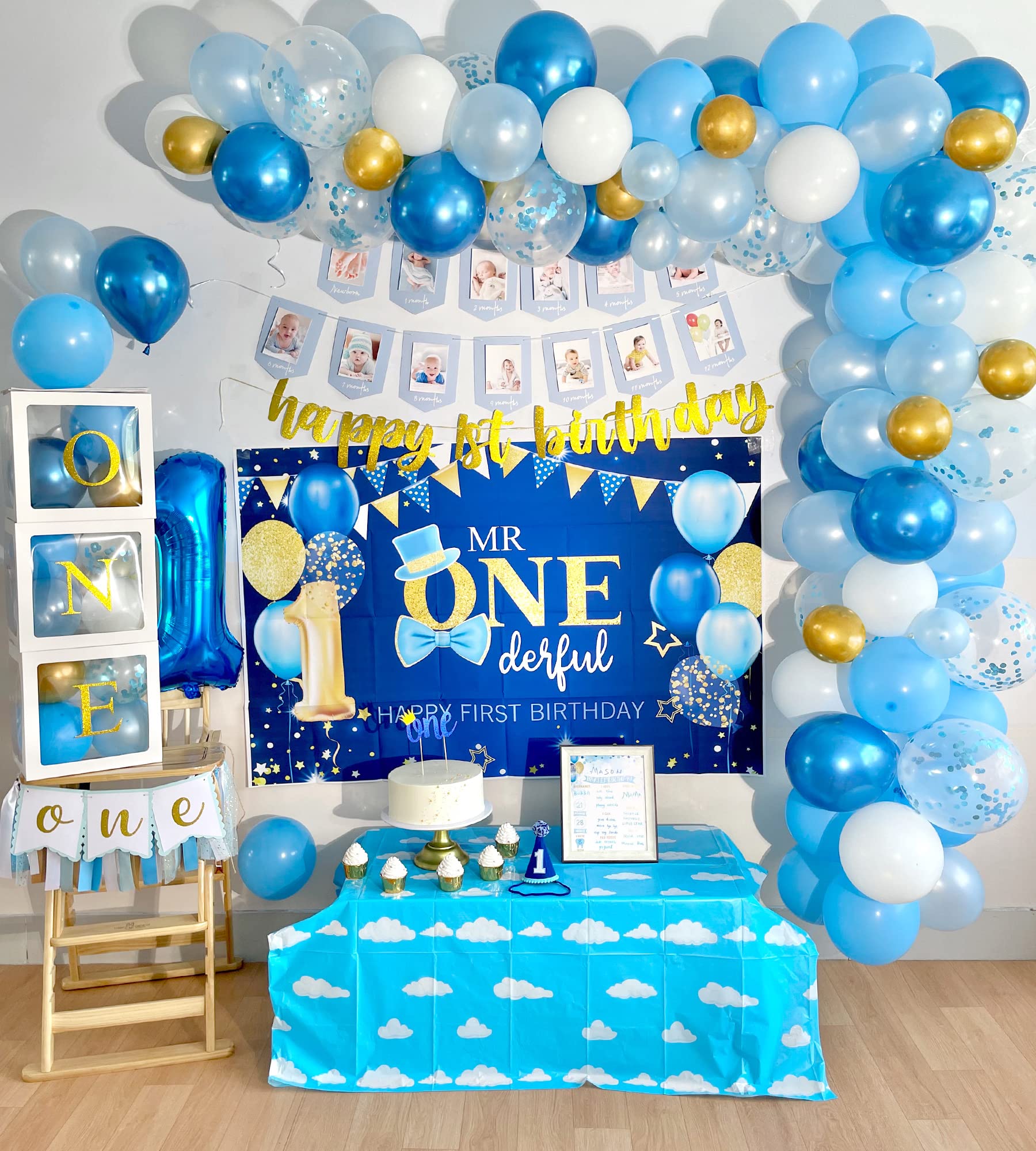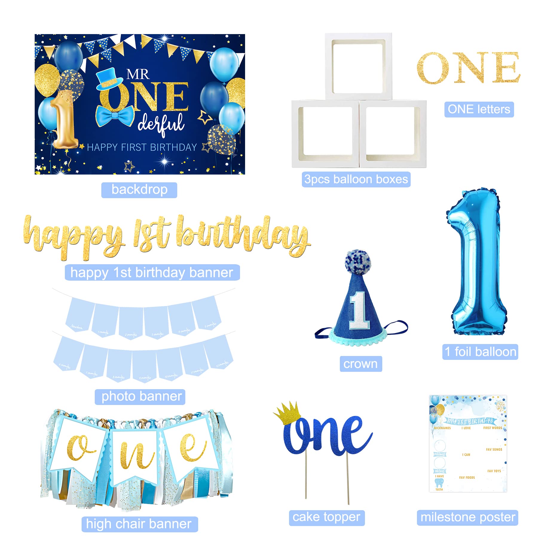 First Birthday Boy Decoration - Package includes: 1st Birthday Backdrop, 3pcs 1st Birthday Balloon Boxes, Happy 1st Birthday Banner, Newborn-12Months Photo Banner, 1st Birthday Crown, High Chair Banner, One Cake Topper, 1st Birthday Milestone Posters, Number 1 Foil Balloon, 90pcs Latex Balloons, Balloon Garland Strip, 100 Dot Points Stickers, Balloon Ribbon, Instruction.