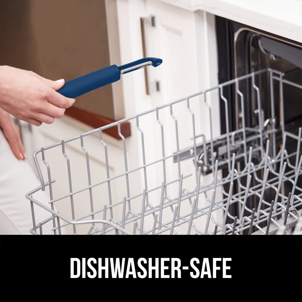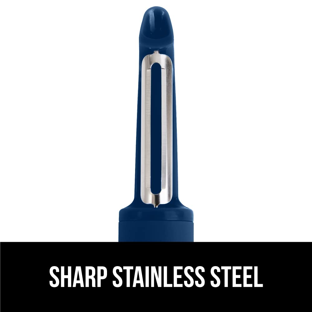 SHARP STAINLESS STEEL: vegetable peeler's extra sharp and durable blades easily peel through even the thickest and toughest of produce; constructed from durable and rust-resistant stainless steel and designed to last; BPA-free, food grade, and dishwasher safe for easy cleaning