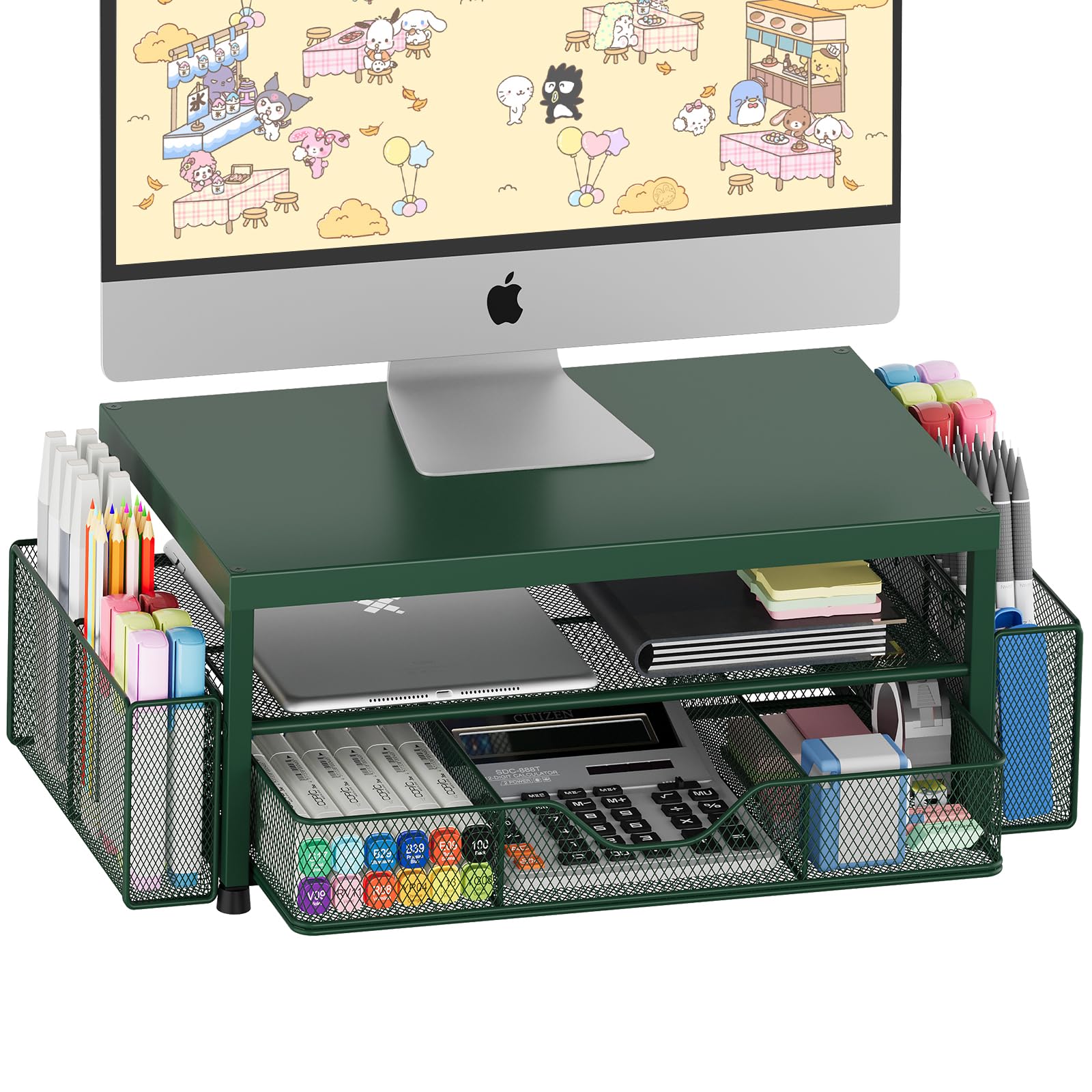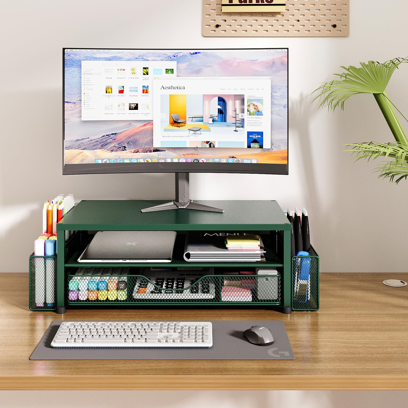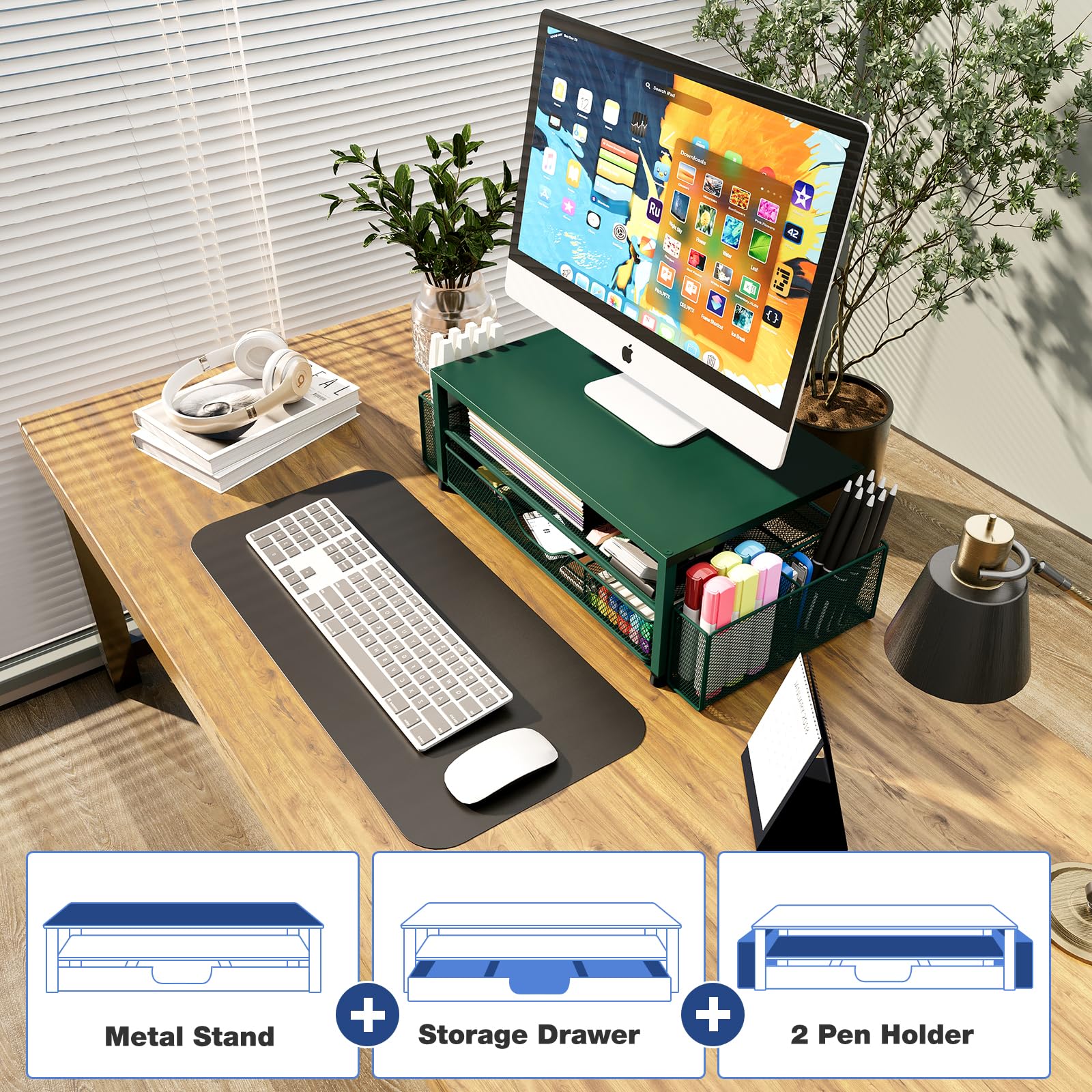 【Save Space】:This 2-Tier monitor stand with drawer and 2 hanging pen holders provides ample storage space to keep your office supplies and office desk accessories neatly organized and easily accessible, keeping your workspace tidy and improving your sense of well-being