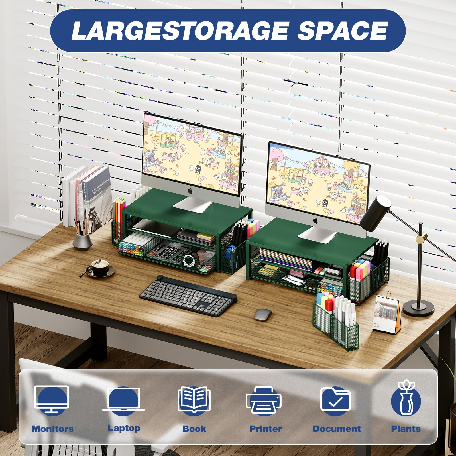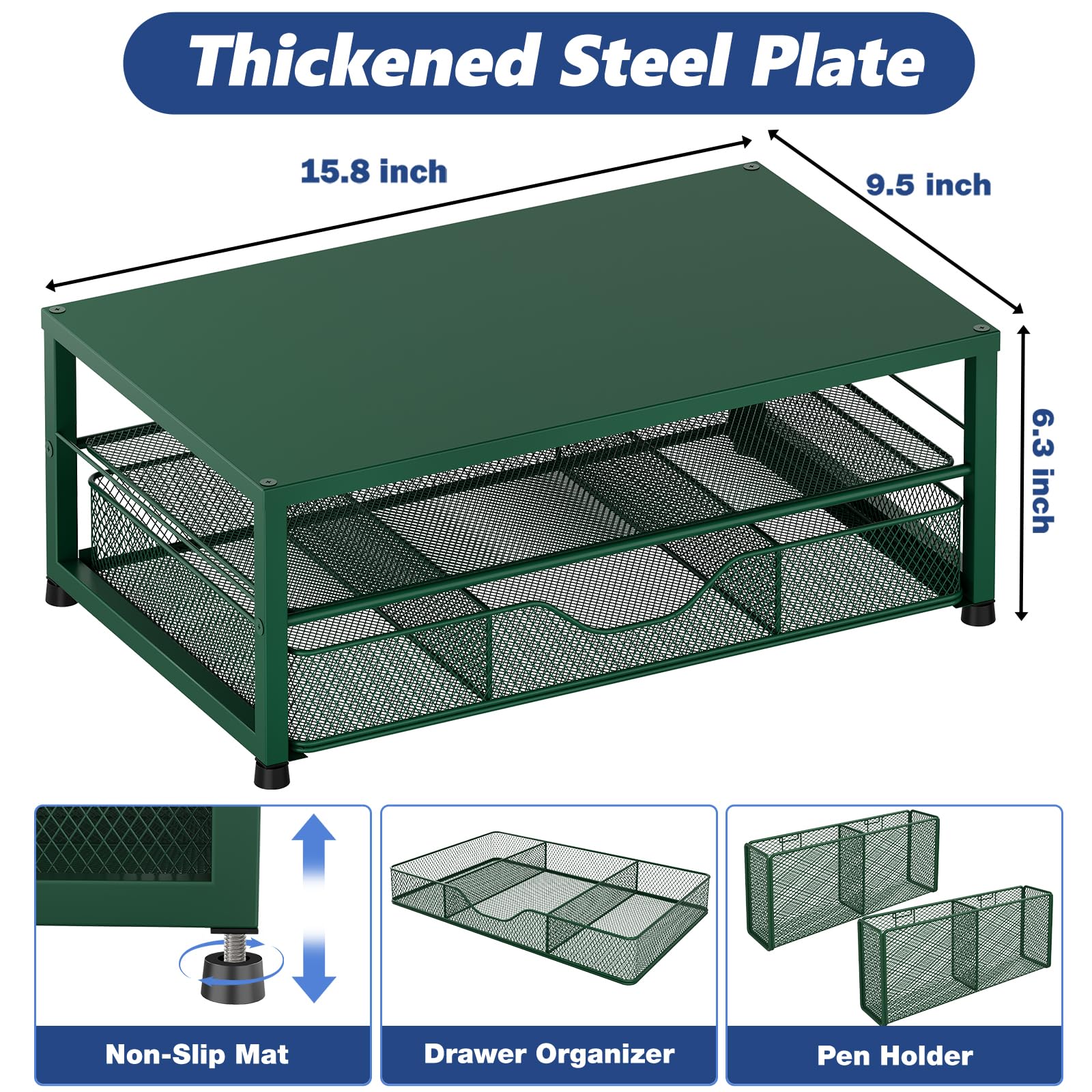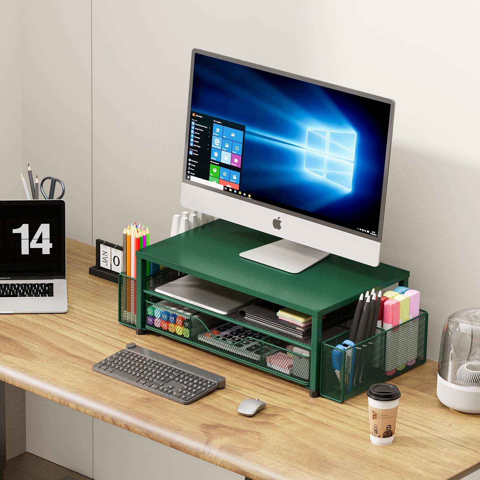 【Save Space】:This 2-Tier monitor stand with drawer and 2 hanging pen holders provides ample storage space to keep your office supplies and office desk accessories neatly organized and easily accessible, keeping your workspace tidy and improving your sense of well-being