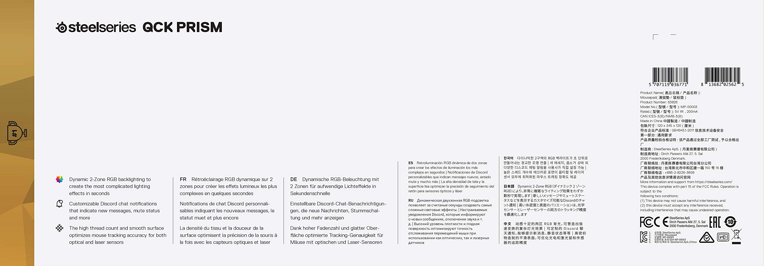 The Qck prism gaming mouse pad combines the legendary Qck micro woven cloth found in the world’s bestselling mouse pad with dynamic 2 zone RGB illumination and real time event lighting notifications. Steel series engine software unlocks an impressive arsenal of engine apps that make customization easy and intuitive. The durable, never slip base and smooth surface, optimized for both optical and laser sensors, make the Qck prism perfect for competitive gaming.
