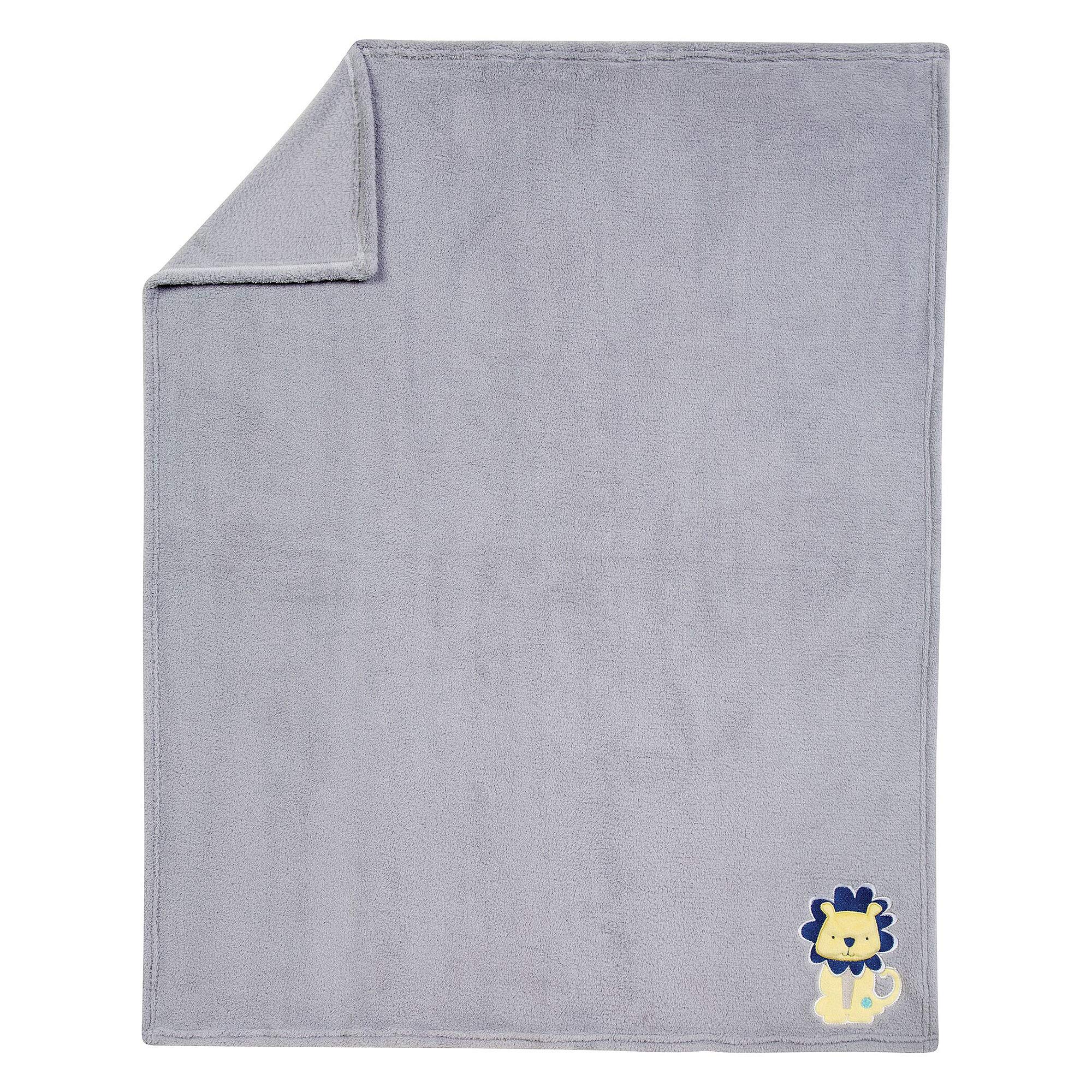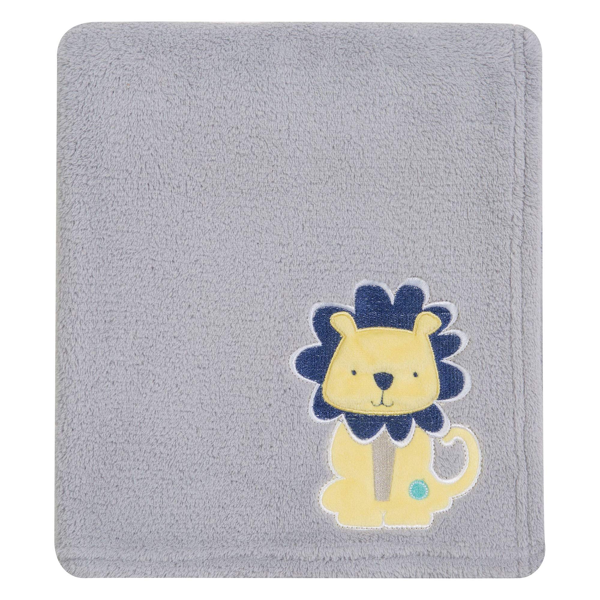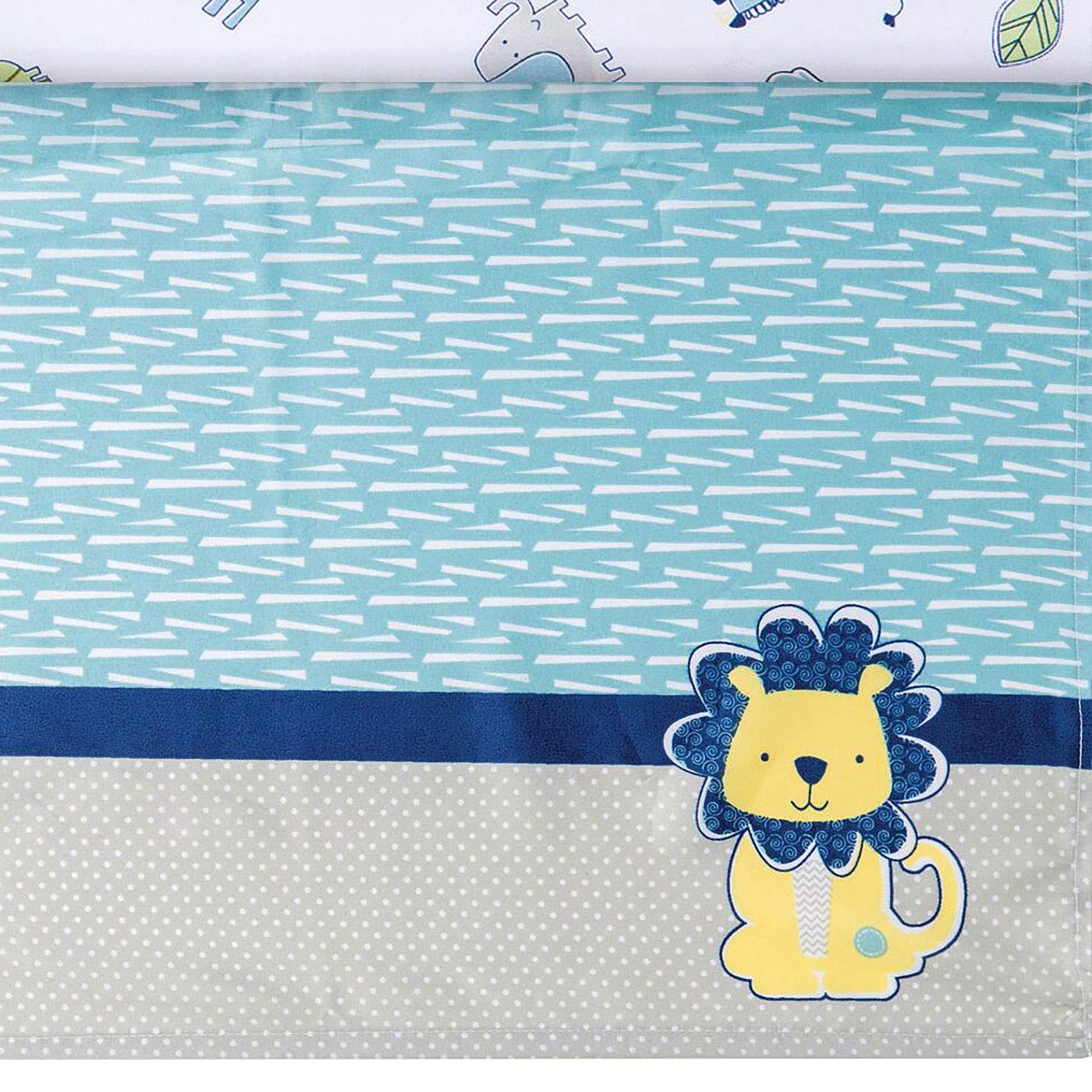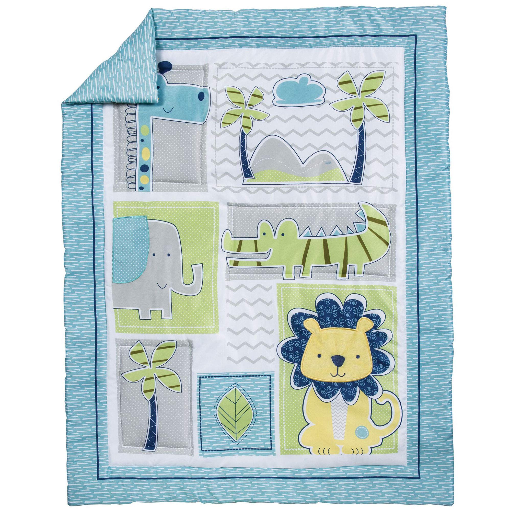 Your little one will go wild over the adorable animals in the Jungle Roar collection by Trend Lab. Giraffe, elephant, lion and crocodile characters are shown in aquatic blue, navy, gray, mellow yellow and tonal greens and highlighted with a multitude of fun patterns throughout. The mixture of embroidery, and different fabric appliques will make this jungle collection stand out in your nursery. Set includes: Quilt, Crib Skirt, Fitted Crib Sheet and Baby Blanket. Reversible Quilt measures 35 in x 45 in and features giraffe, elephant, alligator, and lion patchwork jungle animals in aquatic blue, sage, navy, dove gray, mellow yellow and white. Quilt is backed in aquatic blue abstract print for decorating versatility. Fitted Crib Sheet features jungle animals scatter print in aquatic blue, sage, navy, dove gray, mellow yellow and white. Crib sheet fits a standard 28 in x 52 in crib mattress and features 8 inch deep pockets with elastic surrounding the entire opening ensuring a more secure fit. Flat Crib Skirt with 14 inch drop features aquatic blue abstract body, gray mini dot accent, navy solid trim with a printed lion detail in the corner. Soft gray plush Baby Blanket features a lion applique in the corner that adds the finishing touch to this cozy blanket. Blanket measures 30 in x 40 in.