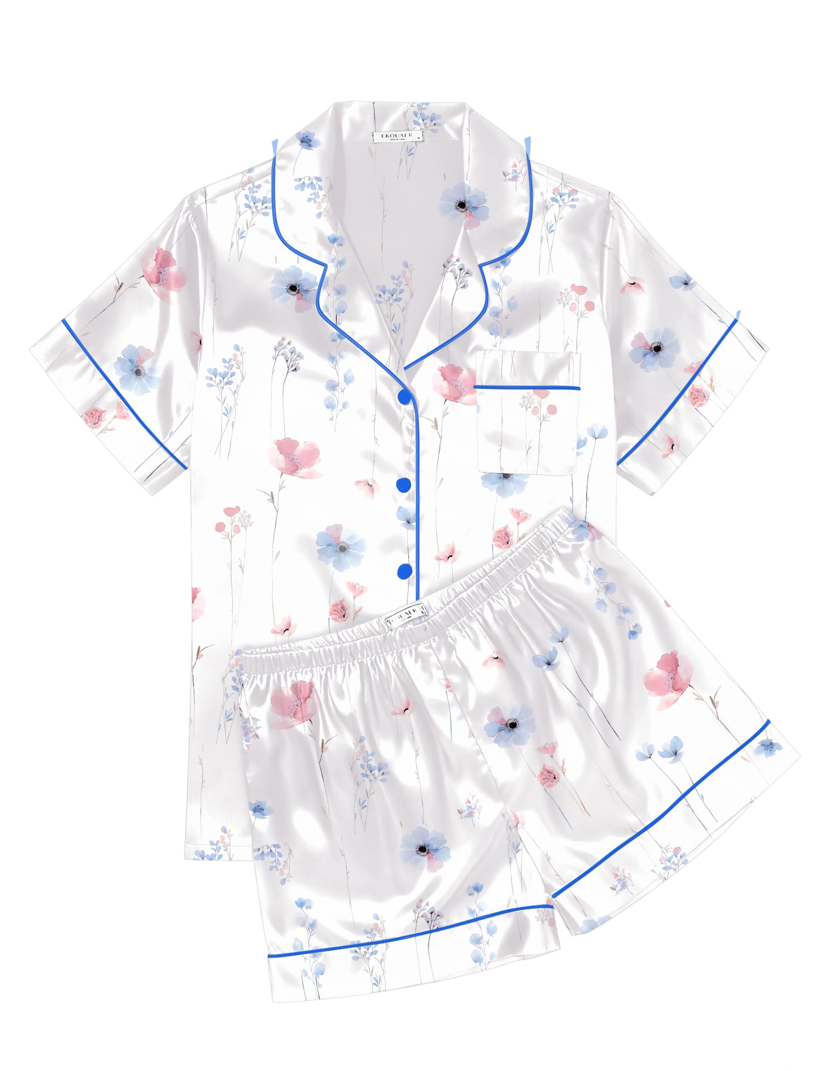 Elegant design:Short sleeve pajama tops, button down front,notch lapel collar and one chest pocket.Matching pajama shorts for women with stretchy elastic waist that fits for any body size.Lightweight and Breathable,perfect for sleeping, lounging, or morning coffee in effortless grace