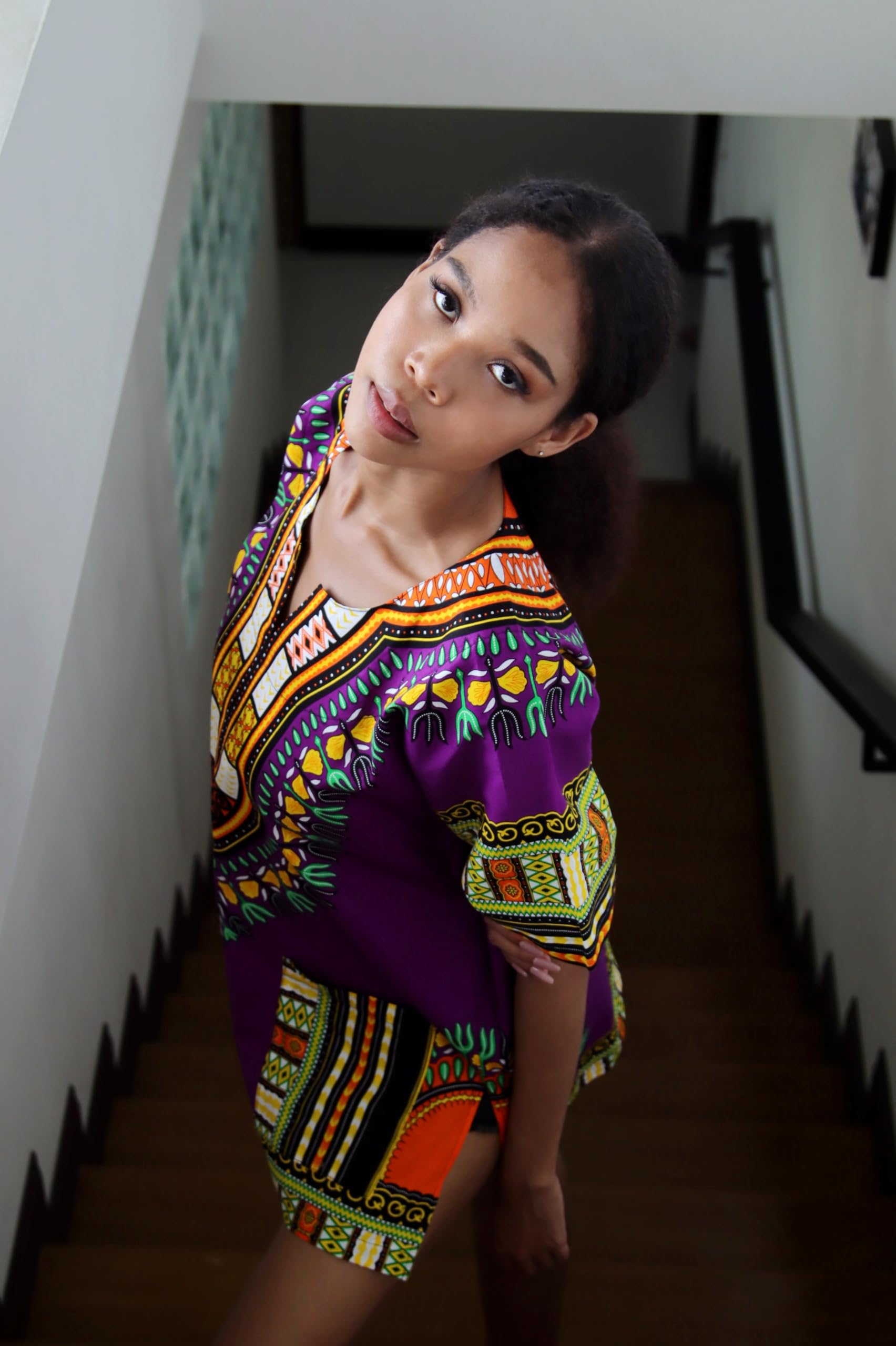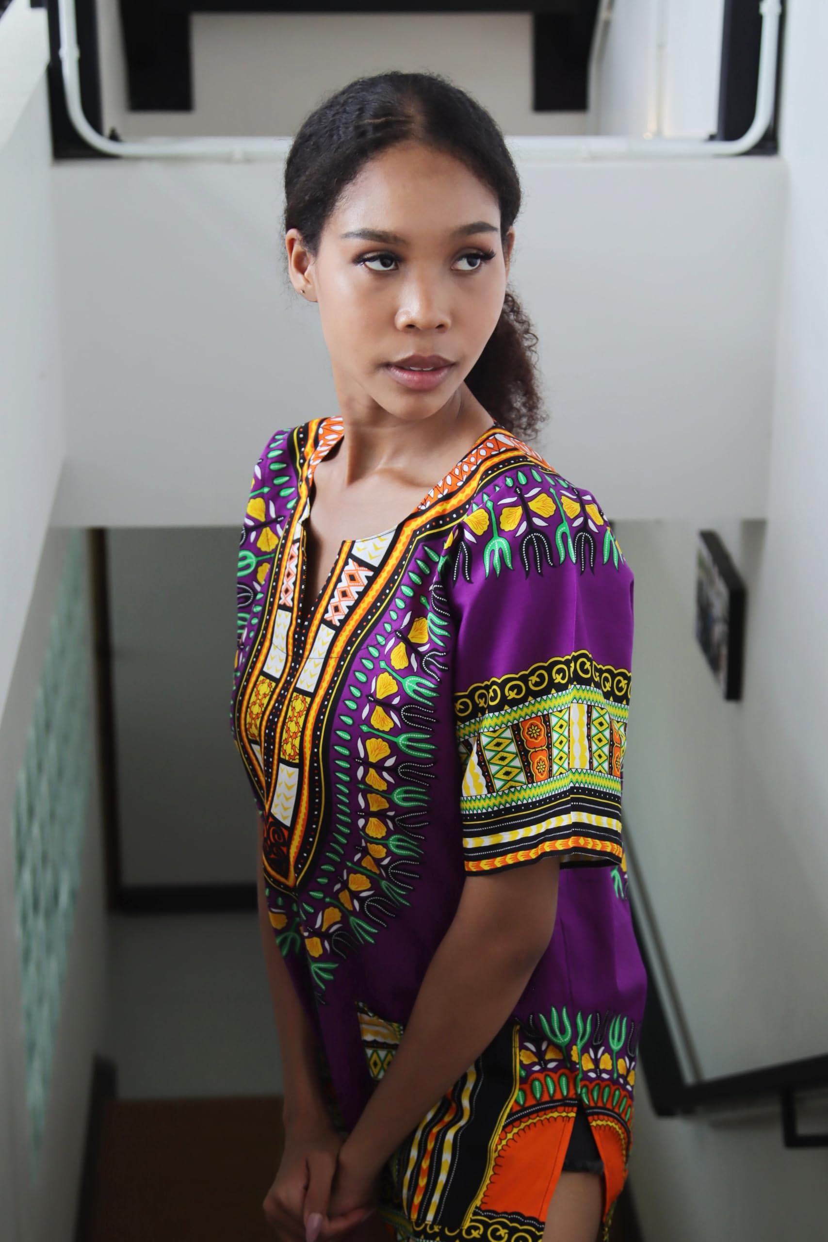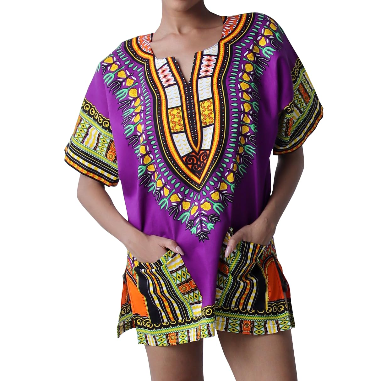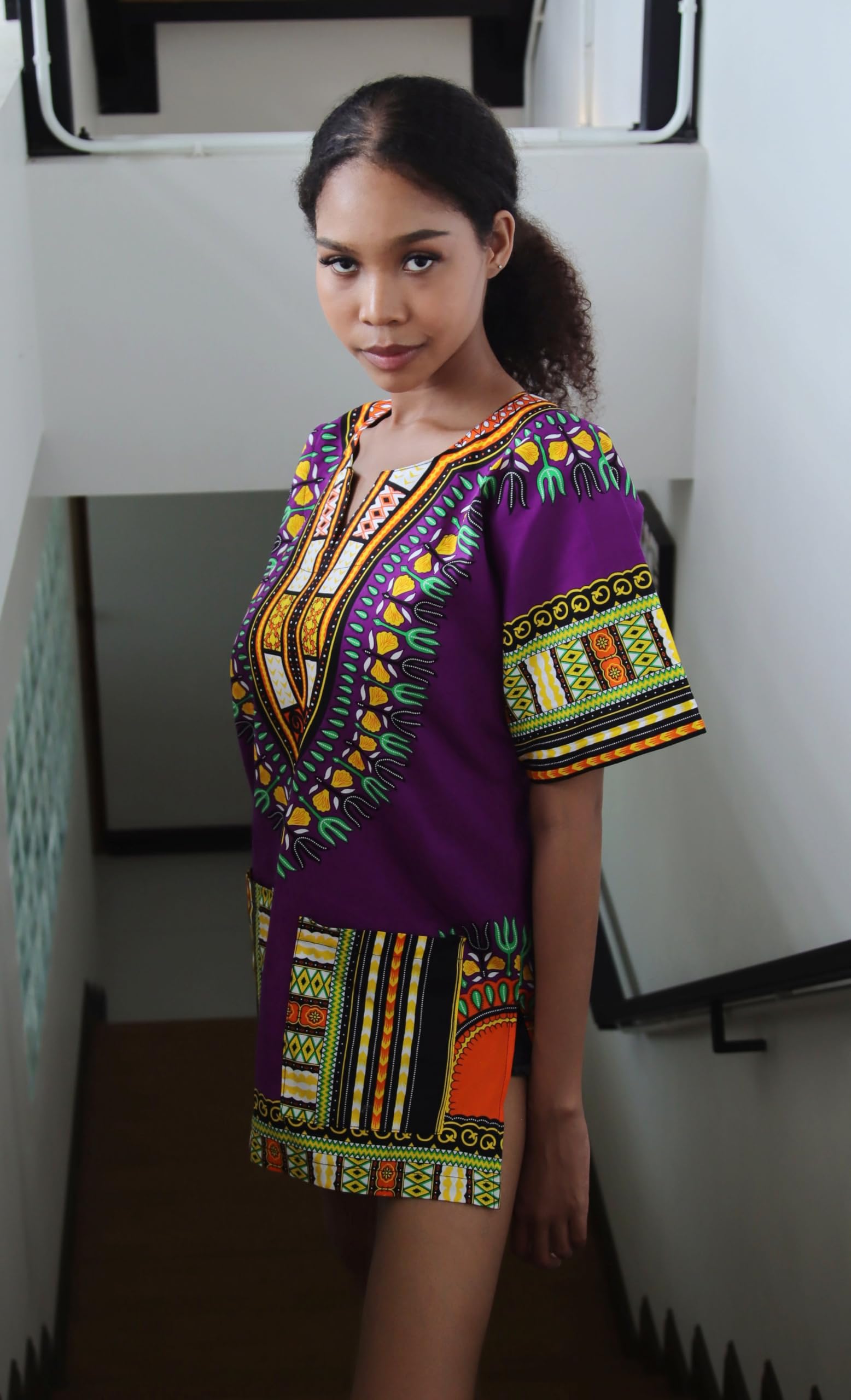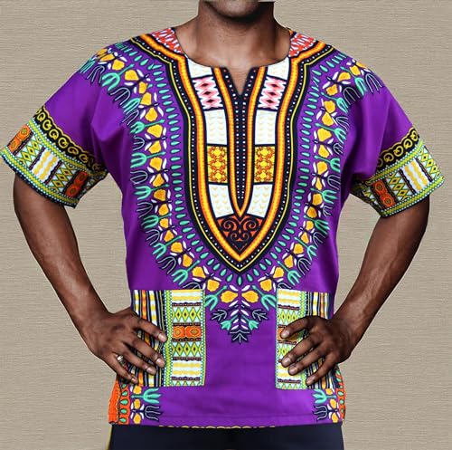 Description Genuine high quality DA'IKI brand African clothing item. Measurements: - We have sized this shirt as a loose garment (does not hug the body), from our measurements allow extra room for movement. - Given sizes are approximations only, exact measurements may vary. - Size tags sometimes do not match the advertised size. - To compare sizes take a similar item of your own that fits well and lay it flat, smooth it out and use a tape measure to measure straight across, making sure the tape measure is tight. - Bust and shoulder measurements are obtained by measuring once across and then doubling this measurement. - Length is from the highest point on the shoulder to the bottom hem. X-Small Bust/Chest: 38inches (97cms) Back Height: 27inches (69cms) Small Bust/Chest: 42inches (107cms) Back Height: 29inches (74cms) Medium Bust/Chest: 46inches (117cms) Back Height: 30inches (76cms) Large Bust/Chest: 49inches (124cms) Back Height: 32inches (81cms) X-Large Bust/Chest: 52inches (132cms) Back Height: 33inches (84cms) XX-Large Bust/Chest: 56inches (142cms) Back Height: 33inches (84cms) 3X-Large Bust/Chest: 59inches (150cms) Back Height: 33inches (84cms) Fabric: Dashiki Cotton Print Beautiful bright vivid prints on quality tight woven cotton perfect for summer.
