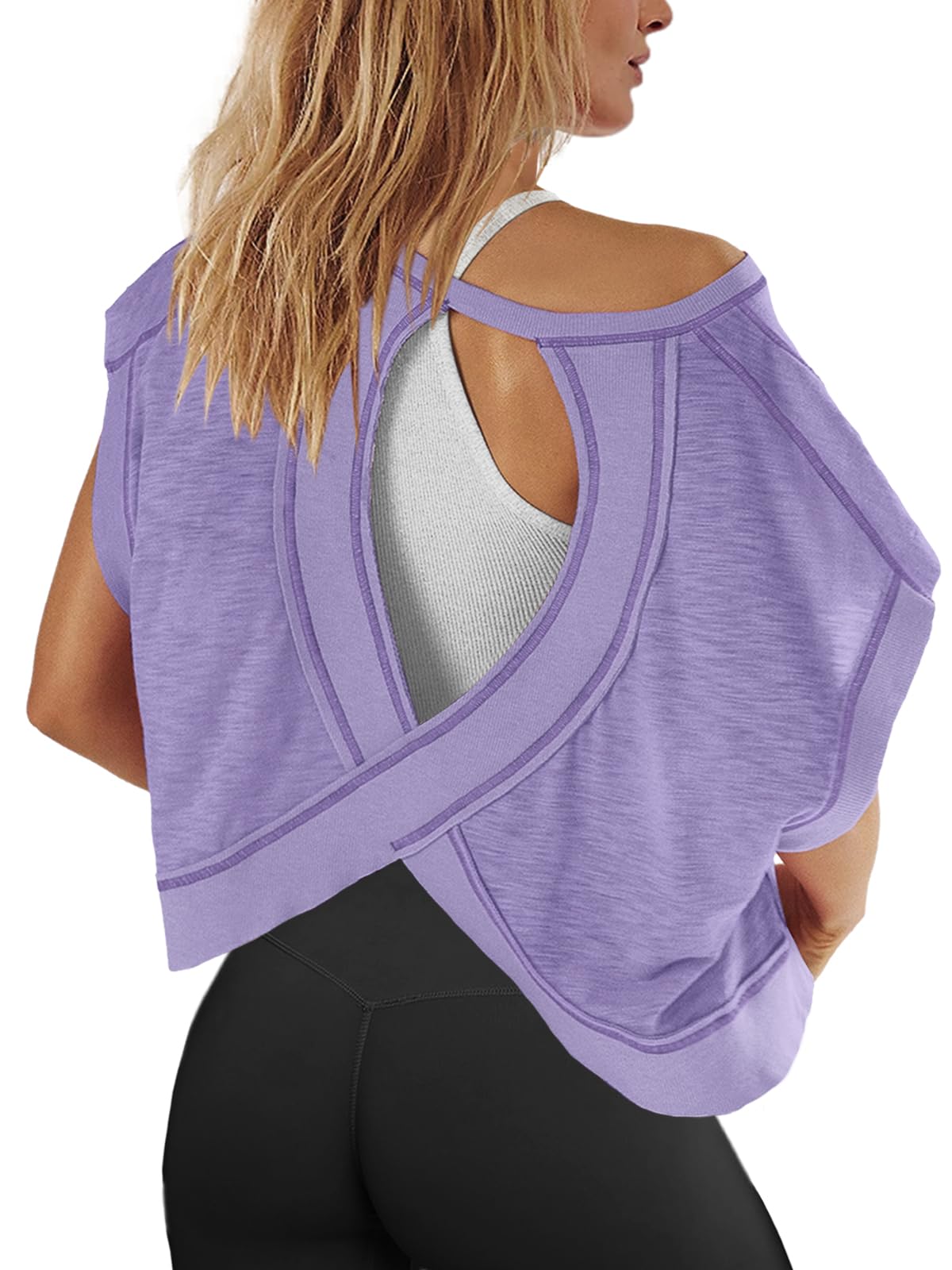 Feature: The open back tee for women is trendy and comfy, perfect for daily wear. This athletic tee shirts features a relaxed fit, a timeless wide neckline, slight crop,as well as open-cut back and ribbed wrist detail, all of which contribute to an elegant and cute look.