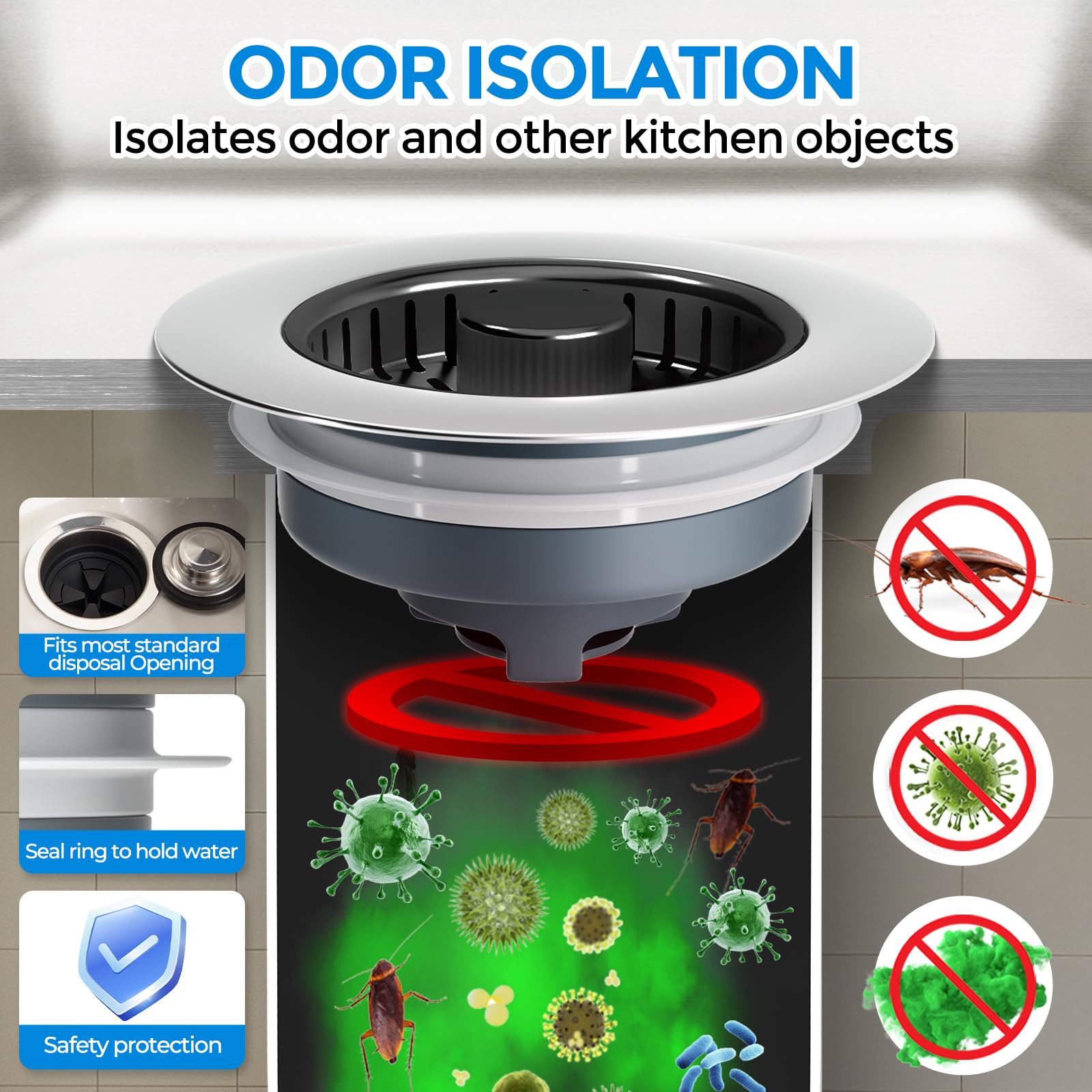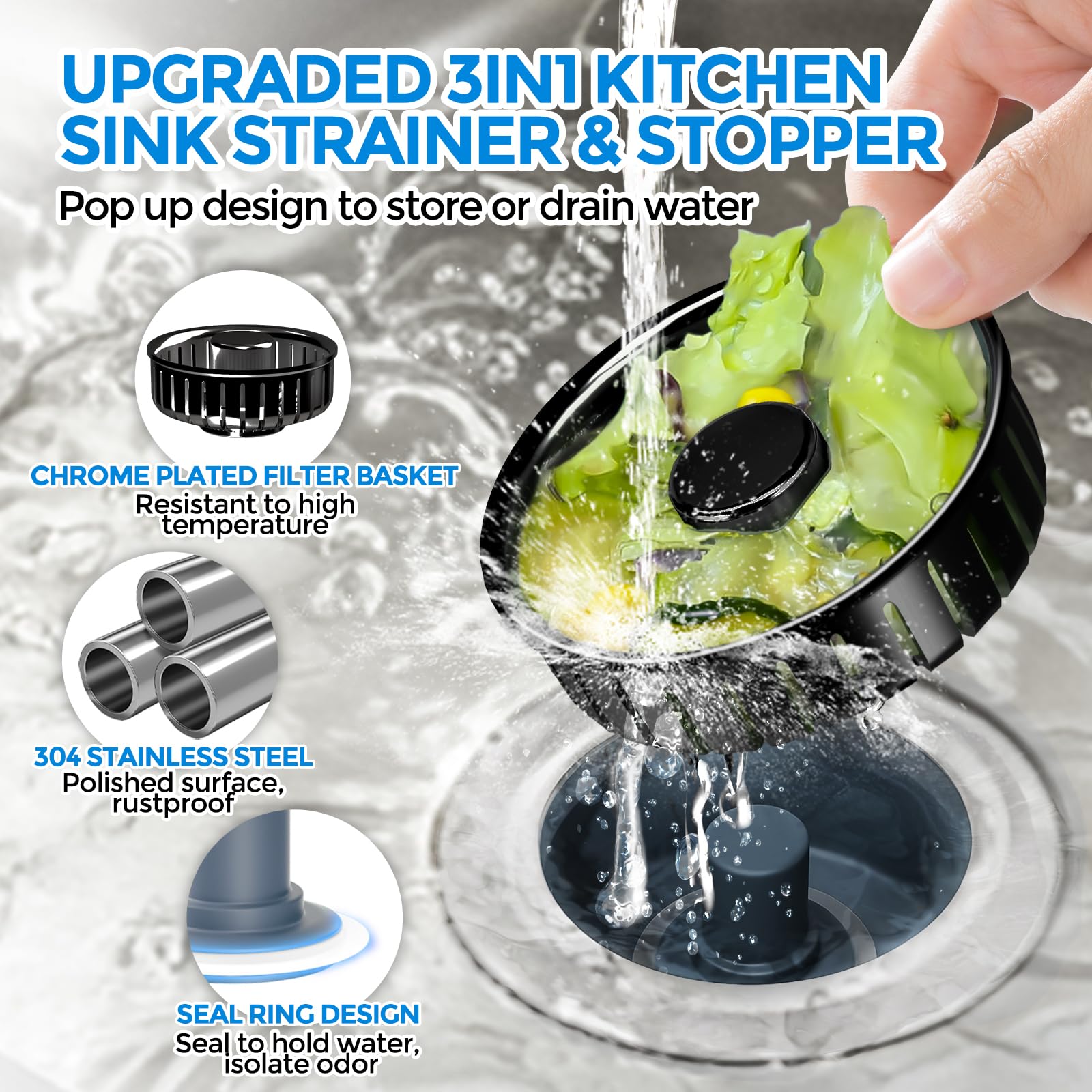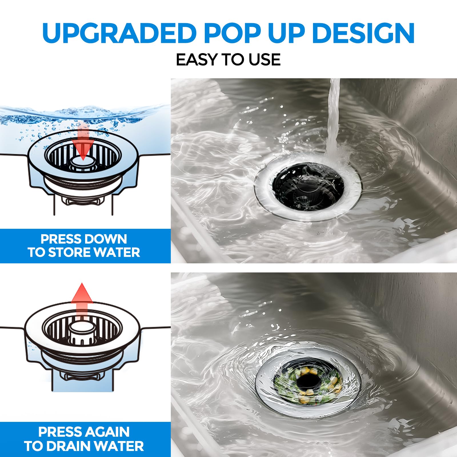【Upgraded 3 in 1 Kitchen Sink Drain Strainer】Our kitchen sink strainer, combines sink drain strainer, kitchen sink stopper and odor isolation together. Press down the pop up button to store water for washing, press again to drain water while catching food waste or scrap from going down the drain. A reliable anti clogging helper and a must have kitchen sink installation parts
