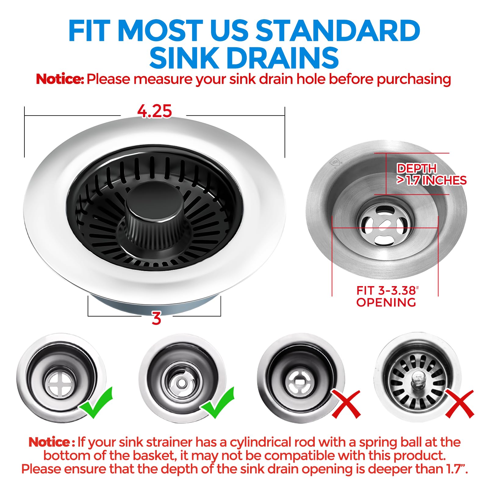 【Universal Compatibility to US Standard Sink Drains】This kitchen sink stopper measures 3"-3.38", fit most US standard 3-1/2 inch drain hole. Please measure your sink drain hole size before purchasing