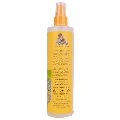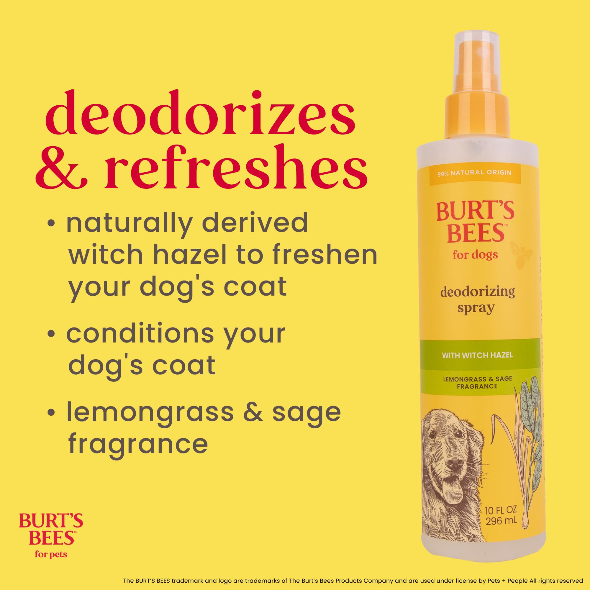 Since 1984, Burt’s Bees has been working with nature to create products that nourish your skin. With the same mission in mind, we created a custom formulated range of dog shampoos to bring the same quality to the lives of our pets. Burt’s Bees™ for Pets™ Deodorizing Dog Spray leaves your pet clean while it nourishes and moisturizes their skin and coat. Leveraging the power of naturally derived ingredients, witch hazel cleans and deodorize the coat while honey acts as a conditioner and regulates the delicate pH unique to pets, delivering a high shine finish. Lemongrass and sage fragrance lightly refreshes your pup's fur. All our dog grooming products utilize a minimum 95%+ natural origin formulas and are formulated without chemical detergents, phthalates, parabens, or sulfates. Our dog shampoos are also formulated without added colorants and dyes. Burt’s Bees naturally derived pet grooming solutions keep pets clean and pet parents happy! Our doeorizing dry dog shampoo is cruelty-free and made in the USA with global ingredients, using 80% post-consumer recycled bottles and responsible sourcing. We choose to formulate without harsh chemicals, while ensuring 95%+ natural origin formulas, pH balanced to effectively cleanse and nourish your pet. A good shake before each use is required. Directions: Shake well before use. Spray from back to head, carefully avoiding eyes and ears. *Nielsen Total Pet Plus Stores Pet Grooming Shampoo/Conditioner L52 W/E 10-11-25