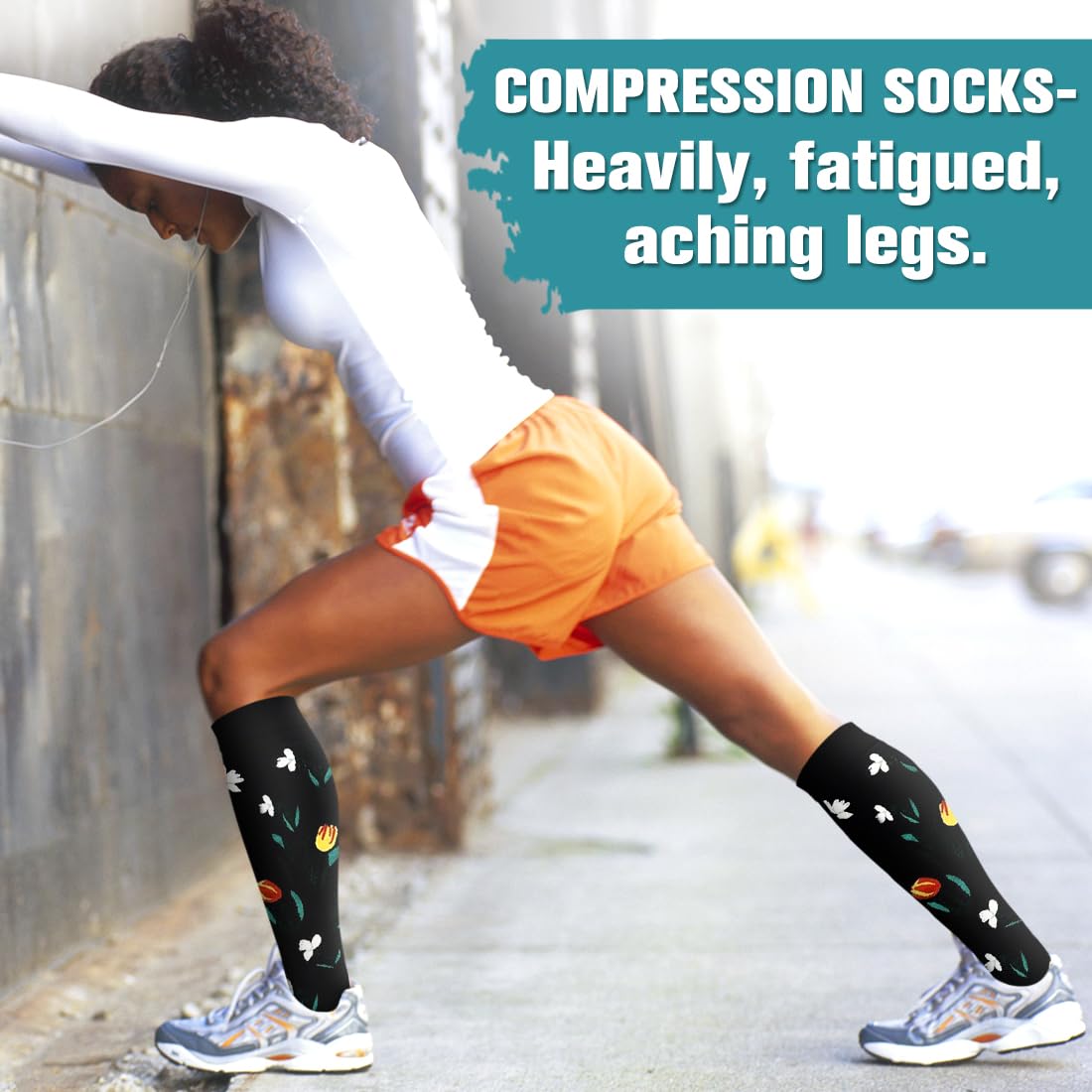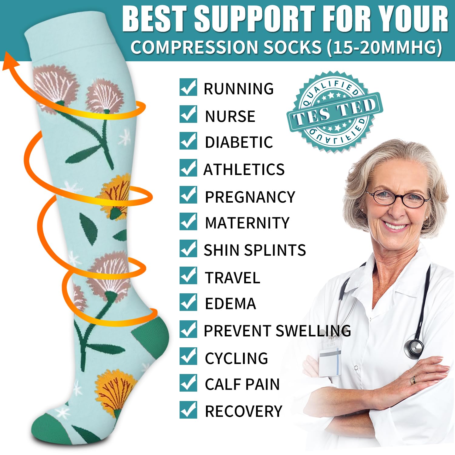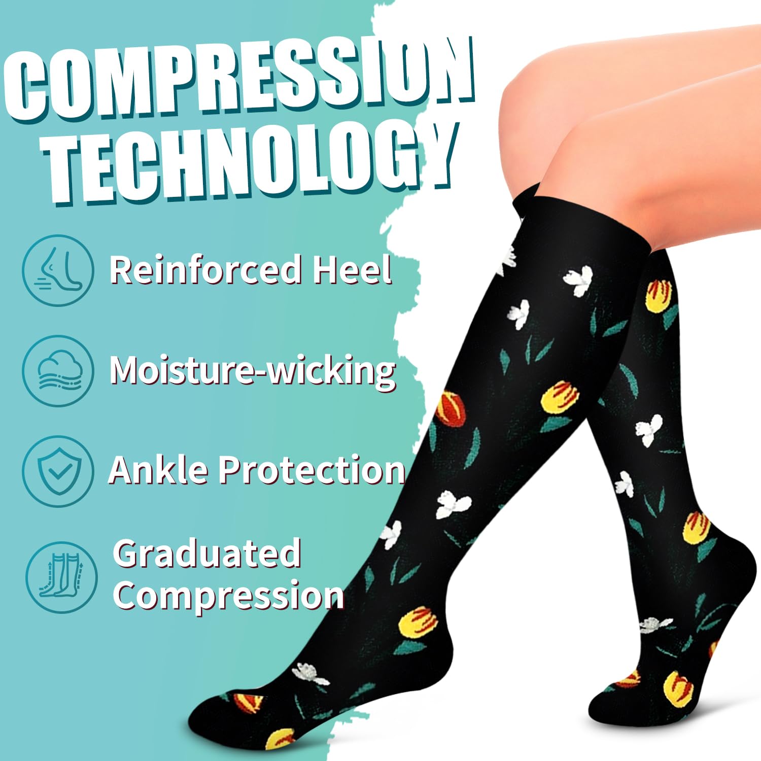 COMFORTABLE-Made from 85% Nylon and 15% Polyester.Our compression socks for women are incredibly soft,breathable,and moisture-wicking,provides a perfect composition between comfort and grip.High performance material and temperature control,keeping your muscles cool during workouts and warm during rest.It can gently wraps around feet,ankles,and legs to provide enough support to stimulate blood flow.Don't hesitate to wear compression socks for women daily.They can be a great relief!
