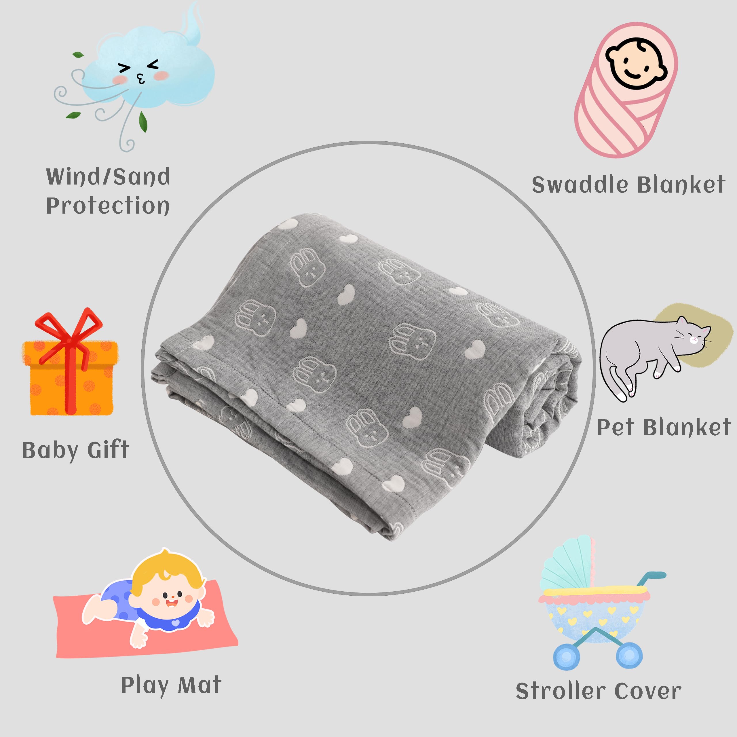 Multiple use: These muslin blankets can be used for tummy time, traveling, cuddling, stroller and car seat use, picnics, and even as a throw blanket.