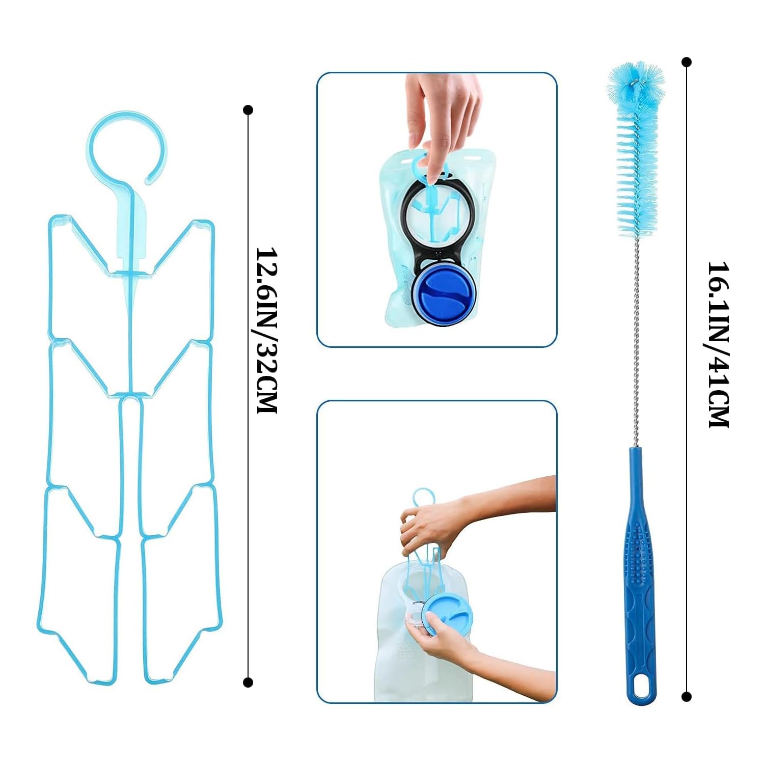 Powerful Function: Hydration Pack Cleaners Contains: 1 x bigger brushes, 1 x small brushes, 1 x flexible long tube brushes, 1 x hanging frames for drying, 1 x storage mesh bags, universal for most hydration reservoir cleaning