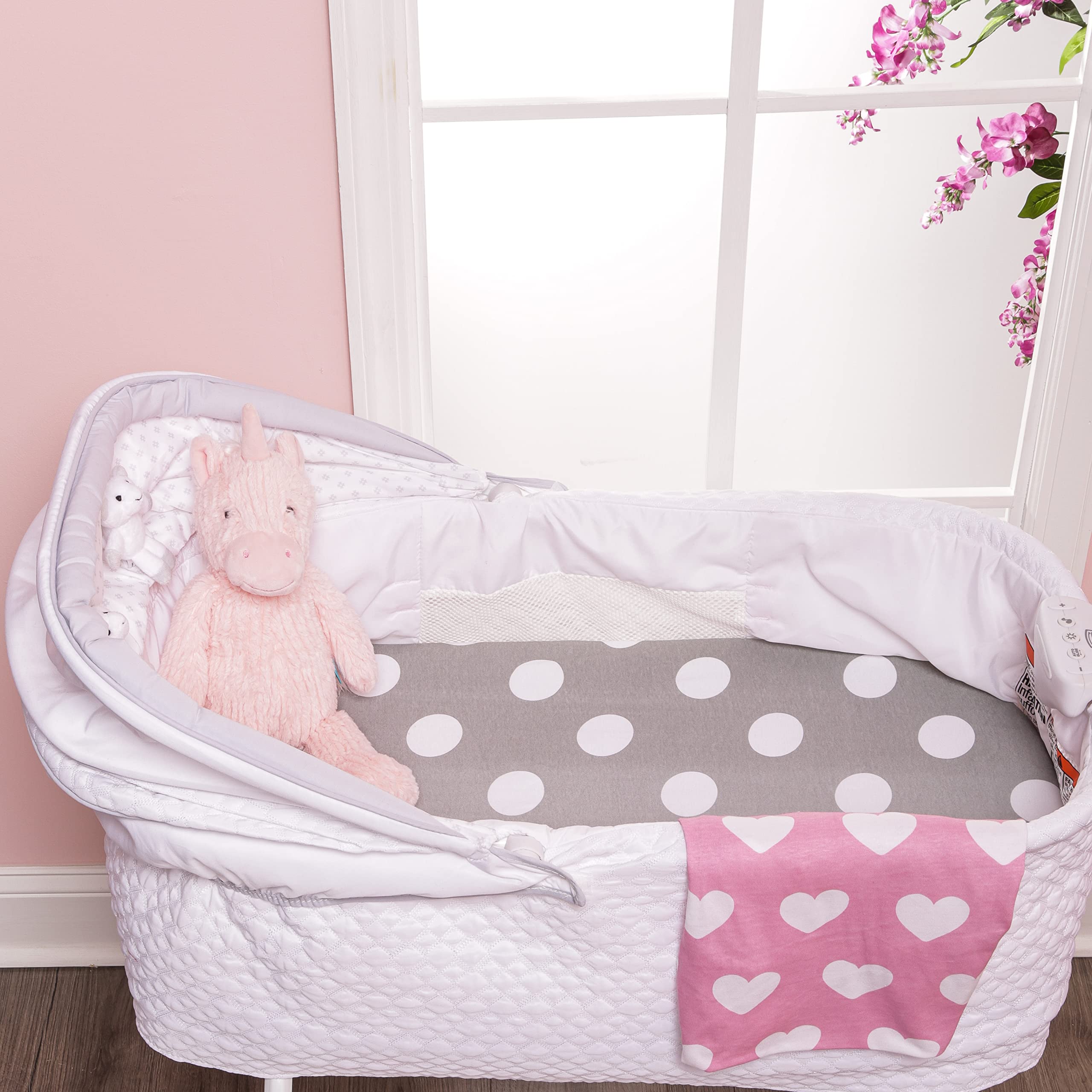 COLORS AND DESIGNS BABIES LOVE: In pink, gray and white colors, the hearts and polka-dot designs of these baby sheets for a baby girl are colorful and easily blend with girl nursery themes!