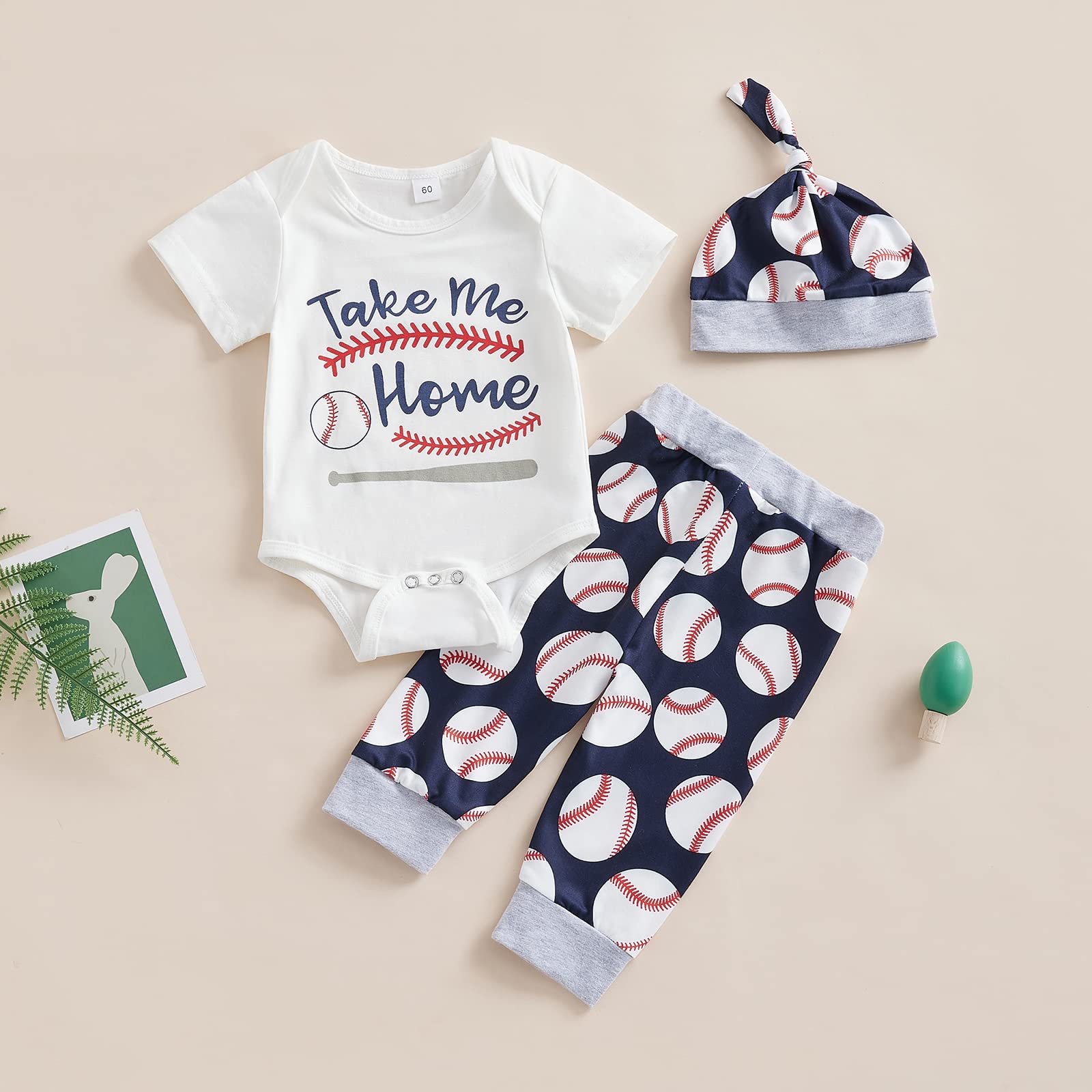 ⚾【Designs】Baseball outfits for baby boys,newborn baby boy clothes summer,baby boy going home outfit newborn.''Take Me Home''/''new player in town'' letter print short sleeve romper bodysuit,baseball romper baby boy,match long baseball pants with baseball hat.3Pcs baseball baby outfit,baseball baby clothes,baby boy coming home outfit,your little boys will look more adorable in it.