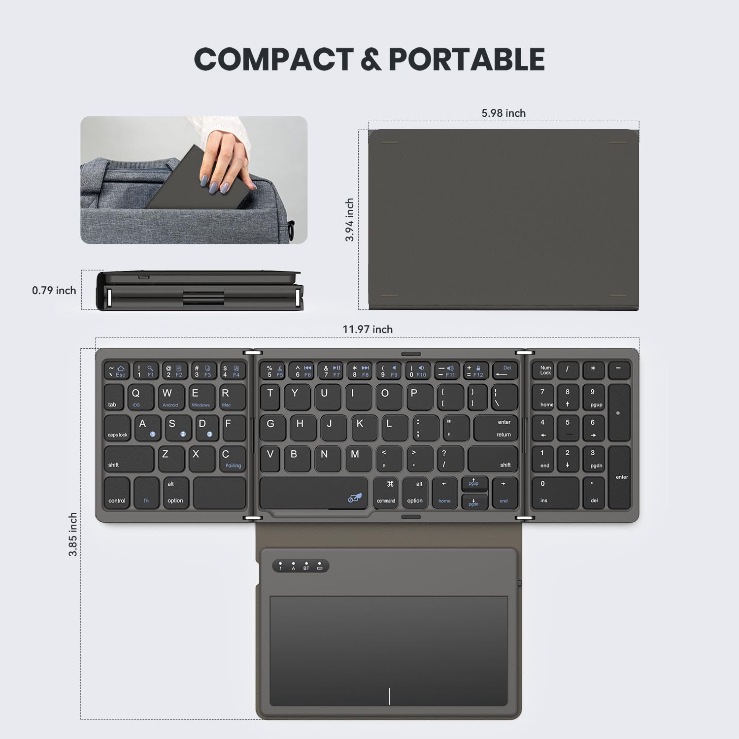 【Triple-Folding Portable Bluetooth Keyboard】Fold it in slide into your work bag or simply stash in your carry-on for business trips. Wherever work takes you, enjoy familiar desktop-style typing on bluetooth keyboard with number pad and a touchpad surface 20% larger than previous models. Navigate screens and multitask efficiently without packing a separate mouse