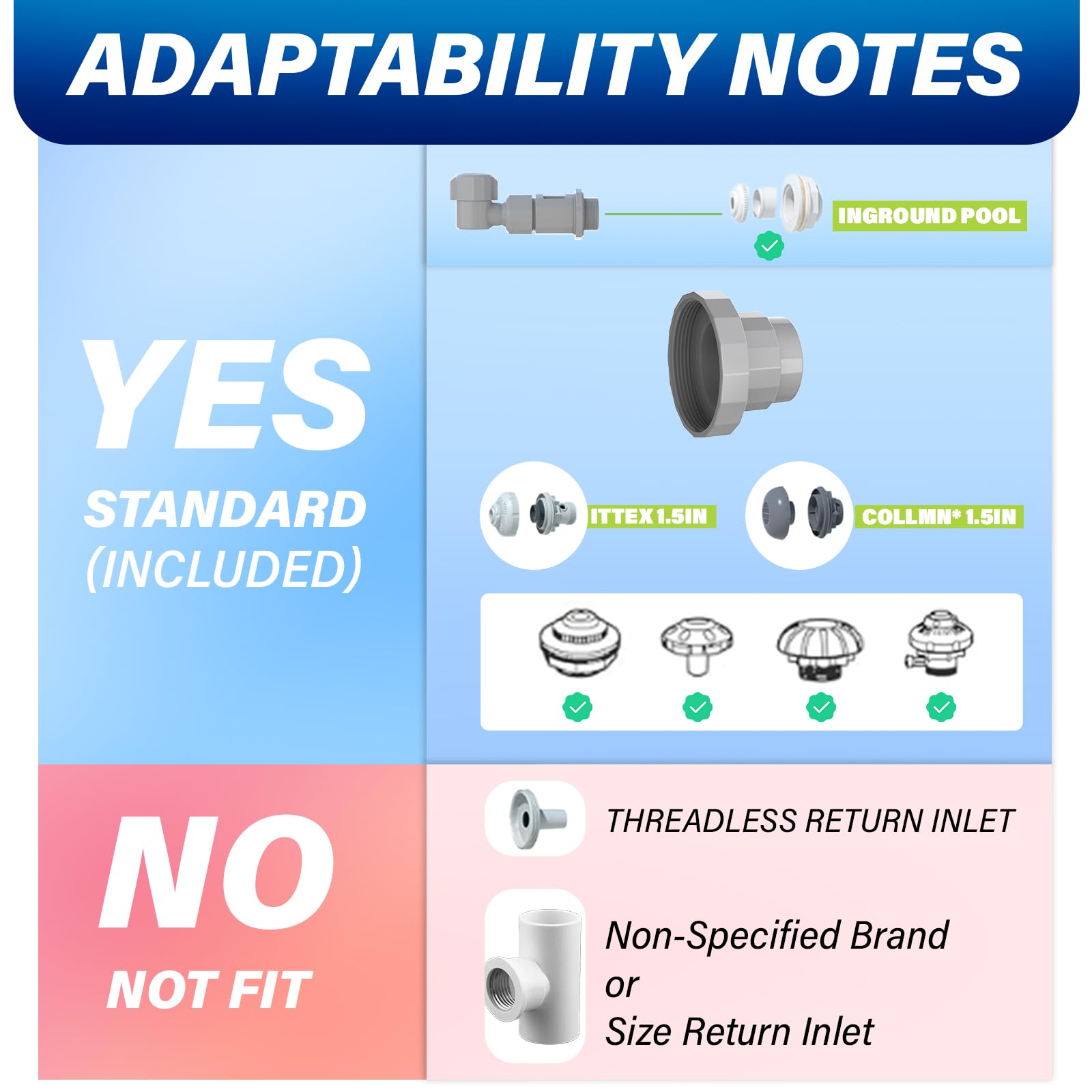 NOTE!: Designed for compatibility with In-Tex, Bestway, Hayward, and Coleman pools. Prior to use, please confirm proper connection alignment. Maintain a clean pool environment by removing floating debris, as accumulation may obstruct the fountain outlet and impede water flow. Should flow reduction occur, inspect the outlet for potential blockages.