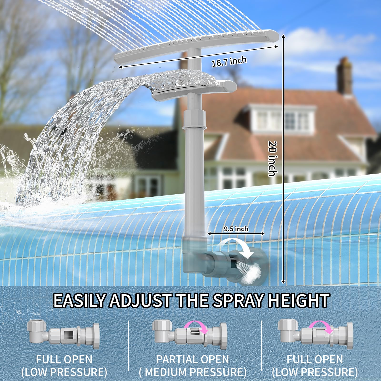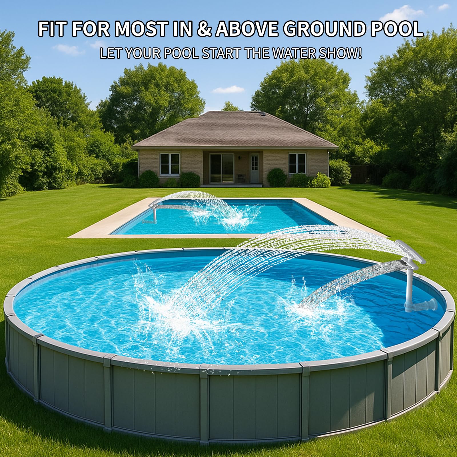 ✔[Customizable Water Fun] The 360° swivel T-shaped pool fountains for above ground pools/inground pools ensures controllable waterfall direction & height, allowing you to customize your pool experience—from a gentle massage to lively water play. The side valve allows precise control of water pressure and spray height, ensuring optimal flow for any pool shape. Great for relaxation or family fun!