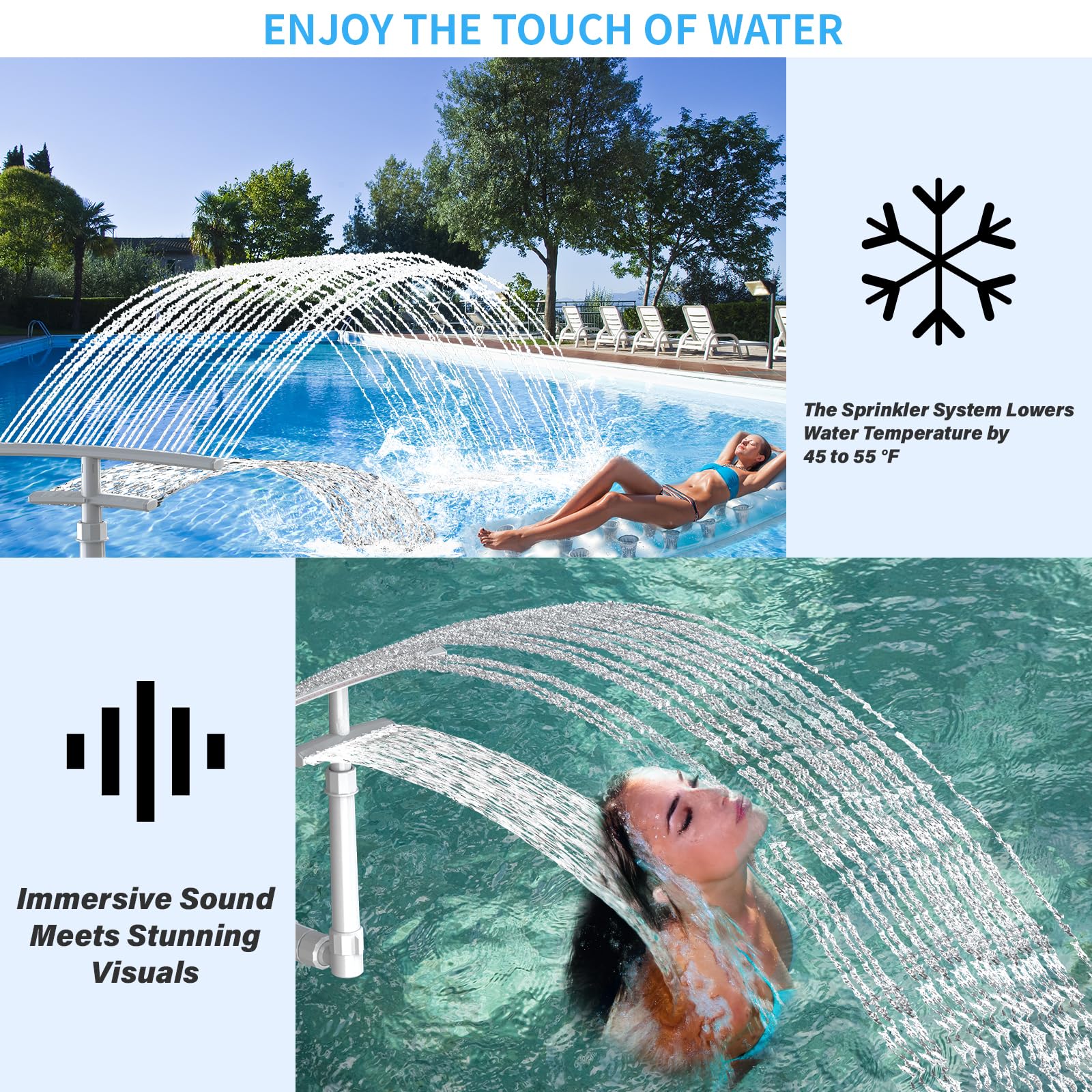 ✔[Natural Pool Cooler] Beat the summer heat with comfortably cool water! Our pool waterfall acts as an efficient pool chiller, reducing water temperature by up to 45–55℉ for your above & in-ground pools. The Dual-Layer Spray and cascading waterfall maximize evaporative cooling. Plus, it prevents stagnant water and promotes healthy circulation, keeping your pool crisp and clear all season long.