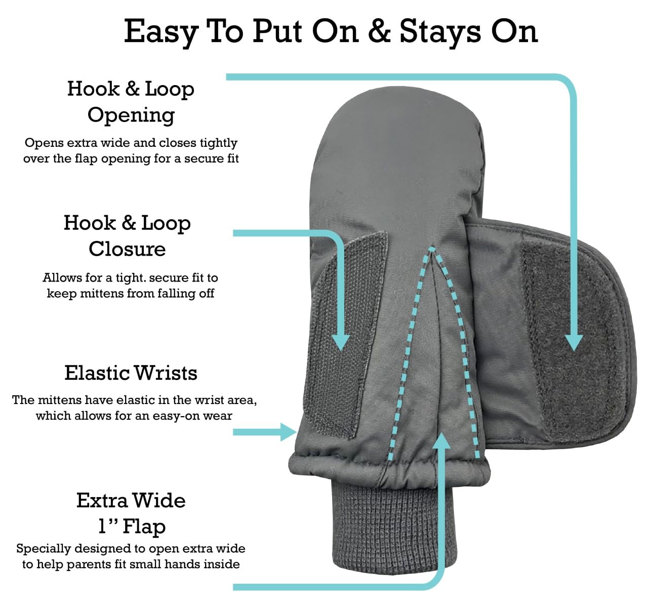 KIDS MITTENS THAT ARE EASY TO PUT ON: The snow mittens are specially designed with a large flap that opens extra wide and there is elastic in the wrist area, which allows plenty of room to fit small hands inside and to find the thumb holes. The hook and loop closure allows for a tight, secure fit. These are great for first-time mitten wearers and little boys, girls, toddlers and infants who love playing outside!
