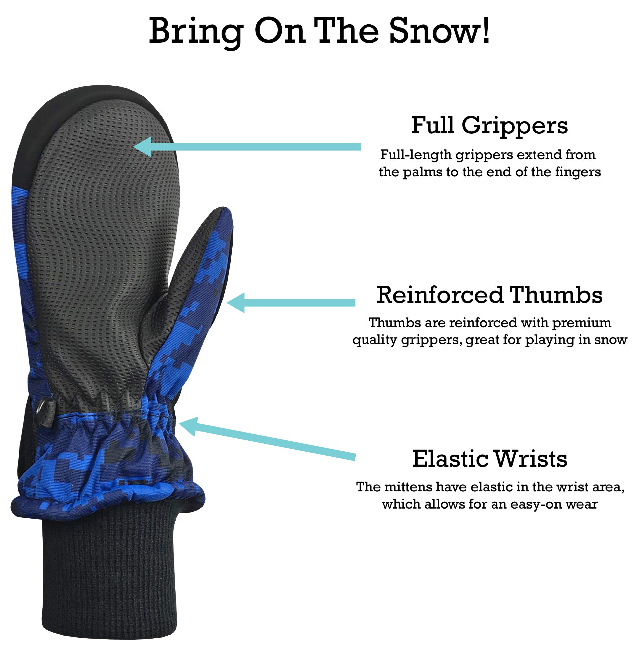 BRING ON THE SNOW! Your little girls, boys, toddlers and infants will love playing in the snow wearing these warm and high quality kids insulated winter mittens. The childrenβs winter gloves have a grippy palm area as well as grippers on the thumbs, which makes them well suited for playing in the snow and other cold weather activities.