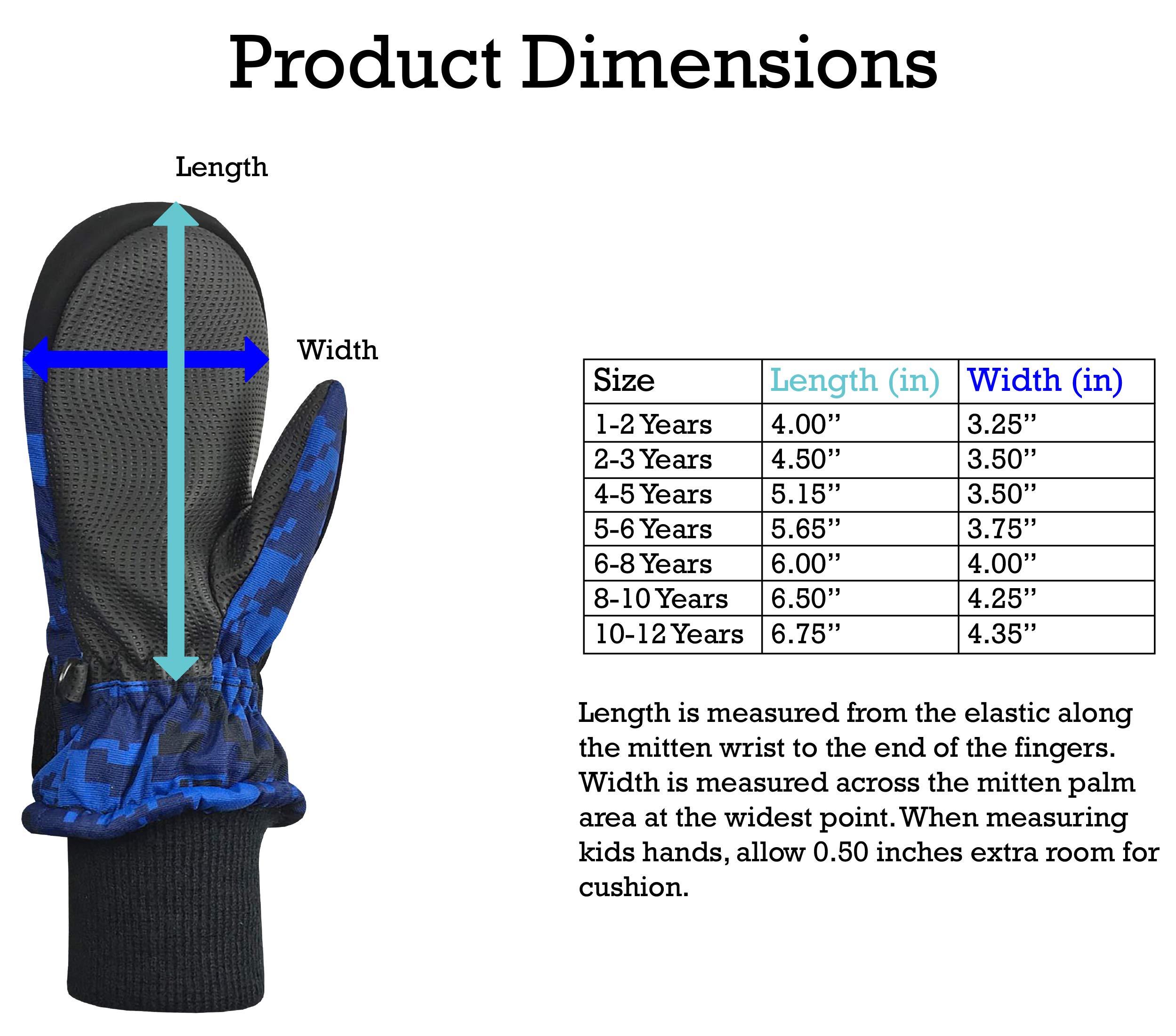 PRODUCT DIMENSIONS: Length (L) is measured from the elastic along the mitten wrist to the end of the fingers; Width (W) is measured across the mitten palm area at the widest point: 1-2 years (4.0" L, 3.25" W); 2-3 years (4.5" L, 3.5" W); 4-5 years (5.15" L, 3.5" W); 6-8 Years (6.0" L, 4.0" W); 8-10 Years (6.5" L, 4.25" W). When measuring kids hands, allow 0.5 inches extra room for cushion.