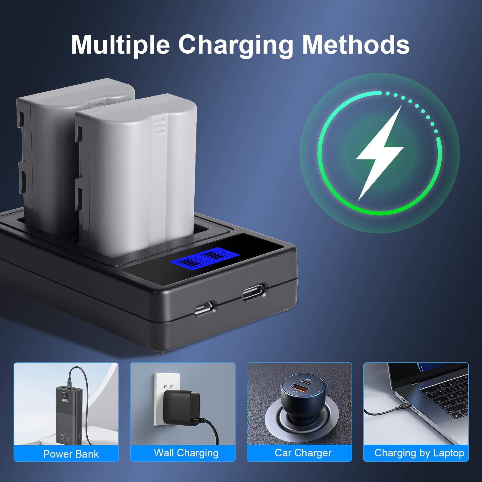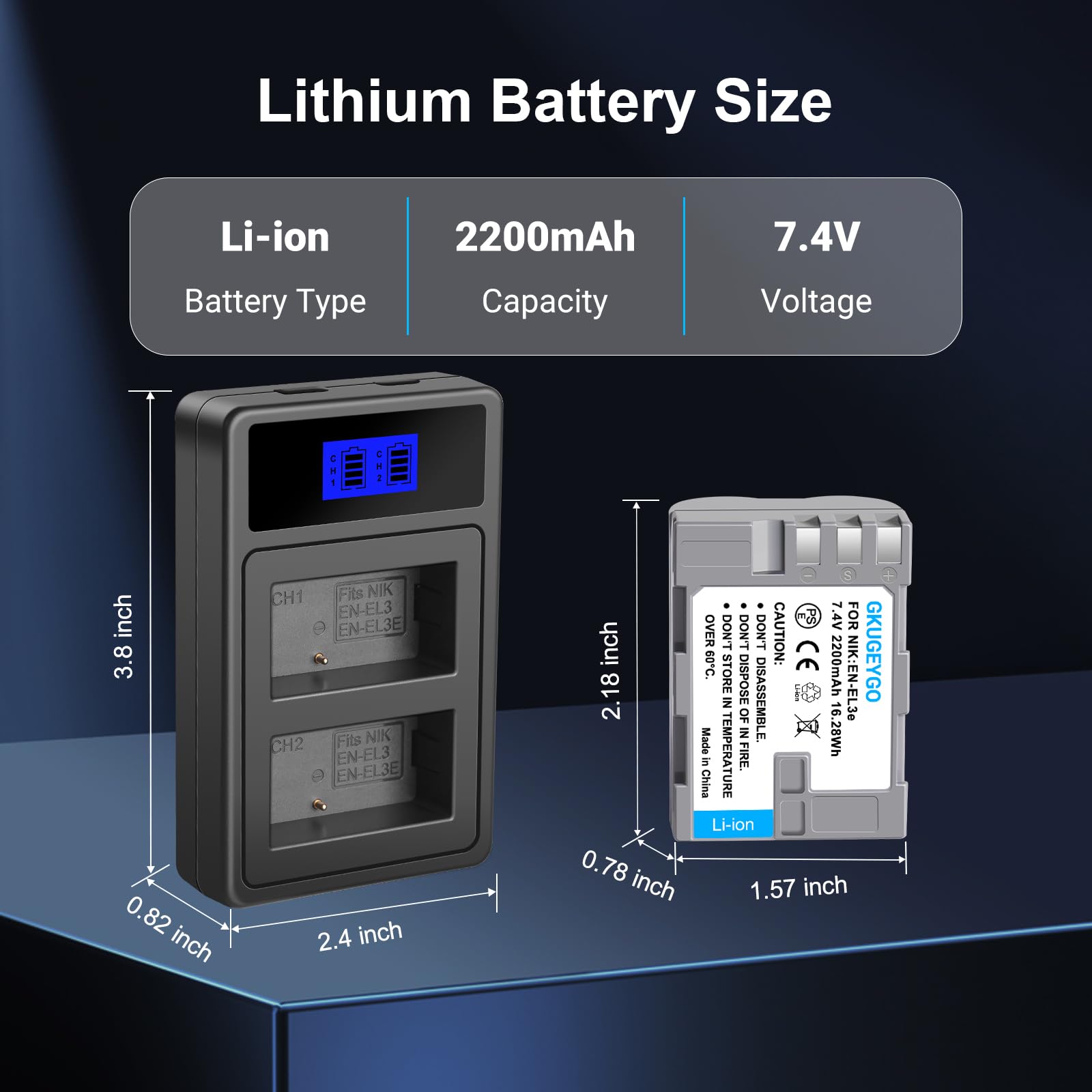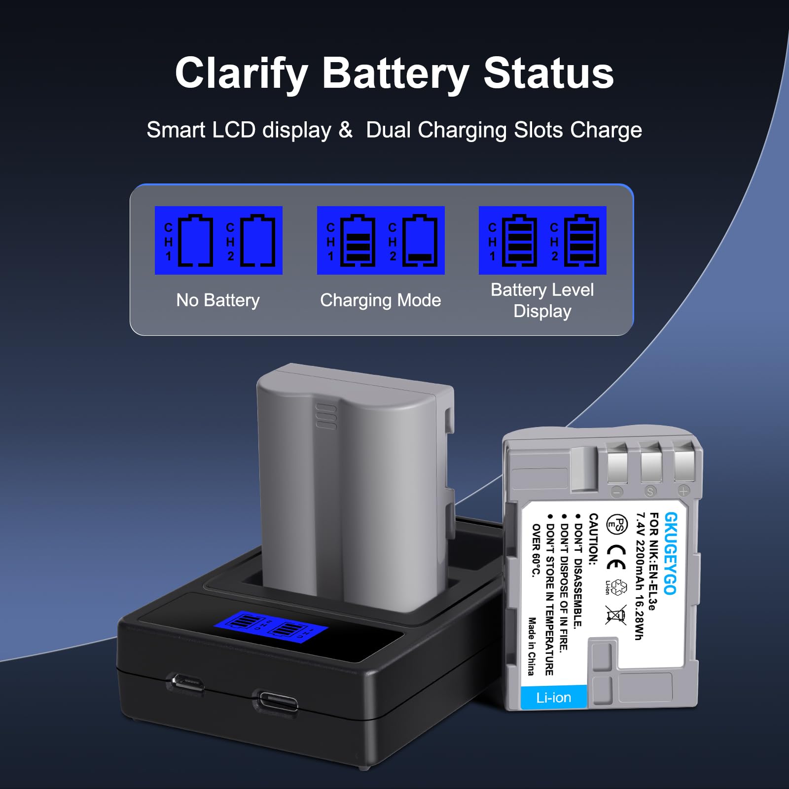 🔋Dual Slot LCD Charger: GKUGEYGO dual slot charger can charge 2 batteries simultaneously; An intelligent LCD display charger clearly shows the battery capacity, allowing you to quickly judge the battery status.