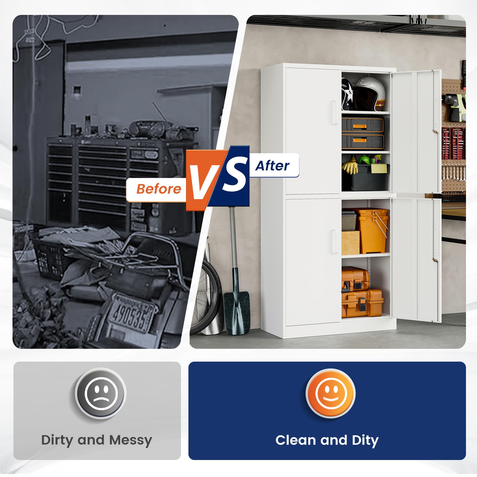 『HIGH QUALITY MATERIAL』:Whole-in-one reinforced heavy duty metal frame, load capacity up to 180lbs per shelf solid and strong.Environmental protection powder, scratch resistance and rust-resistance.Our metal storage cabinets are made of heavy gauge cold-rolled steel plate, sturdy and durable
