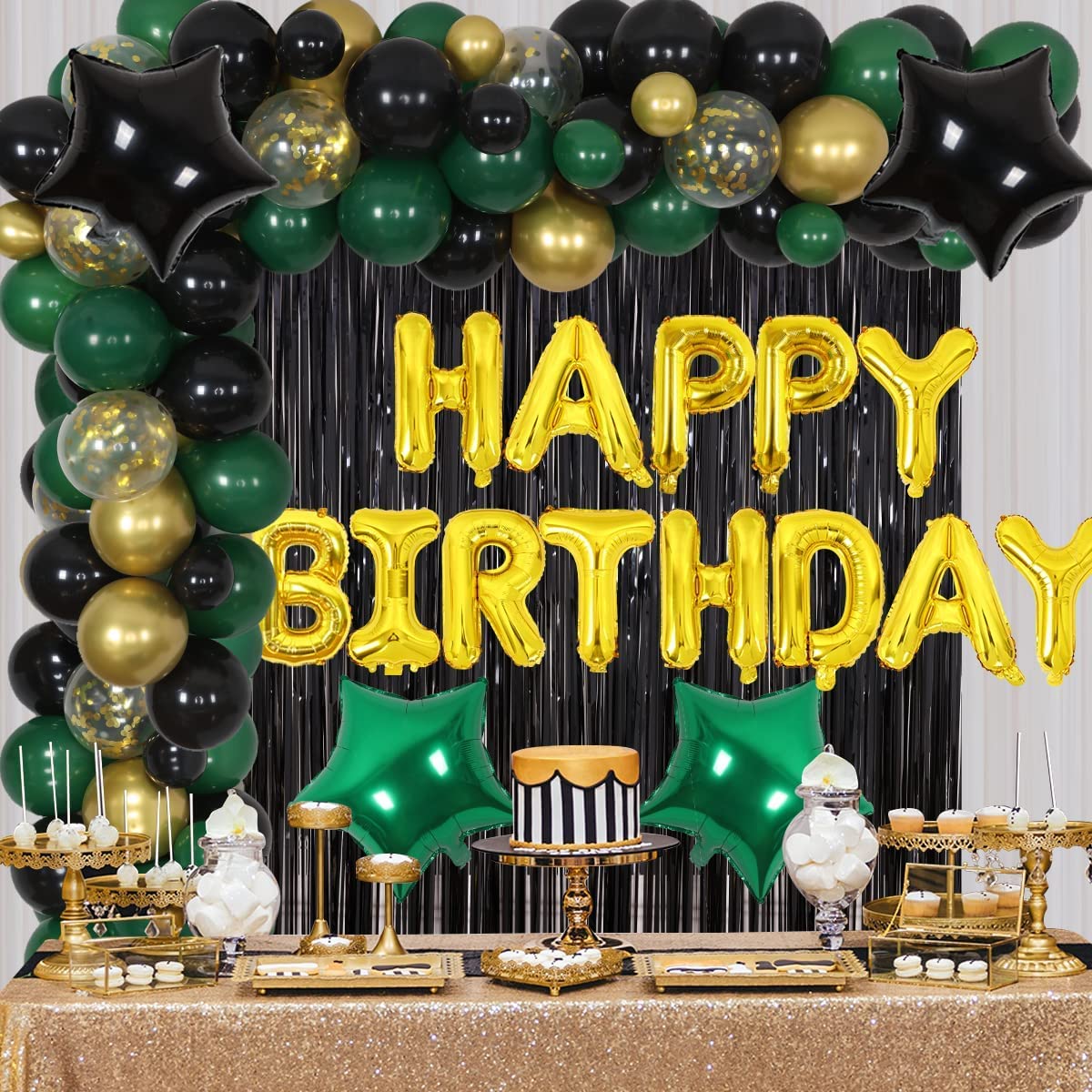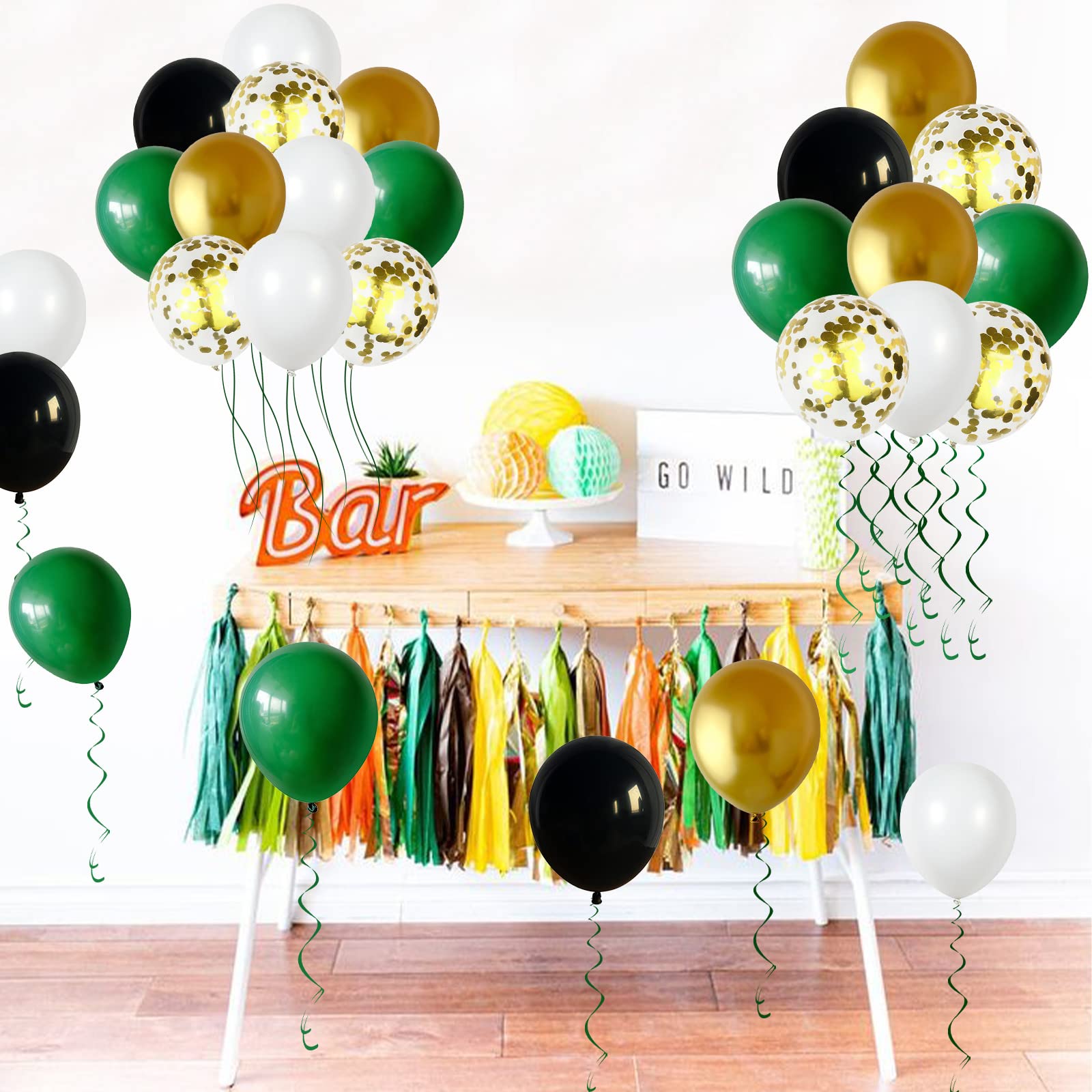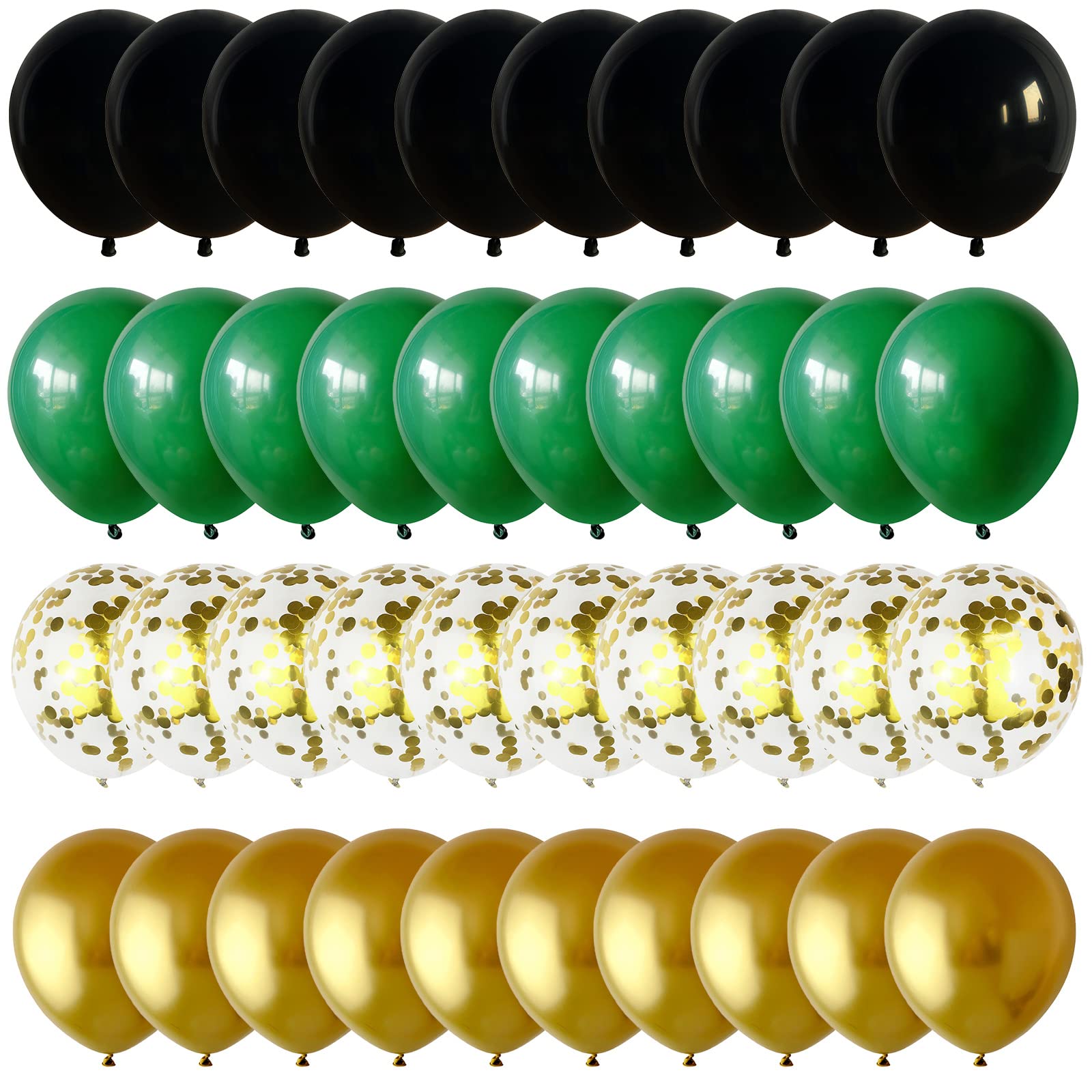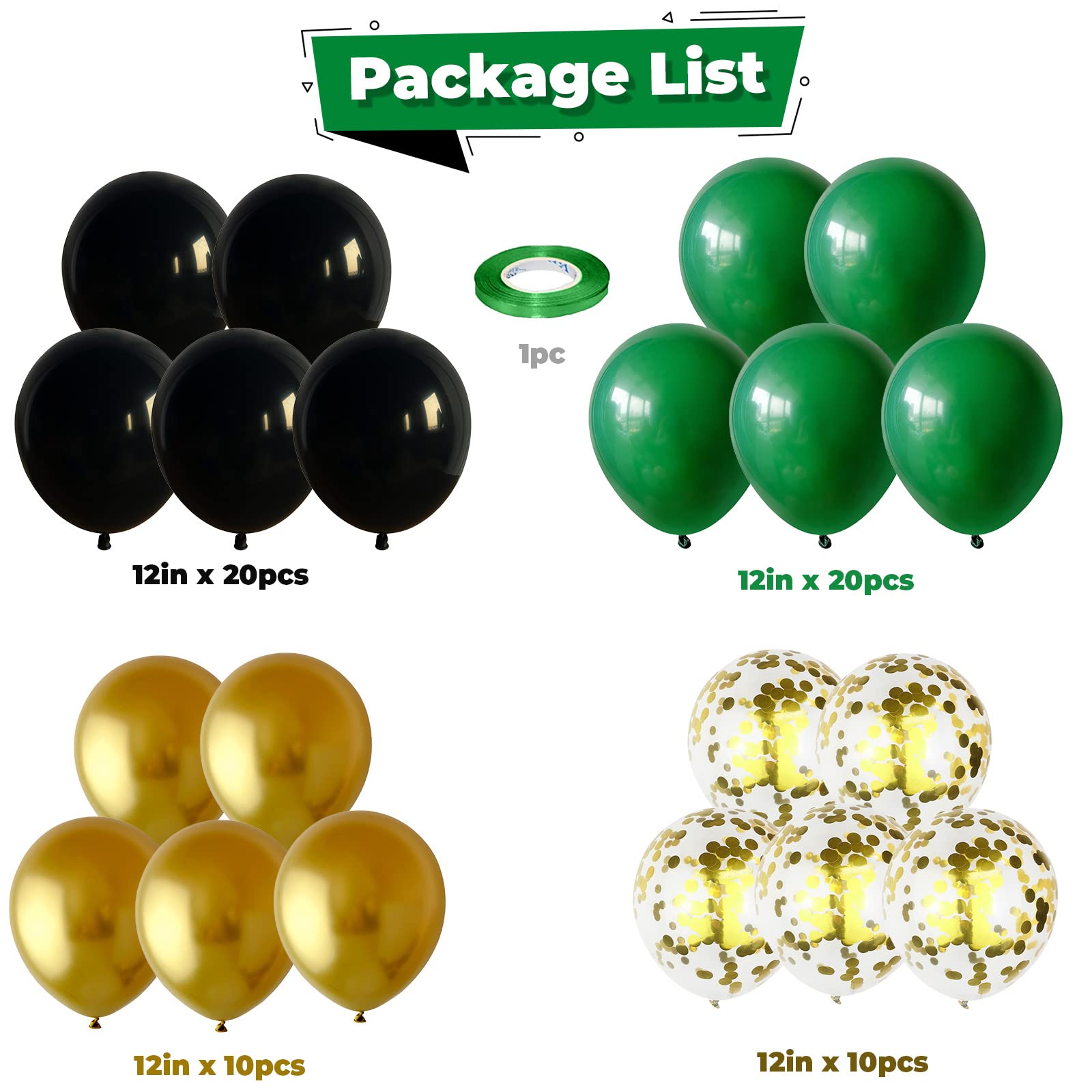 WHAT YOU GET: Black green gold balloons set includes 60pcs latex balloons: 20pcs 12inch dark green balloons, 20pcs 12inch matte black balloons, 10pcs 12inch metallic gold balloons, 10pcs 12inch gold confetti balloons, 1 roll of ribbon, ideal for making balloon garland, balloon arch