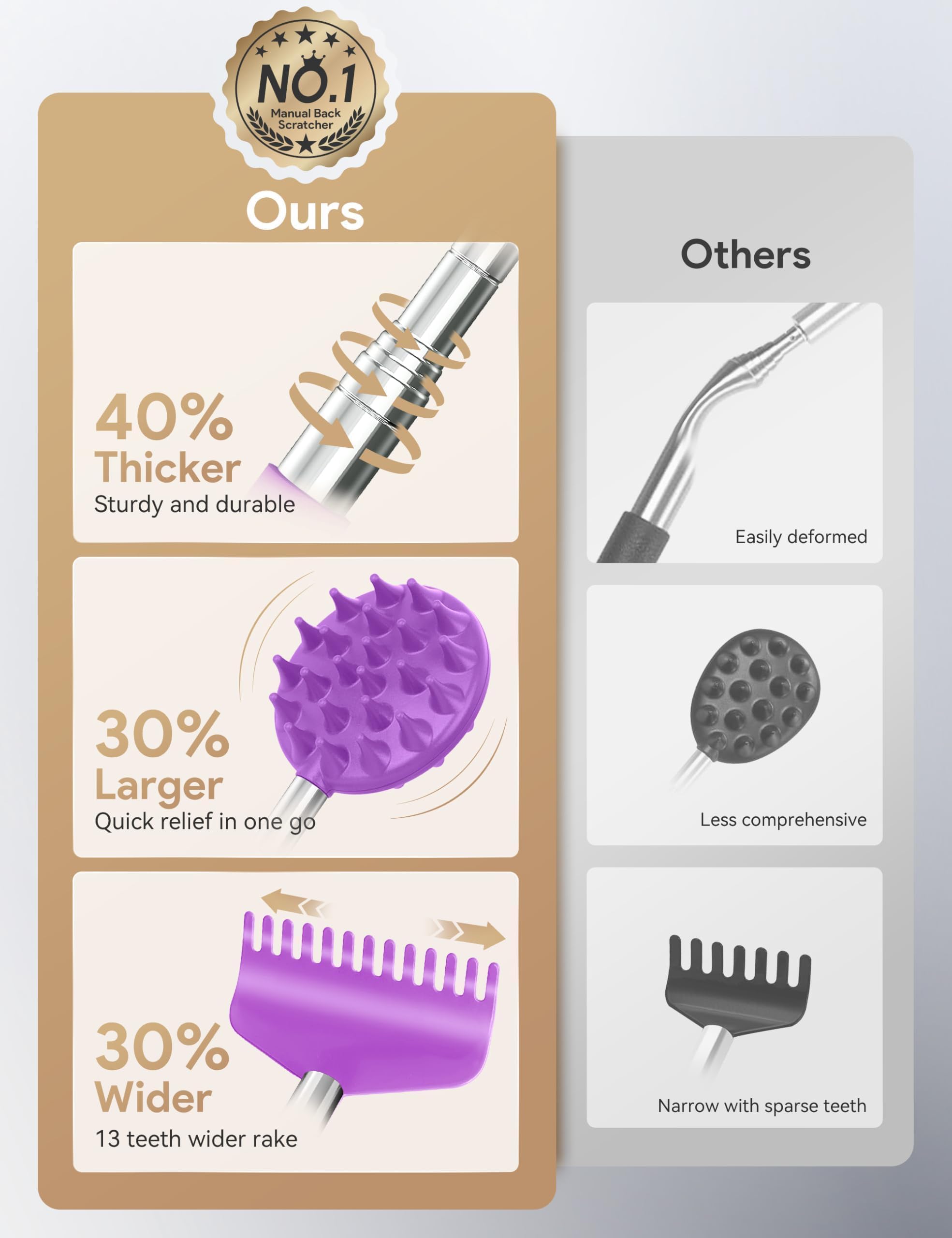 Sturdy & Lengthened Handle: 6 sections thicken stainless-steel handle specially designed enables it to reach every inch of your back and soft rubber at the handle bottom allows you to get a good and comfortable grip