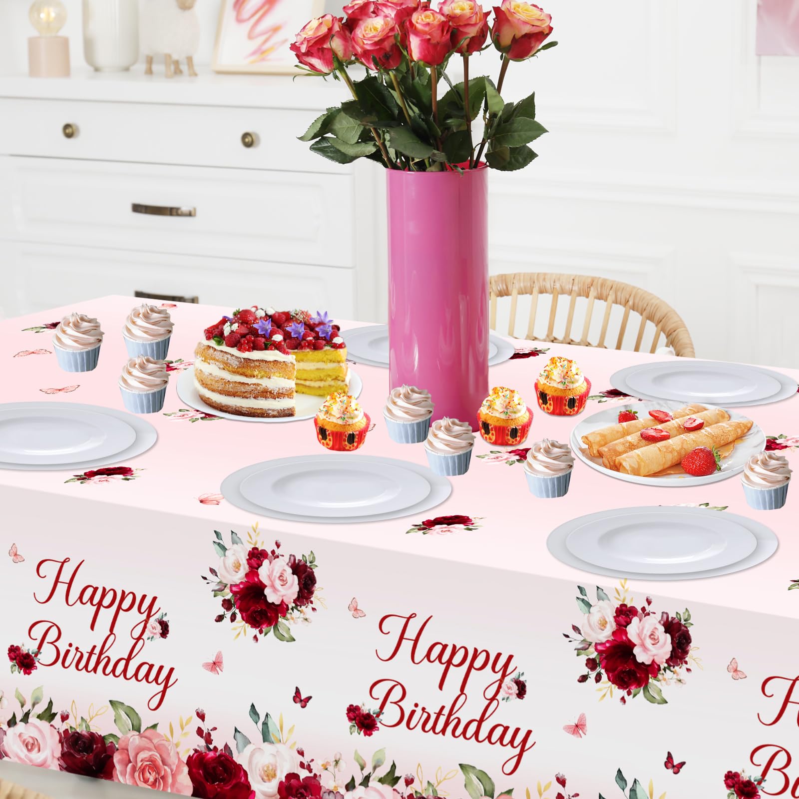 Exquisite design: The floral happy birthday party plastic tablecloth has burgundy and pink florwers pattern well printed on the tablecloth; It is very beautiful and eye-catching, adding the happy atmosphere to your birthday party