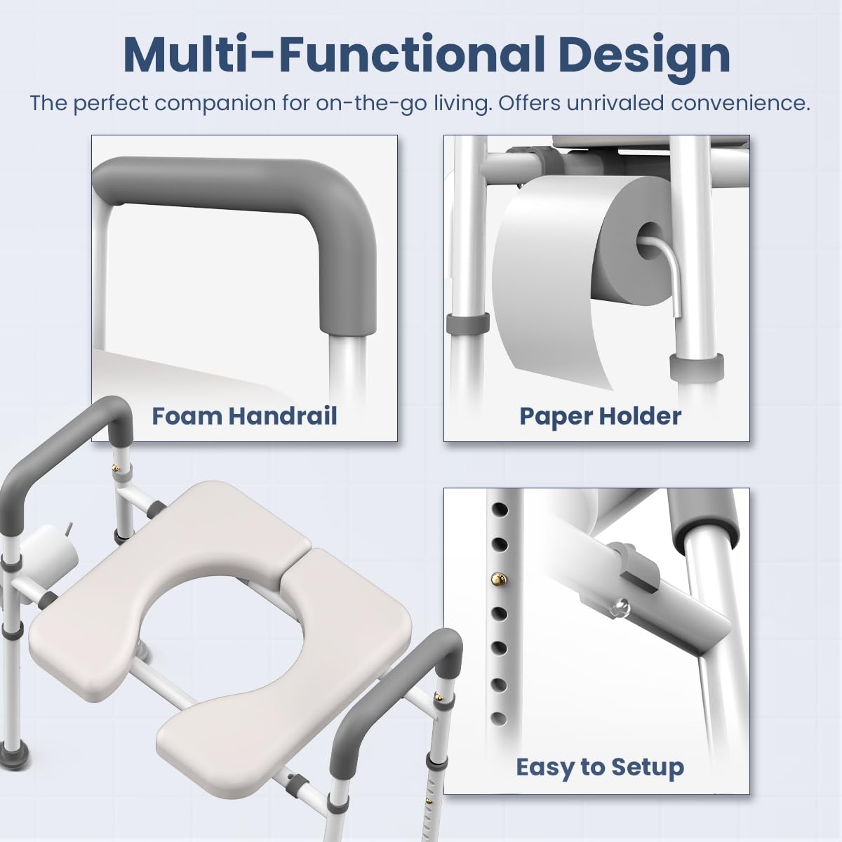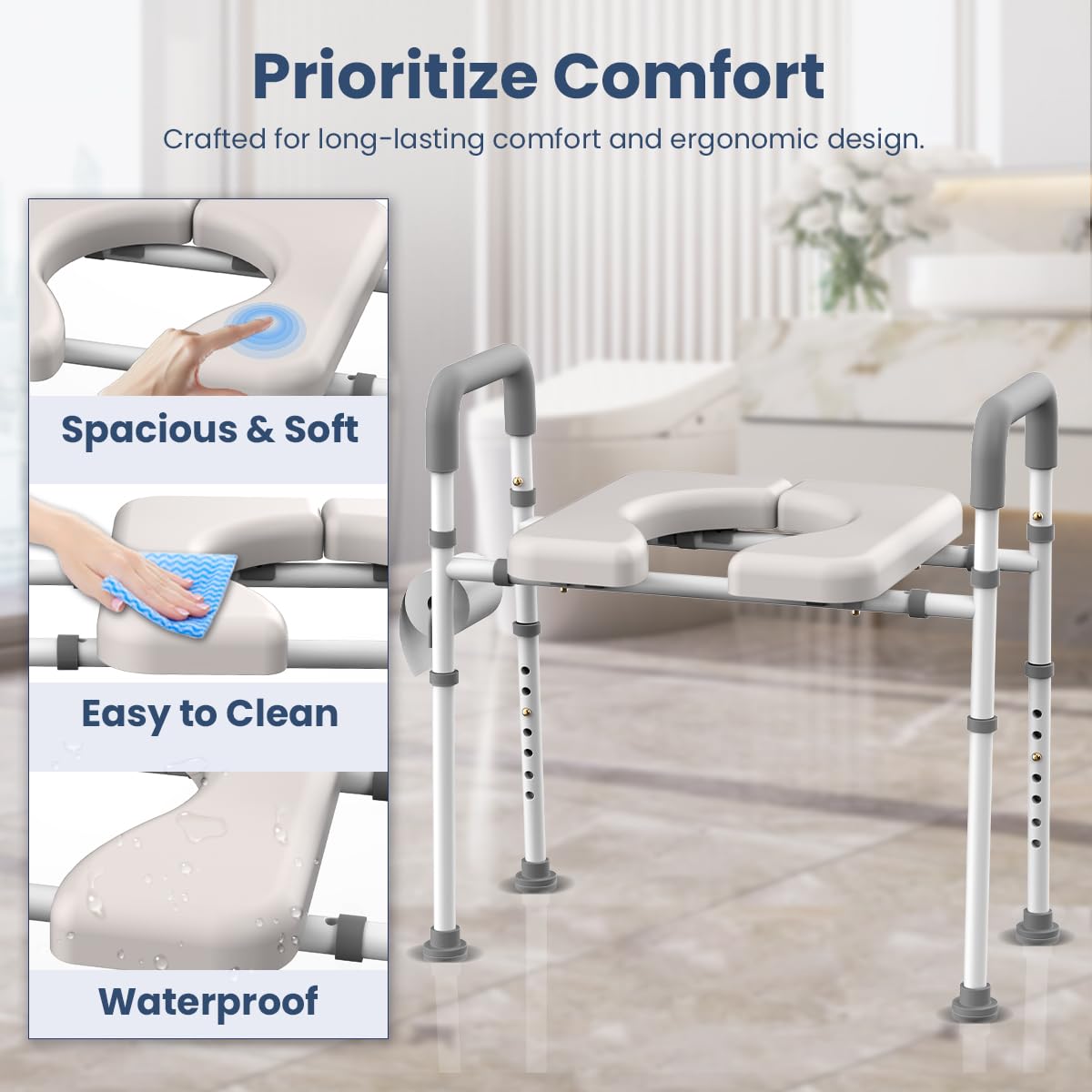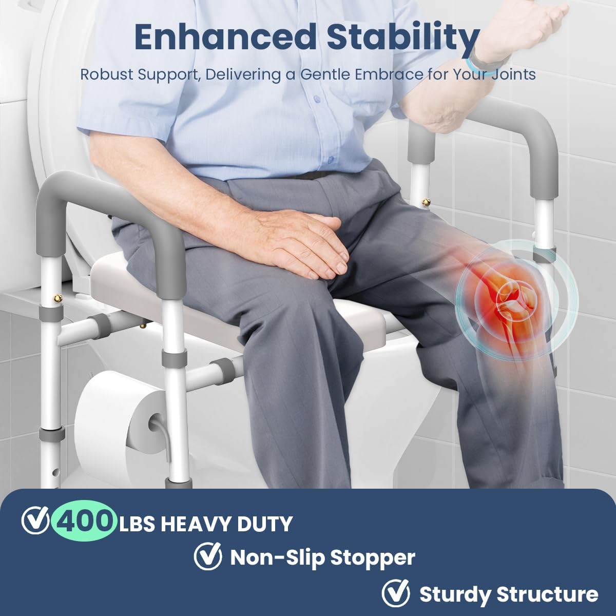 Sturdy & Stable: Our toilet seat risers for seniors is crafted from sturdy iron pipes, with a weight - bearing capacity of up to 400 pounds. It serves as both a stable and secure frame and an elevated toilet seat, ensuring extremely safe usage.