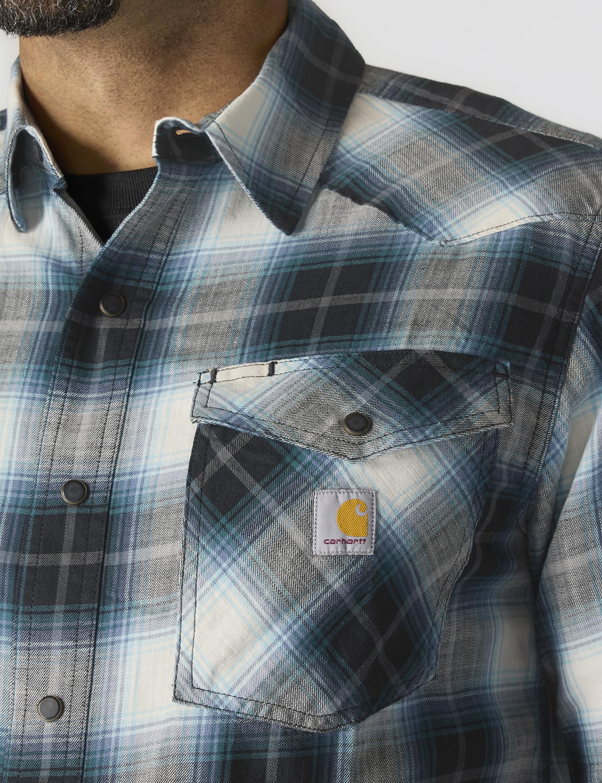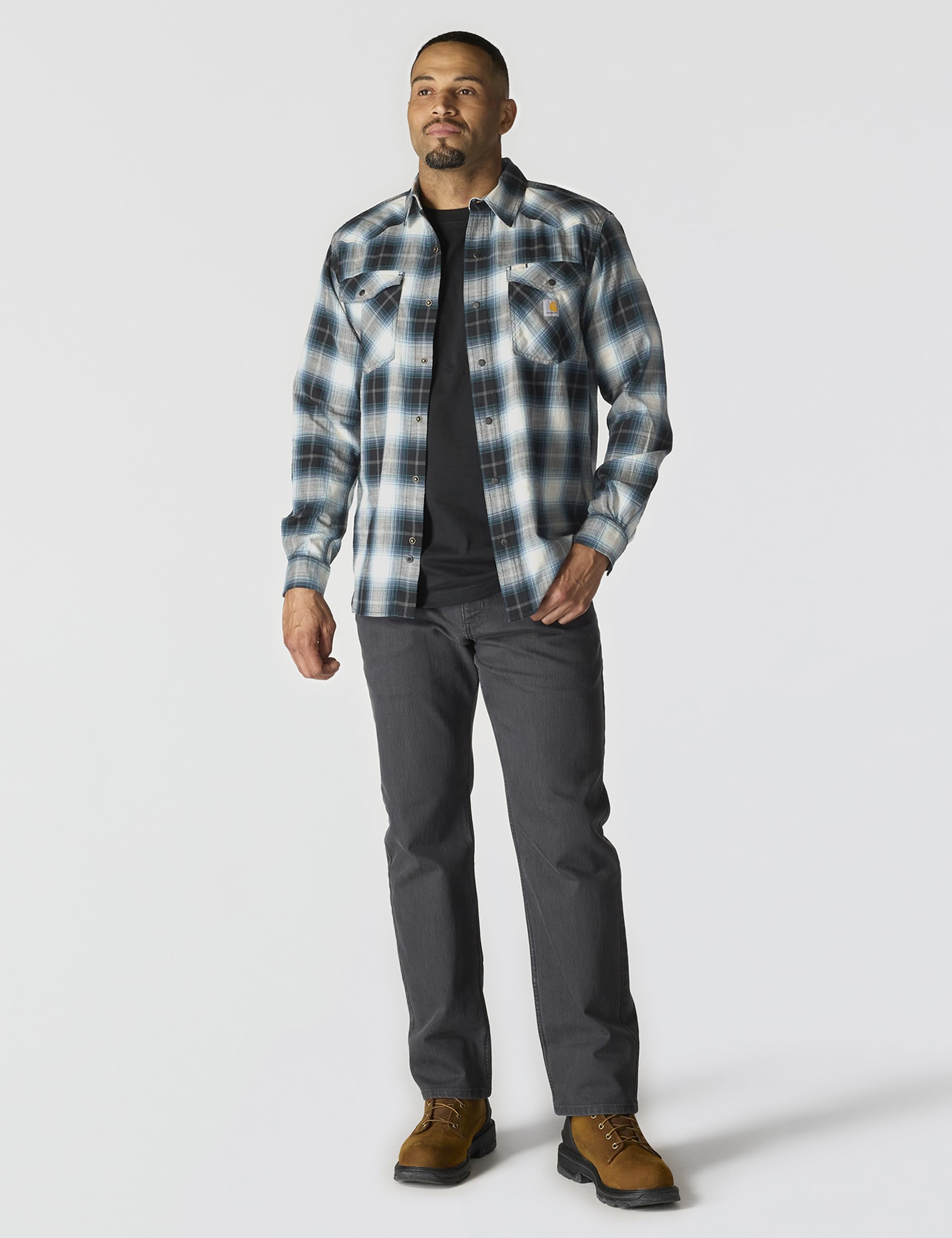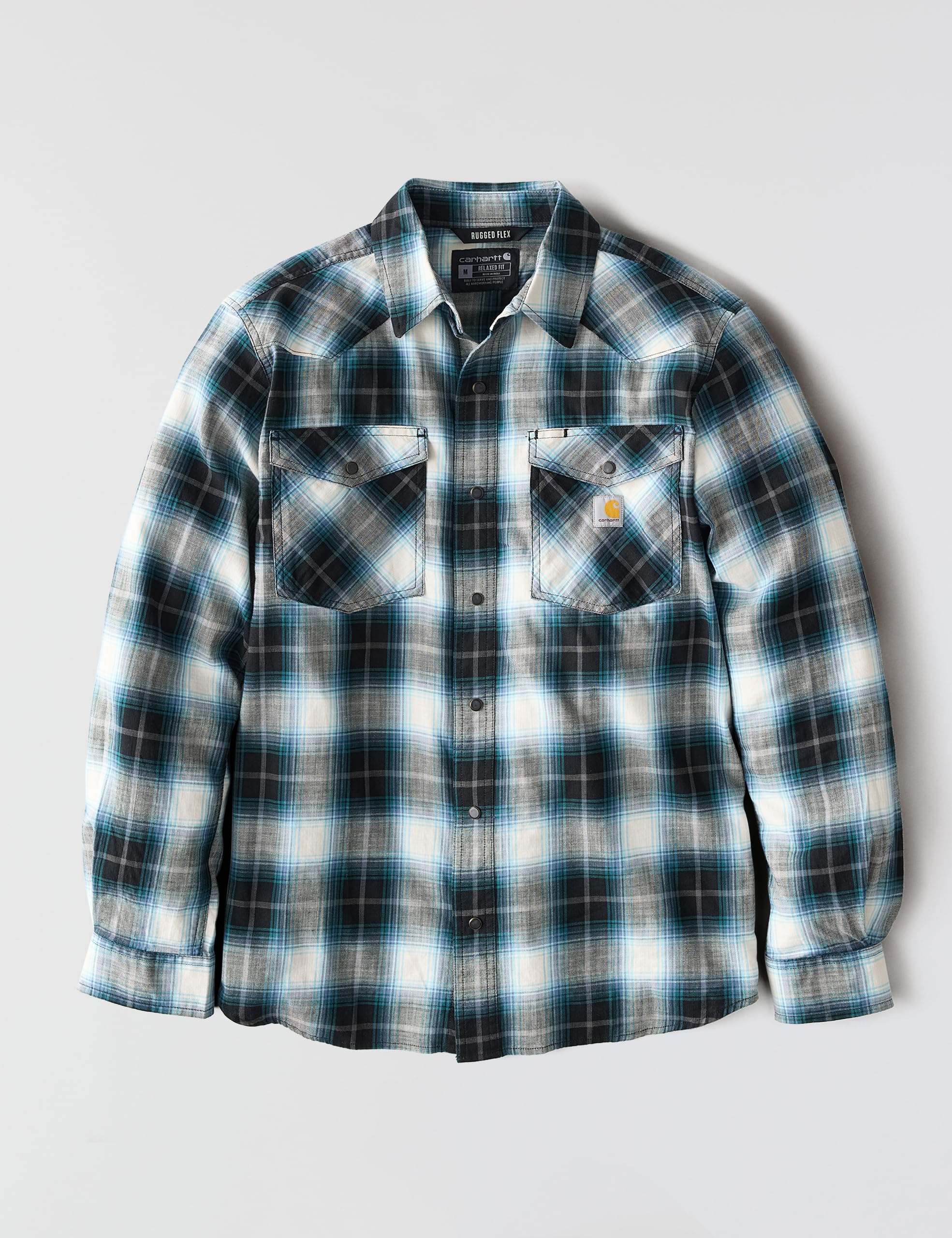 Description Made for unrestricted movement and cut to be worn tucked or untucked, this men's Carhartt snap-front plaid shirt features a lightweight cotton blend with just the right amount of stretch. A relaxed fit offers a little extra room to bend and move.
