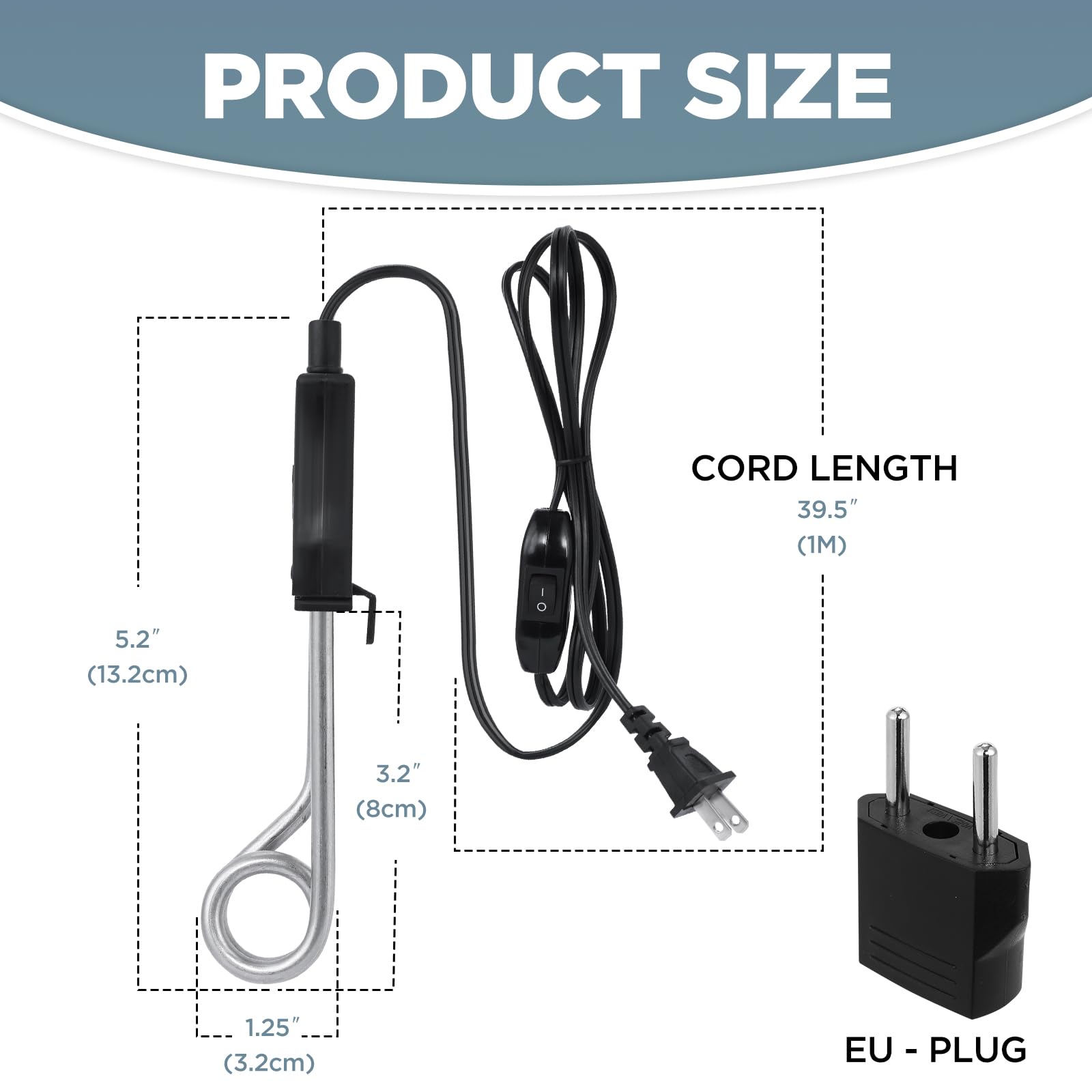 Portable stainless steel immersion heater – Premium-grade and highly efficient immersion water heater electric with a 304 stainless steel heating tube to quickly heat up water, coffee, milk, tea, or any other drink. Portable and easy to fit in a backpack, travel bag, or purse.