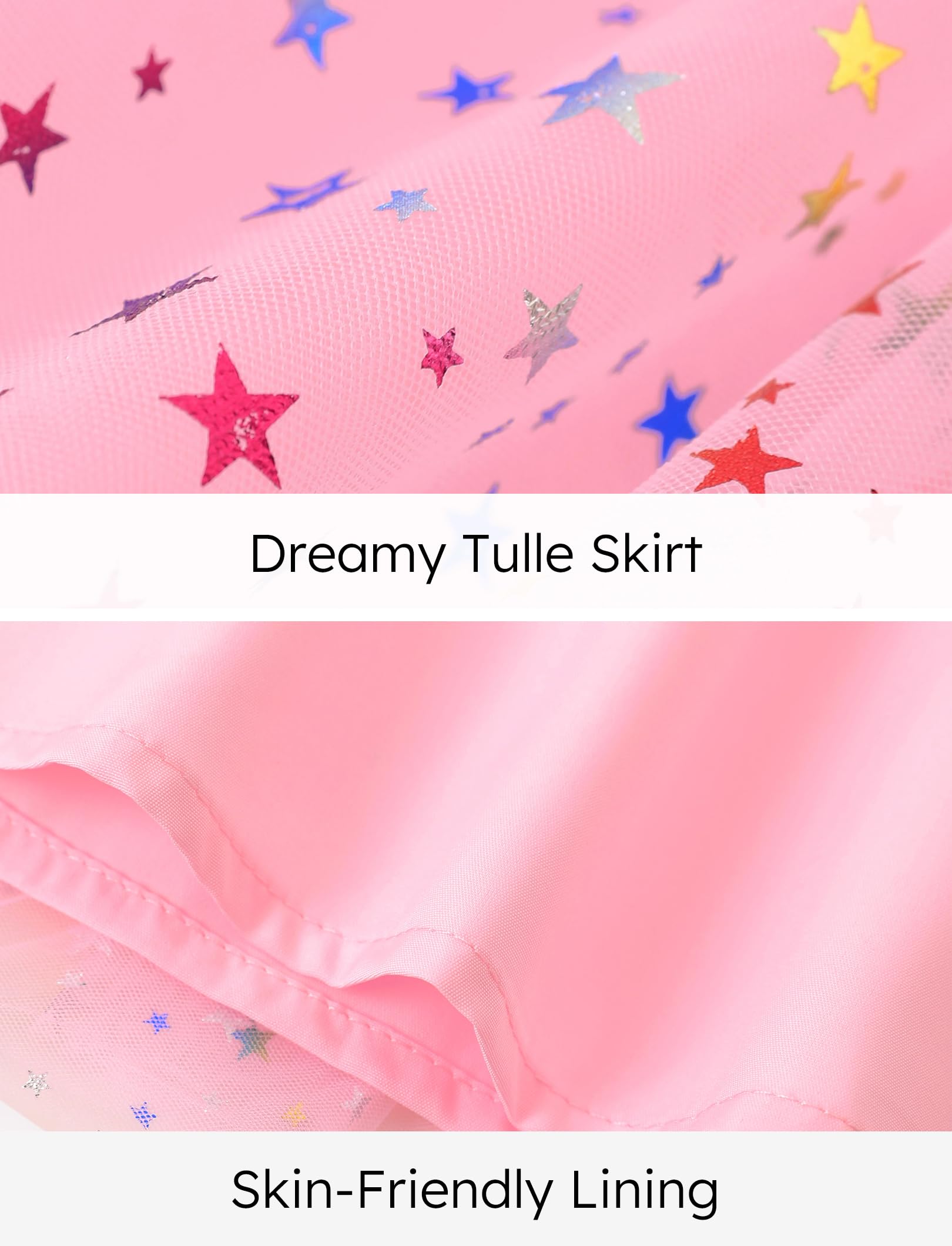 T-shirt + gauze skirt set version, shoulders with gauze flanged sleeve design, belt is blingbling rubber; The blouse is made of 220G milk silk fabric with IP pattern printing, and the skirt is colorful love net yarn + lining fabric design, which is sweet and lovely.