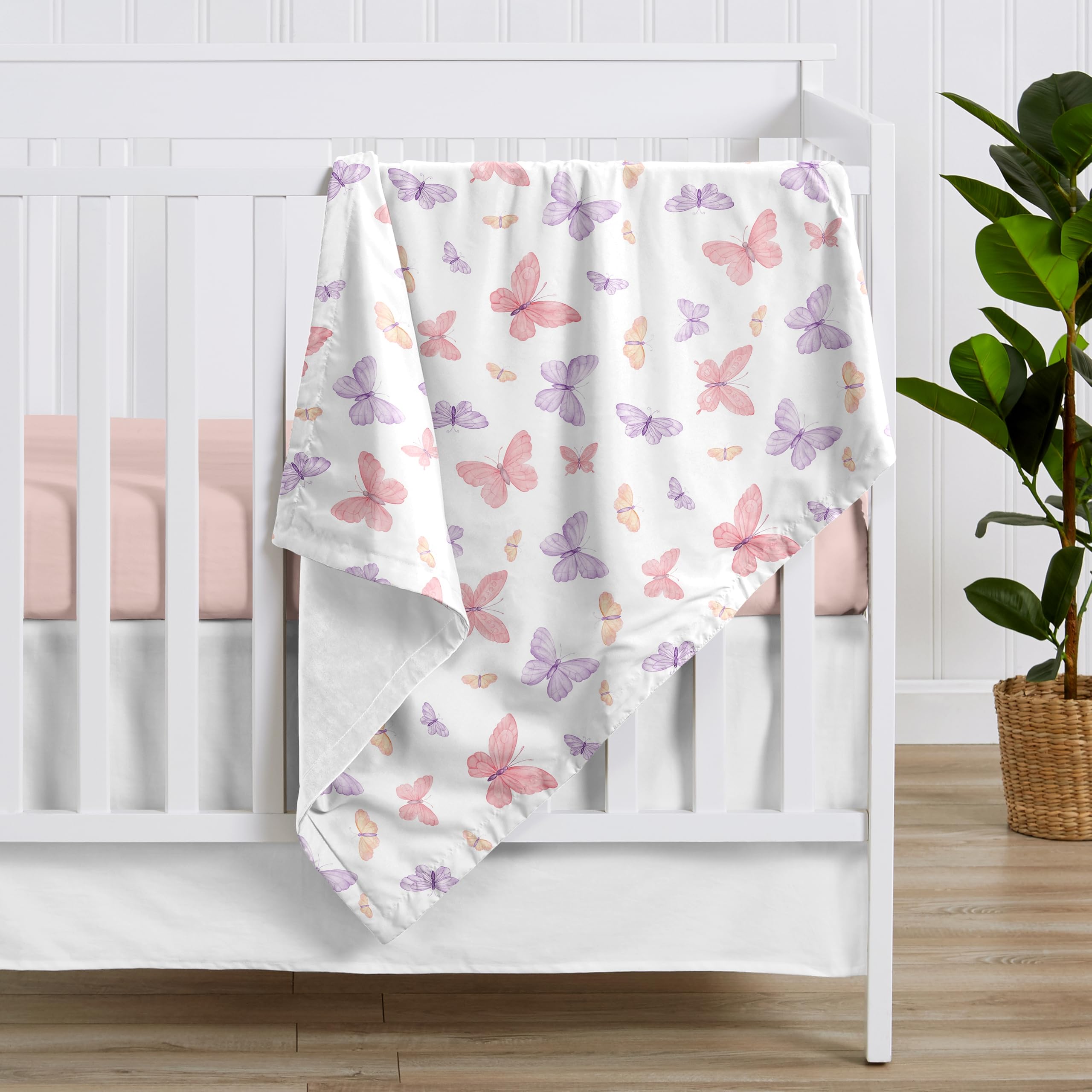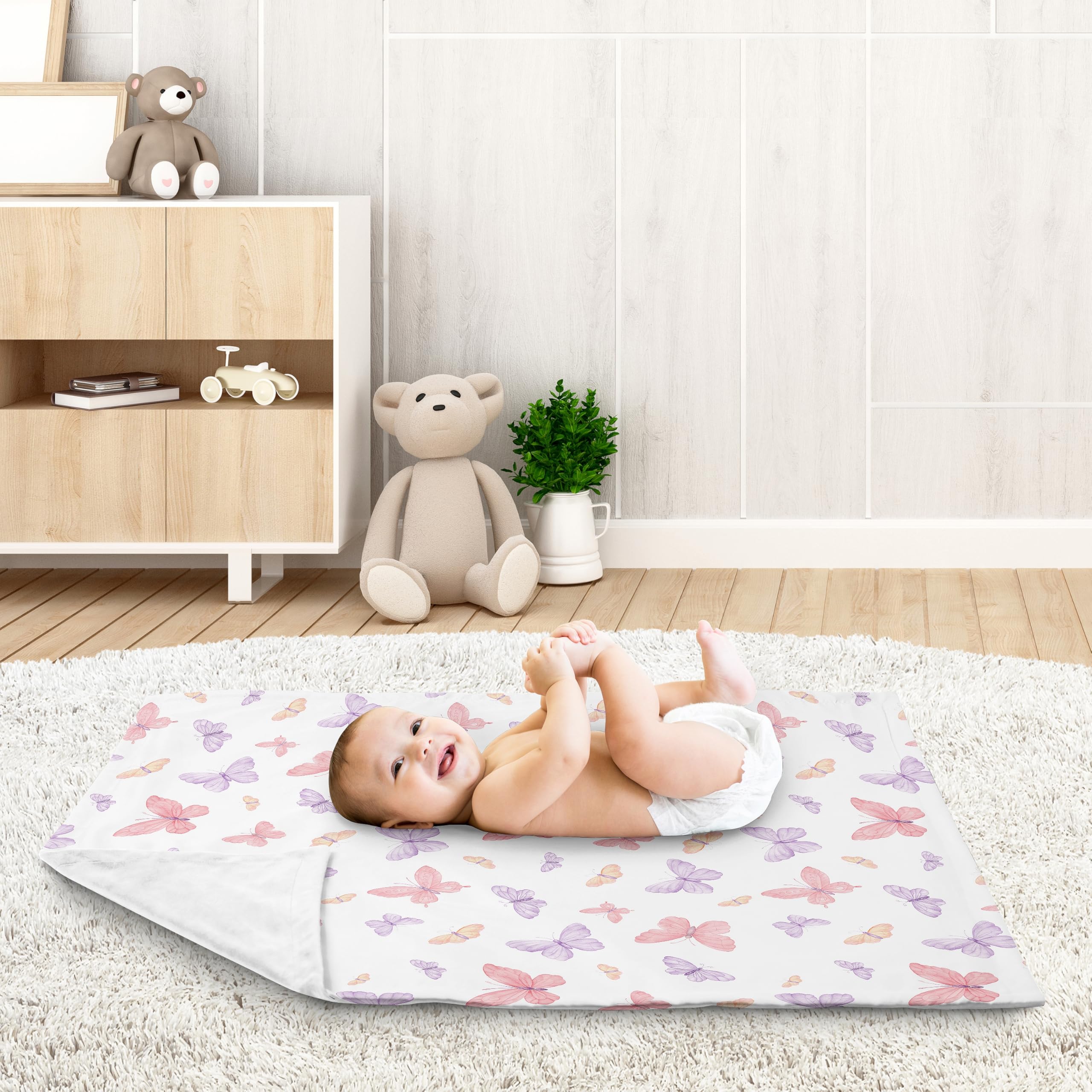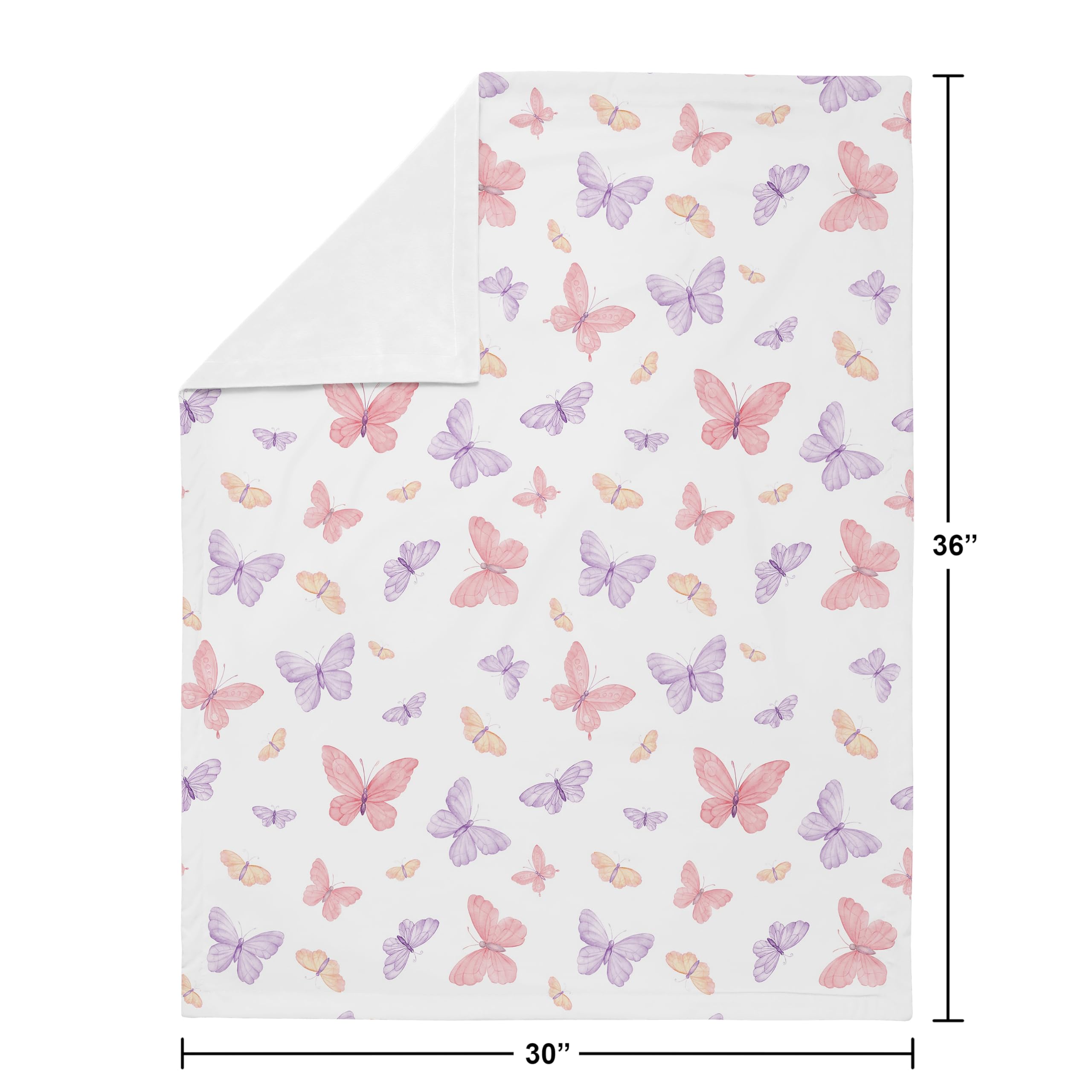 This baby security blanket is designed using a blush pink, lilac, purple lavender and yellow shabby chic, colorful, pastel, watercolor, butterfly pattern and reverses to a soft white minky.