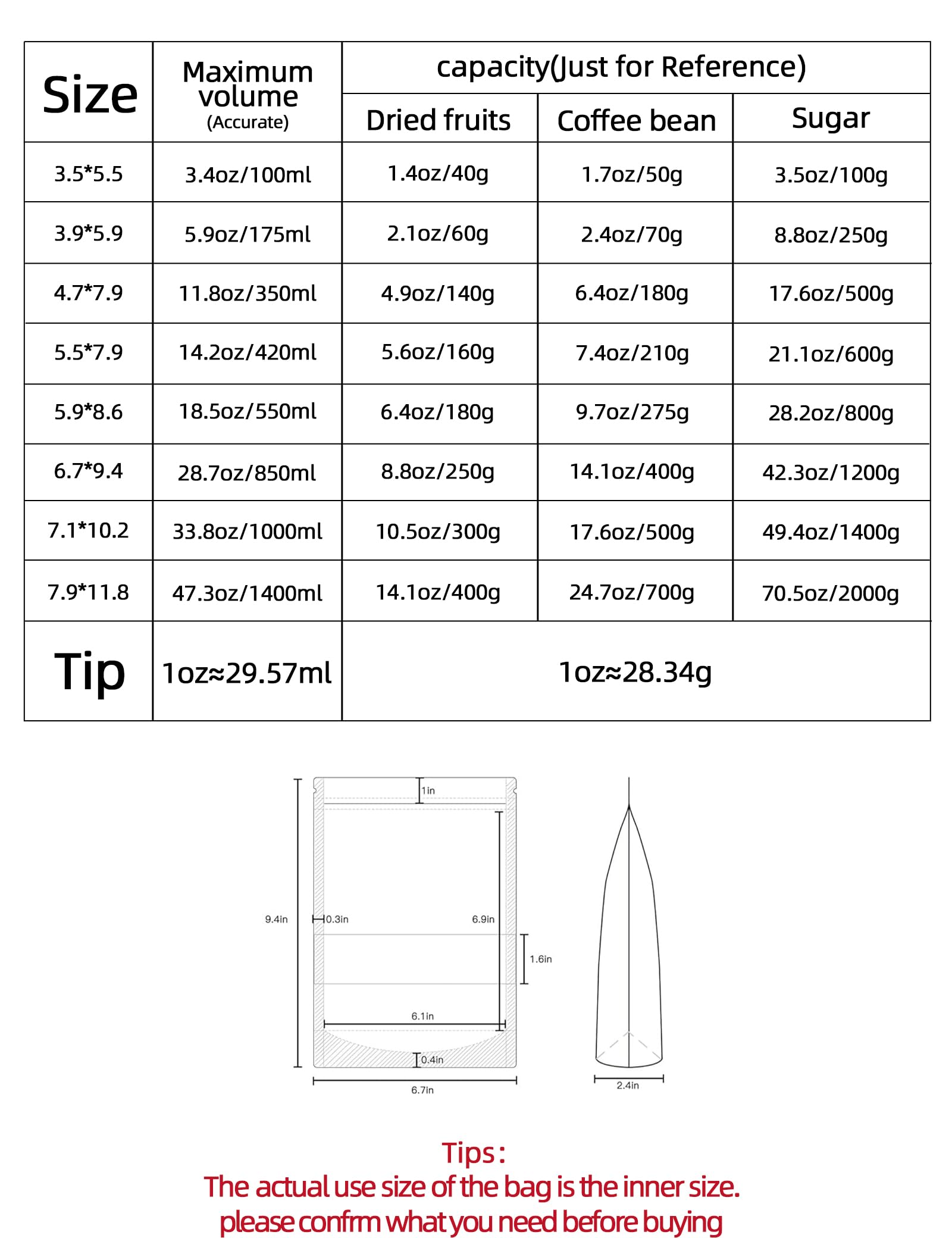 【Quantity & Material】Package include 100 pieces black kraft stand up pouches. Outer dimension:6.7*9.4 inch,Inner dimension:6.1*6.9inch; Made from food grade kraft paper and plastic, which is odorless, reusable and moisture proof, keeps your products freshness.Practical bags for packing product.