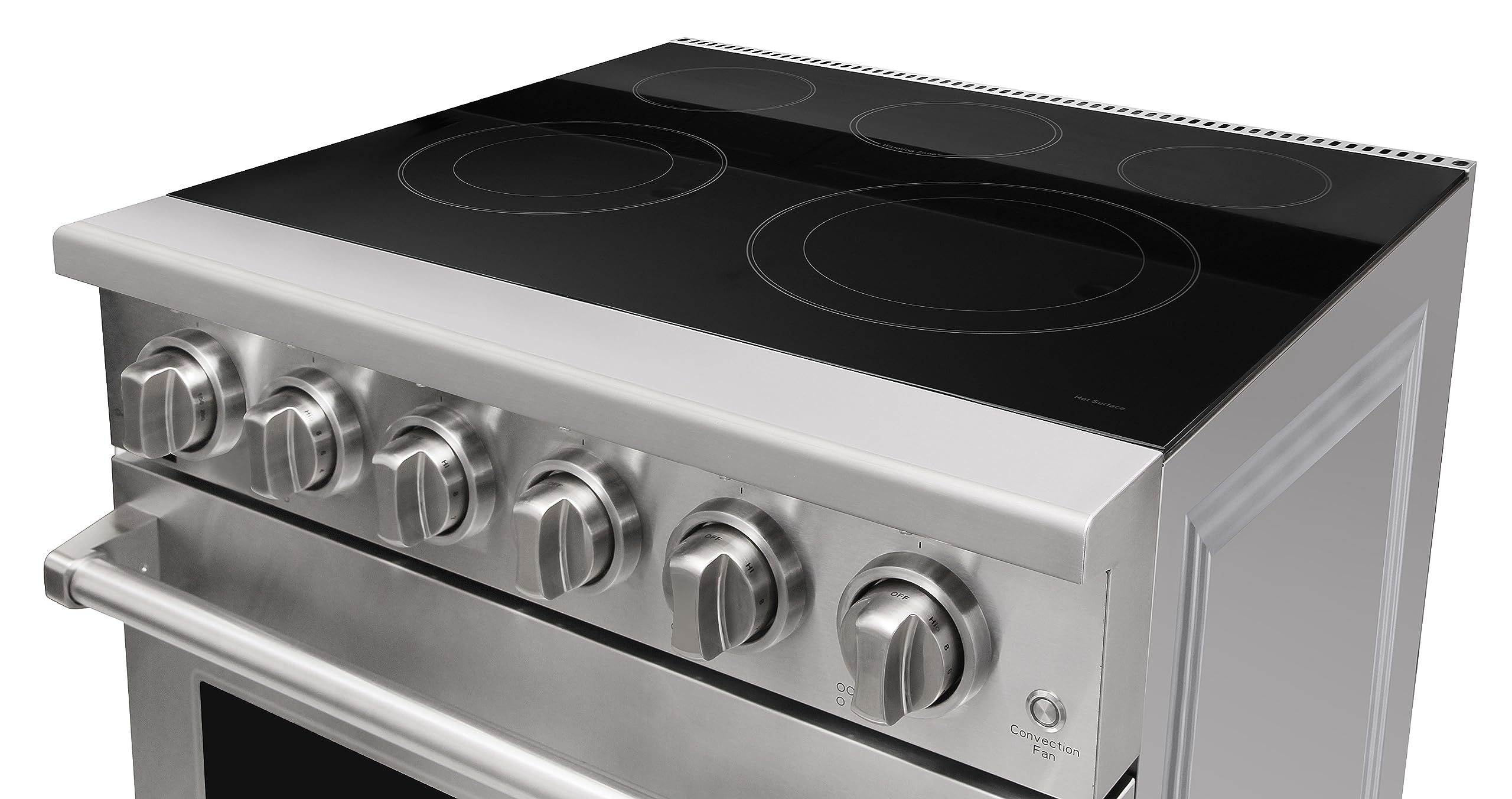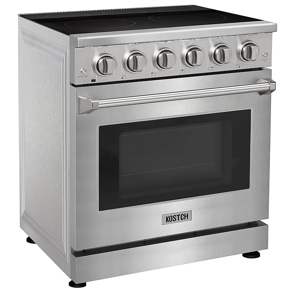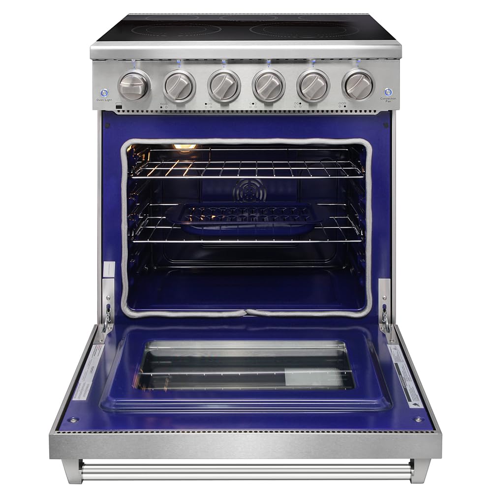 The 30 inch freestanding professional electric range features a black polished plate glass-ceramics cooktop that is very easy to clean. The electric range's sleek and modern design enhances the aesthetics of your kitchen, adding a touch of elegance to your cooking space.